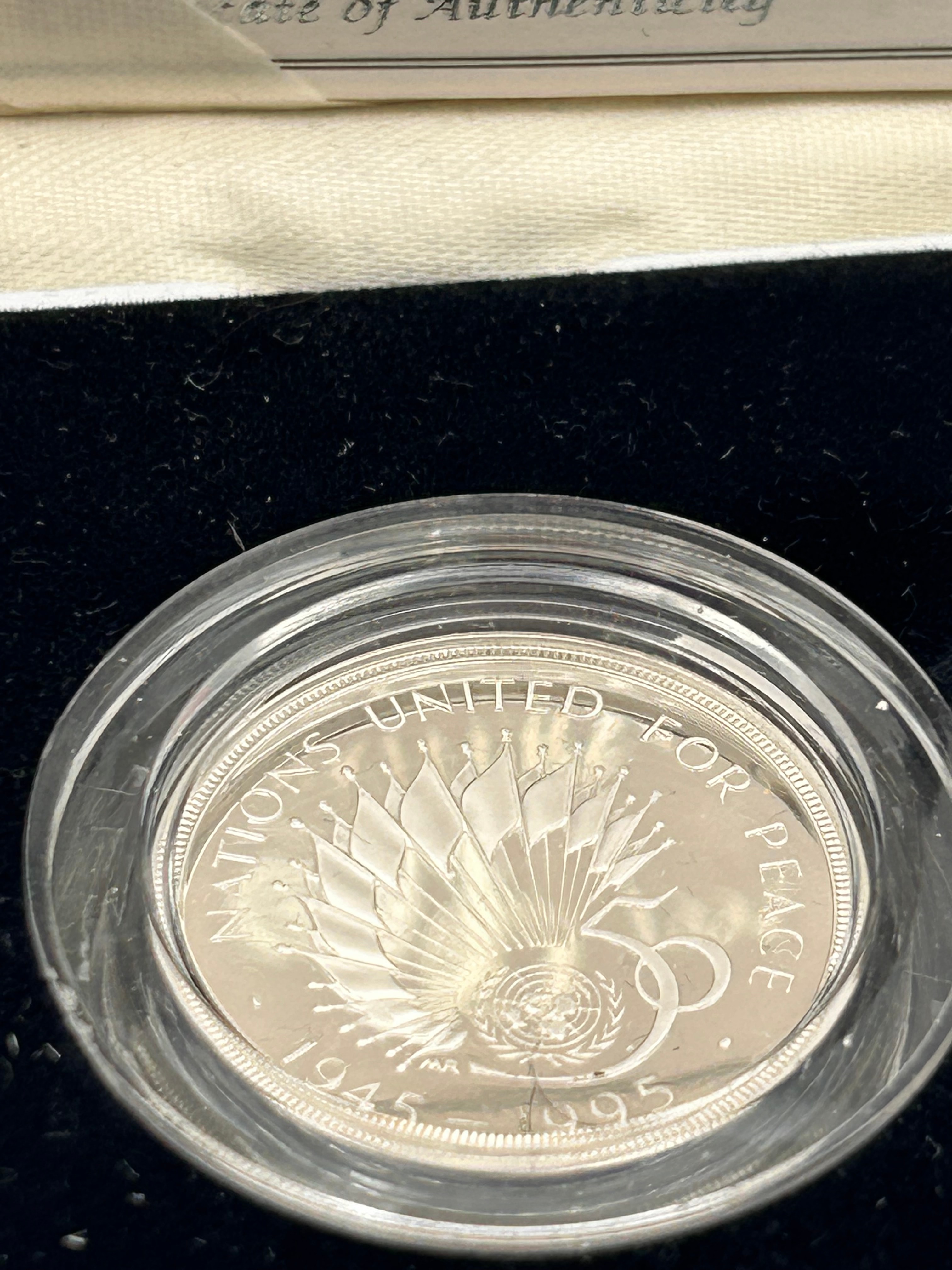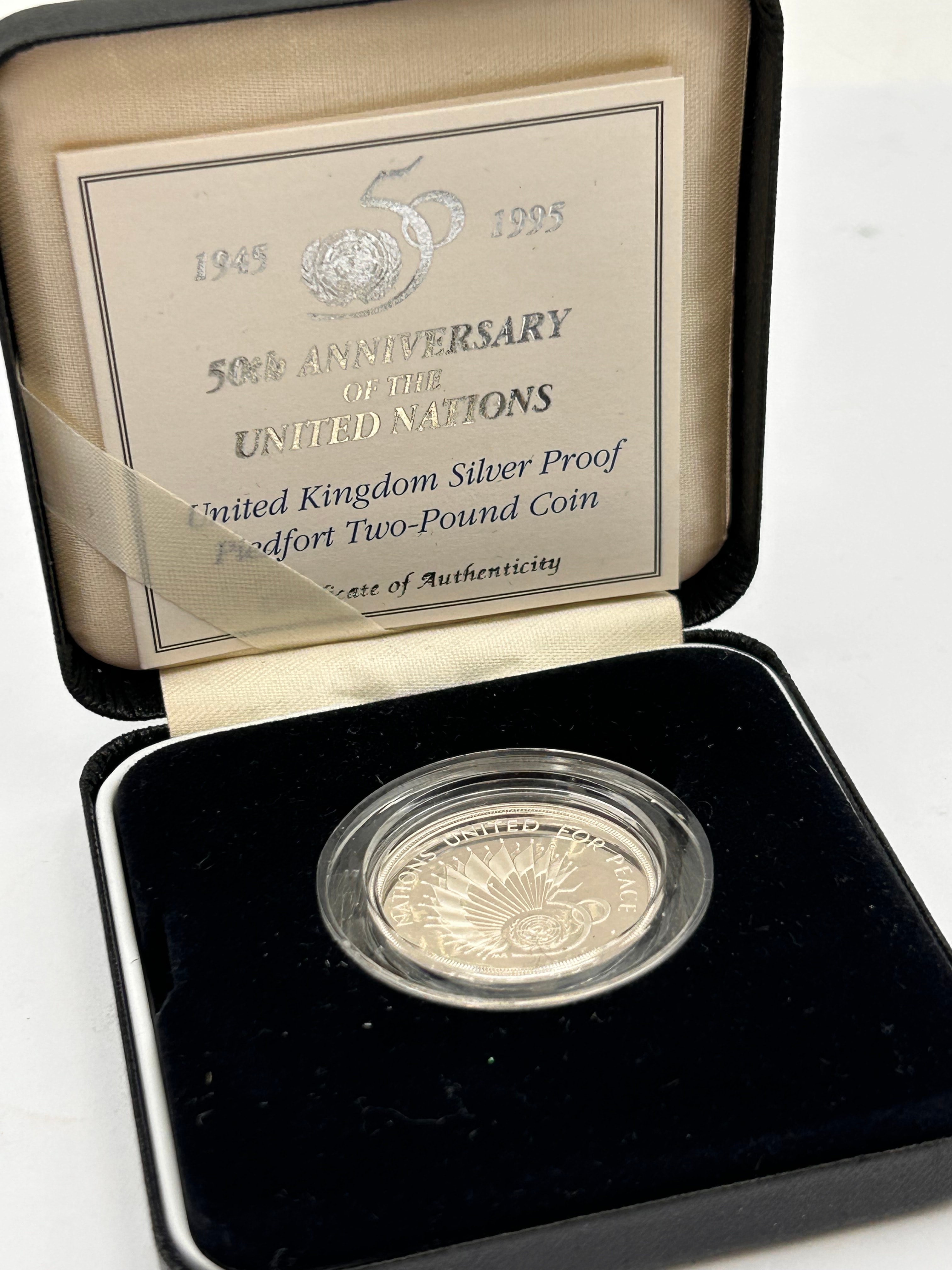 A United Kingdom Silver Proof Piedfort Two-Pound Coin, commemorating the 50th Anniversary of the United Nations (1945-1995). The coin is presented in its original black, velvet-lined presentation box, protected within a clear capsule. It is accompanied by a certificate or informational card confirming its “Silver Proof” status and bearing the text “50th ANNIVERSARY OF THE UNITED NATIONS” and “United Kingdom Silver Proof Piedfort Two-Pound Coin.” The visible obverse features a design of fanning flags and the United Nations logo, encircled by the text “UNITED FOR PEACE” and “NATIONS,” with the dates “1945” and “1995” flanking a stylized “50.”