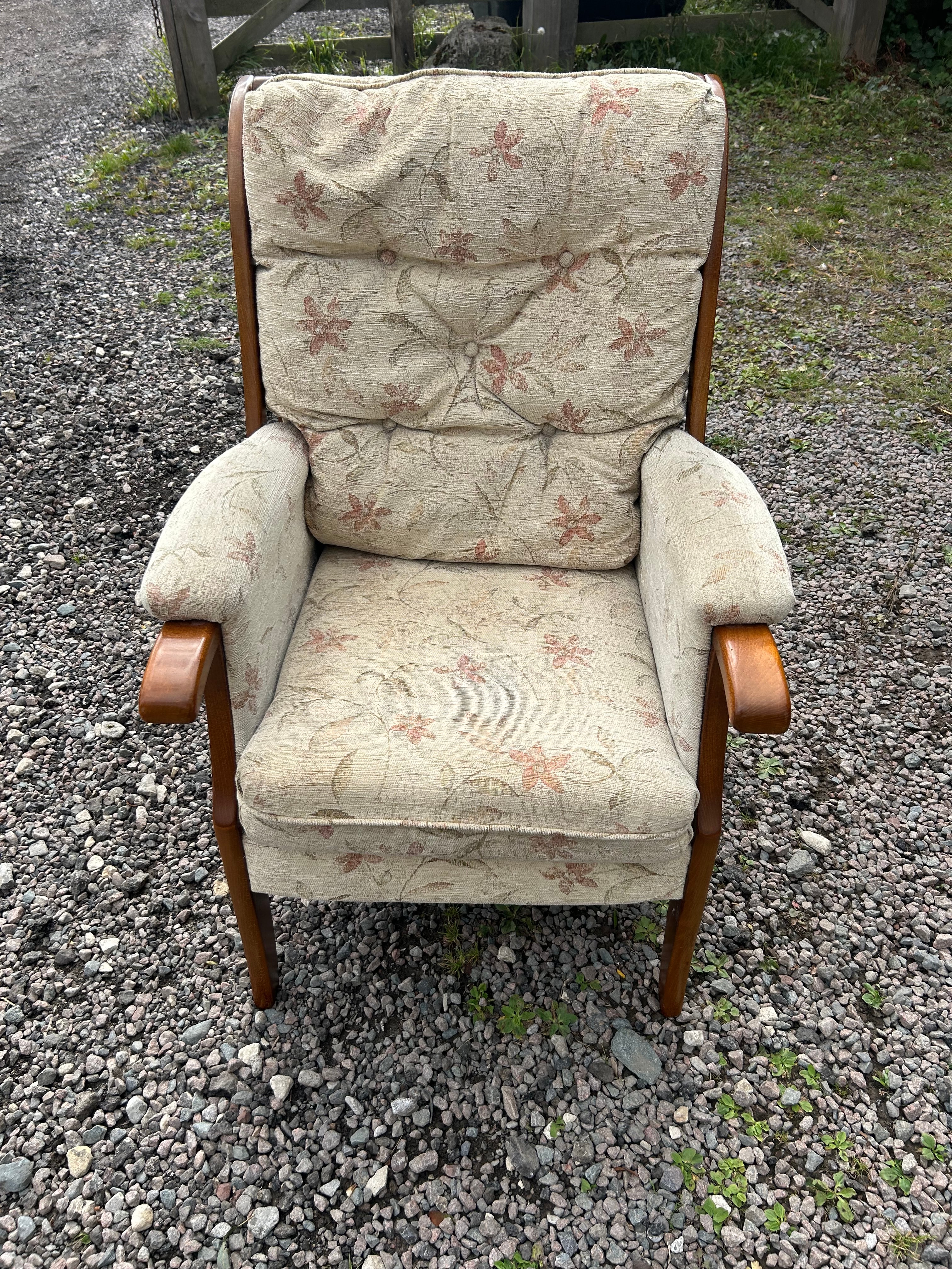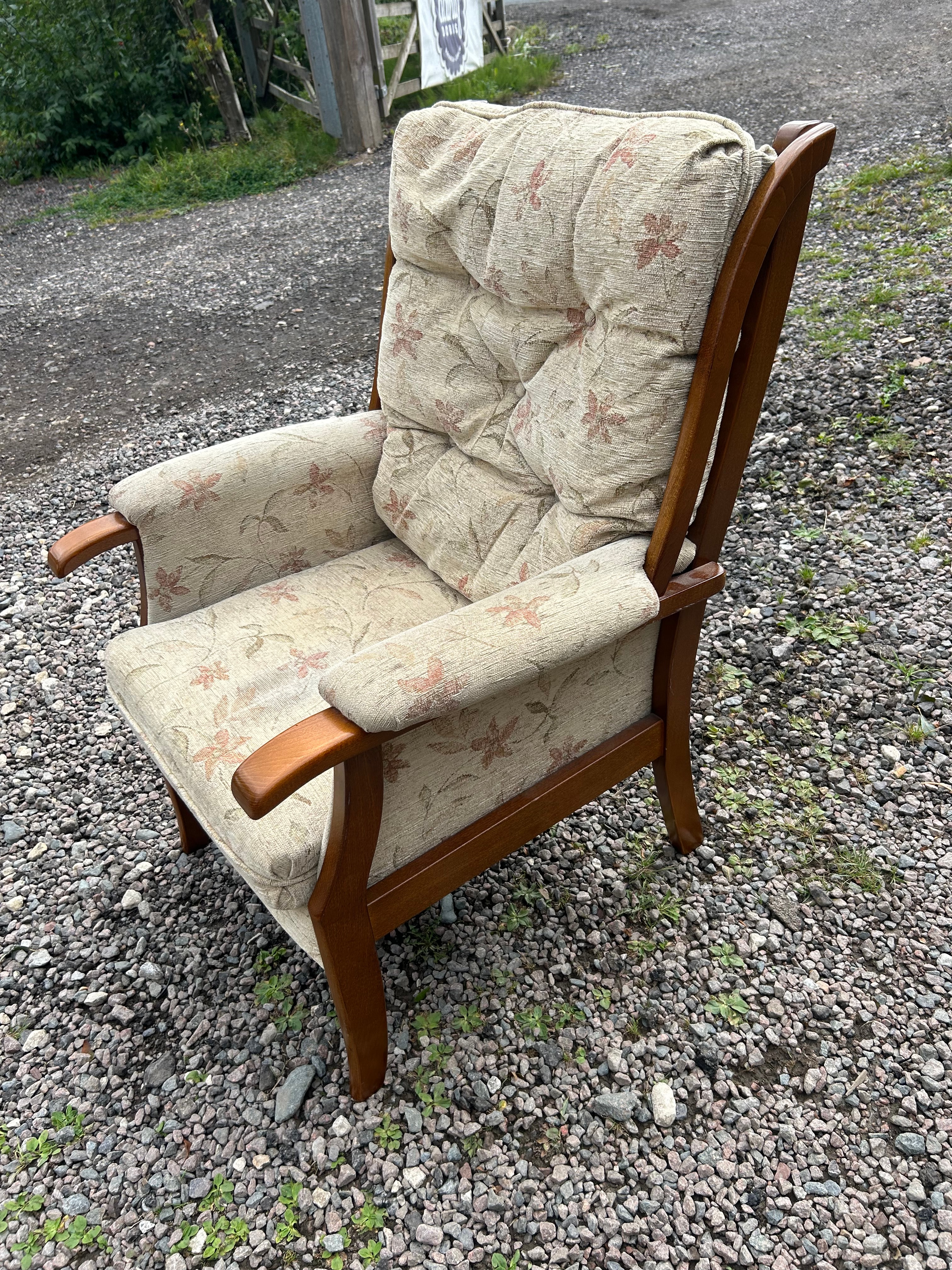 A Cintique Teak Mid-Century lounge armchair, featuring a high-back design with a visible stained wooden frame and solid wood armrests. The chair is upholstered in a light fabric with a repeating floral pattern in muted orange and green tones, and the back cushion is tufted. The apparent period is mid to late 20th century.