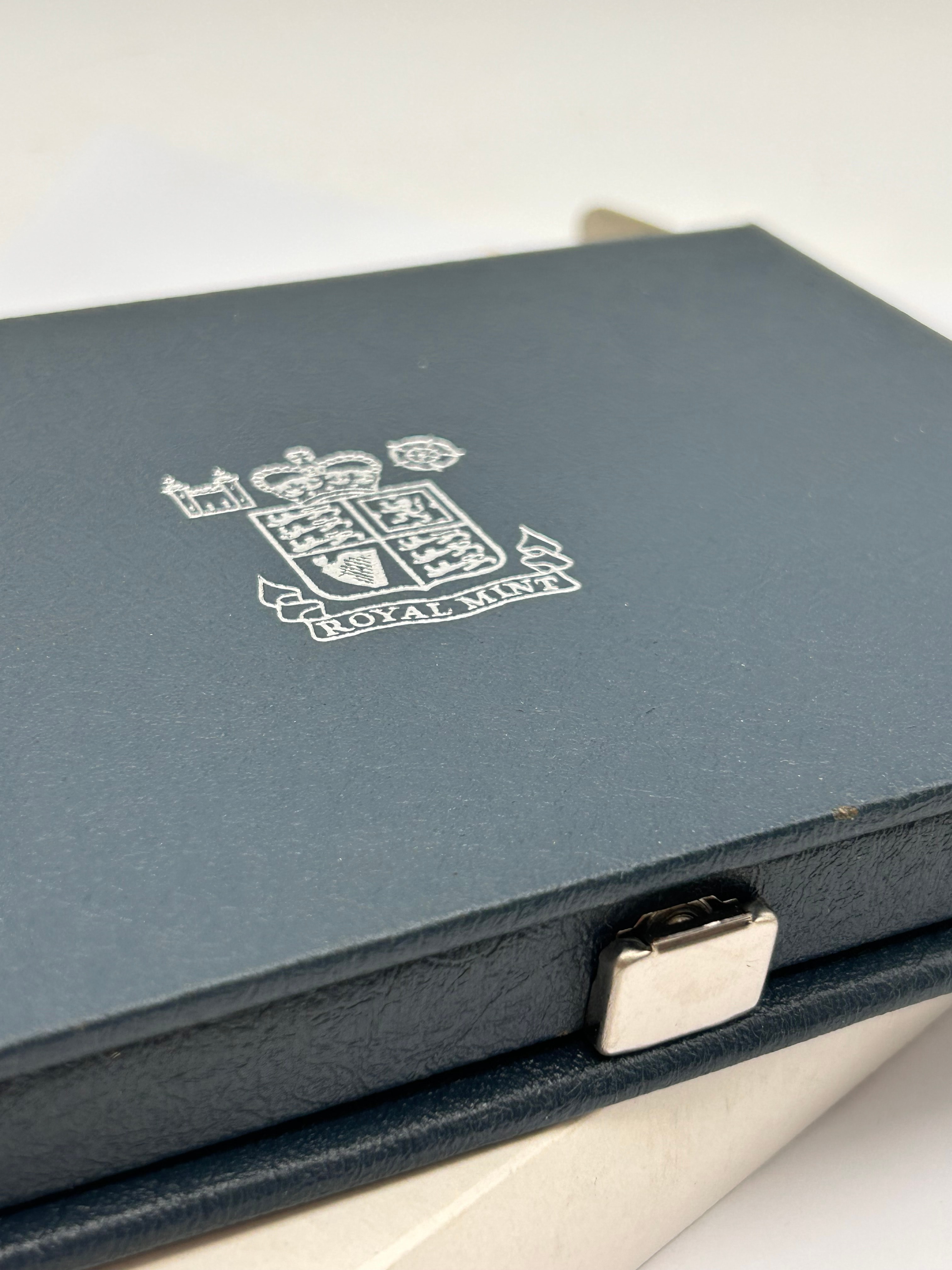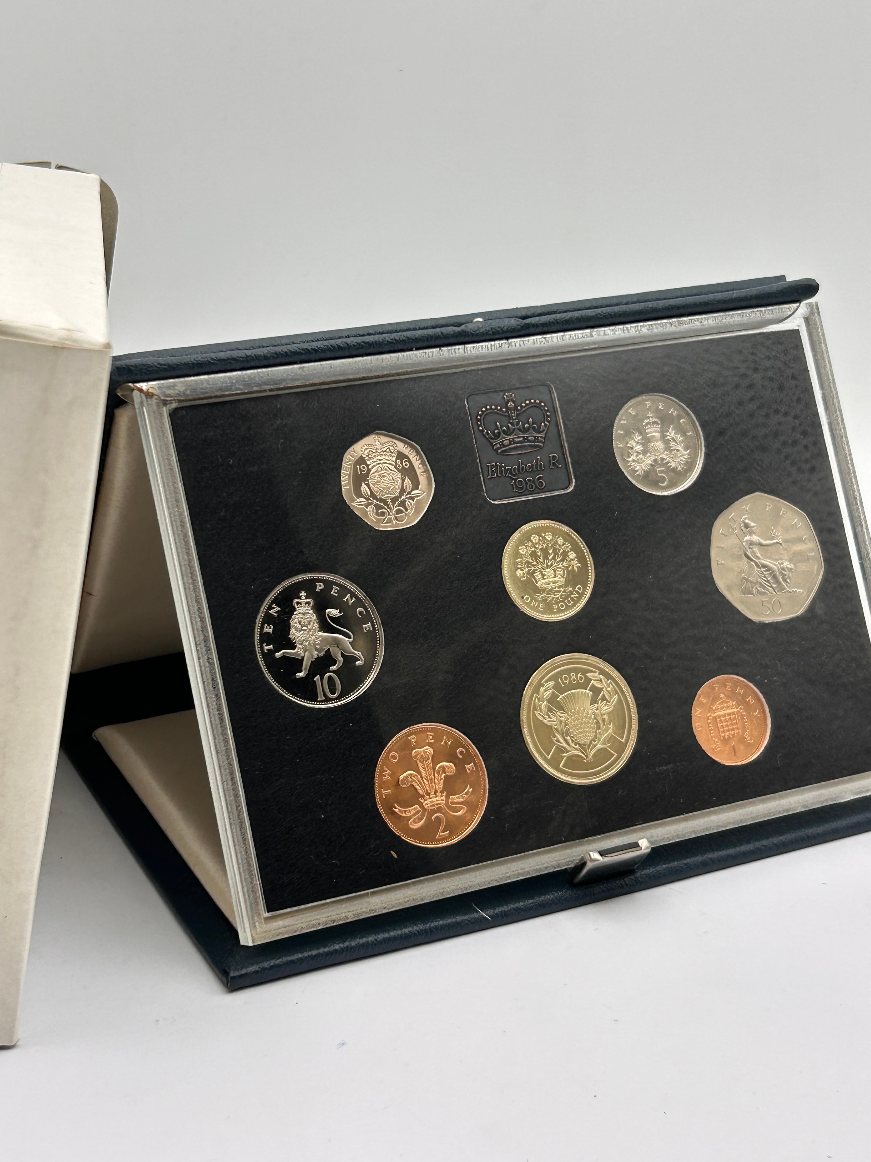 A 1986 Royal Mint United Kingdom Queen Elizabeth II Proof Coin Set, comprising a set of eight coins presented in a dark blue, possibly leatherette, hinged display case with a metal clasp and a clear protective cover. The case lid features an embossed Royal Mint logo, including the Royal Arms and the text “ROYAL MINT”. Inside, the coins are set into a dark, fabric-lined insert. Visible coin denominations include One Pound, Fifty Pence, Ten Pence, Five Pence, Two Pence, One Penny, and a Half Penny, displaying dates of “1986” and royal insignia. The coins exhibit varying metallic compositions, including silver-toned, bronze-toned, and copper-toned finishes. A central plaque within the display also states “Elizabeth II 1986”.
