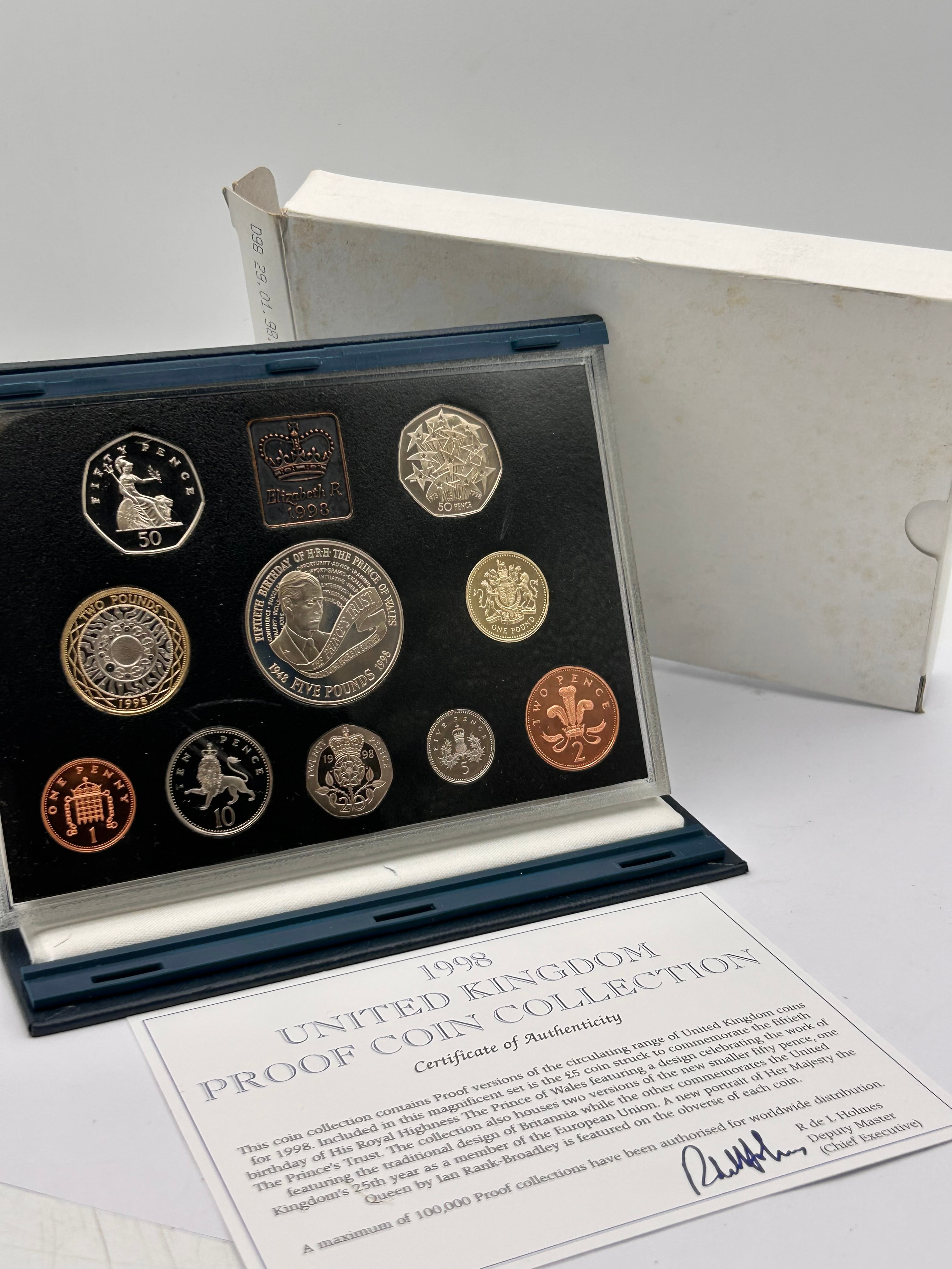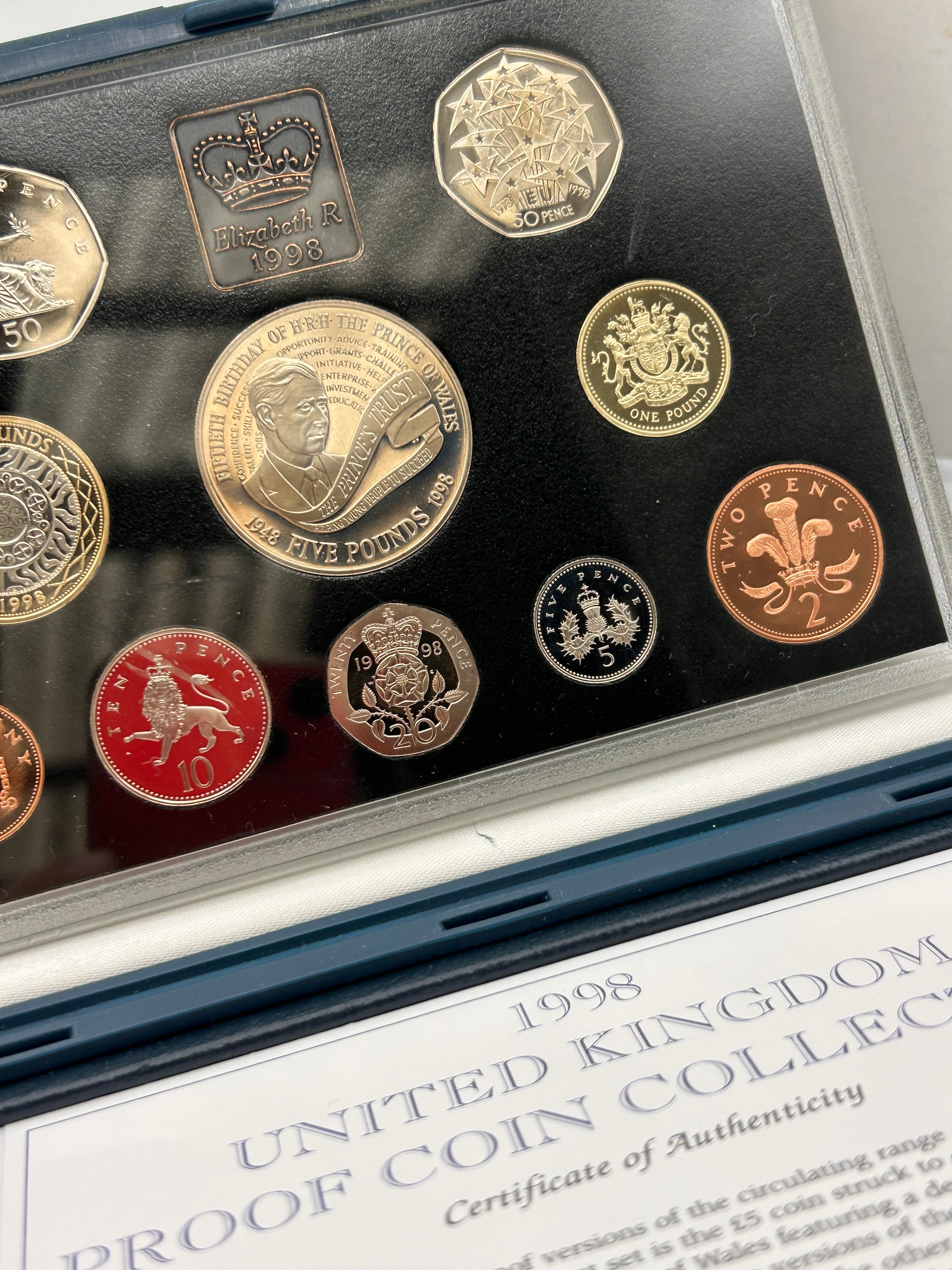 A Royal Mint 1998 United Kingdom Proof Coin Collection, presented in a clear and dark blue plastic display case. The set contains a collection of coins, all dated 1998, varying in denomination from 1p to £5, including 5p, 10p, 50p, £1, and £2. The coins exhibit various metallic compositions, including bi-metallic, gold-tone, silver-tone, and copper-tone. Visible markings feature portraits of Queen Elizabeth II and the Prince of Wales, heraldic designs, and text such as “Elizabeth R 1998,” “BRITANNIA,” and “FIFTIETH BIRTHDAY OF H.R.H. THE PRINCE OF WALES” on the large £5 coin. The collection is accompanied by a paper Certificate of Authenticity titled “UNITED KINGDOM PROOF COIN COLLECTION,” bearing a signature from a “Chief Executive.”