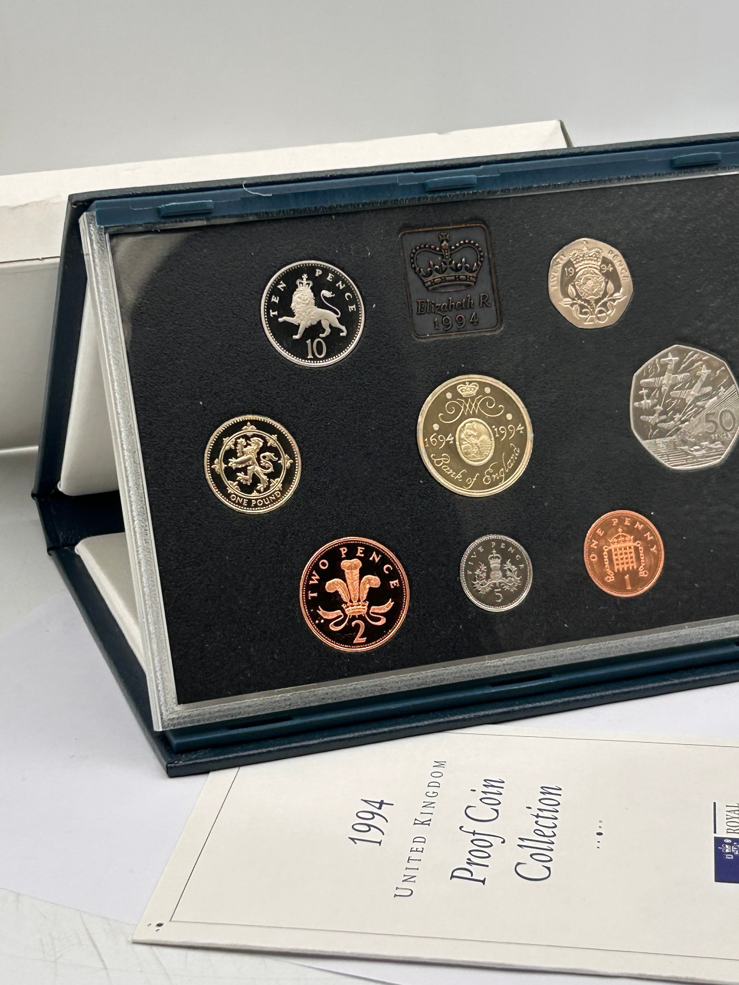 A 1994 Royal Mint United Kingdom 8 Coin Proof Set, presented in a dark blue hinged display case with a clear plastic cover. The collection features eight distinct numismatic pieces and a central commemorative plaque. The set includes British coins in various metallic compositions and denominations, such as One Pound (depicting a lion), Ten Pence, Two Pence, Five Pence, One Penny, Twenty Pence, and Fifty Pence. A prominent gold-colored coin is marked “Bank of England 1994” with an effigy of “Elizabeth R,” whose name also appears on the square plaque along with the year “1994.” The coins display typical British royal and national symbols.
