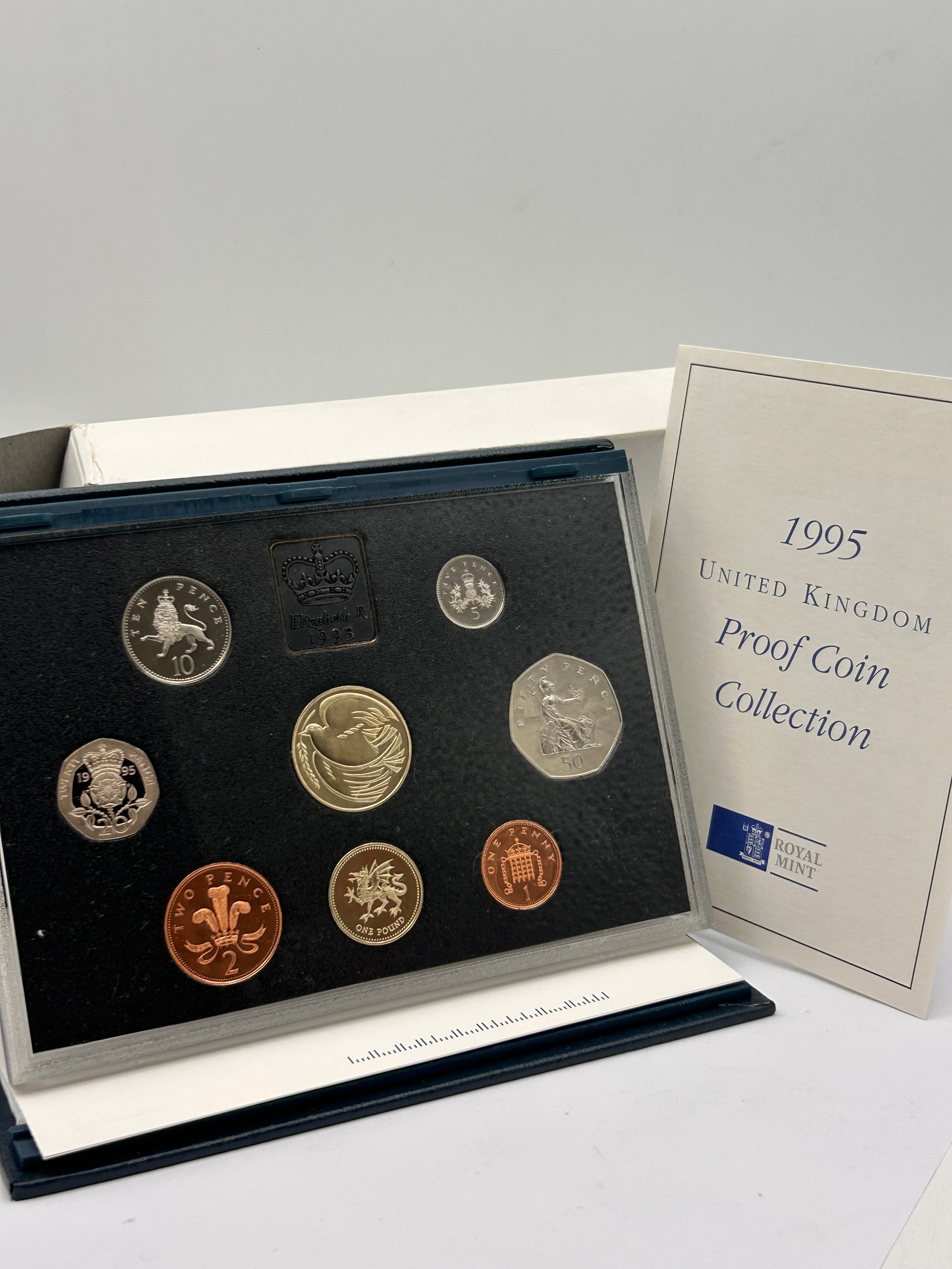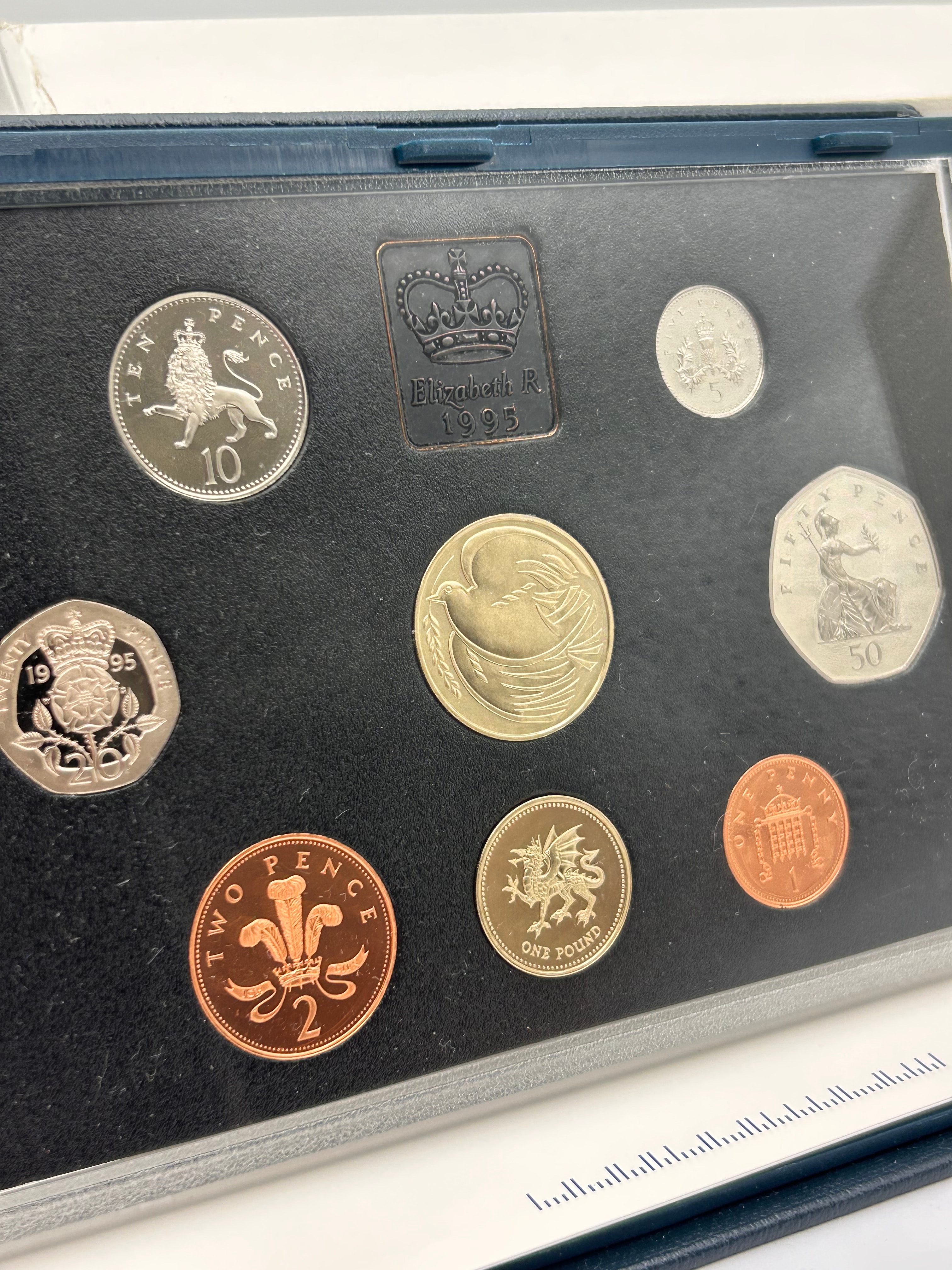 A 1995 Royal Mint United Kingdom Proof Coin Collection, presented in a dark blue hinged case with a clear protective cover, accompanied by a matching booklet. The collection comprises at least eight modern British coins of varying denominations, crafted from mixed metals including copper, silver-toned, and gold-toned alloys. Designs include a lion, Britannia, a bird, and a dragon. A central plaque within the display is marked “Elizabeth R. 1995” beneath a crown.
