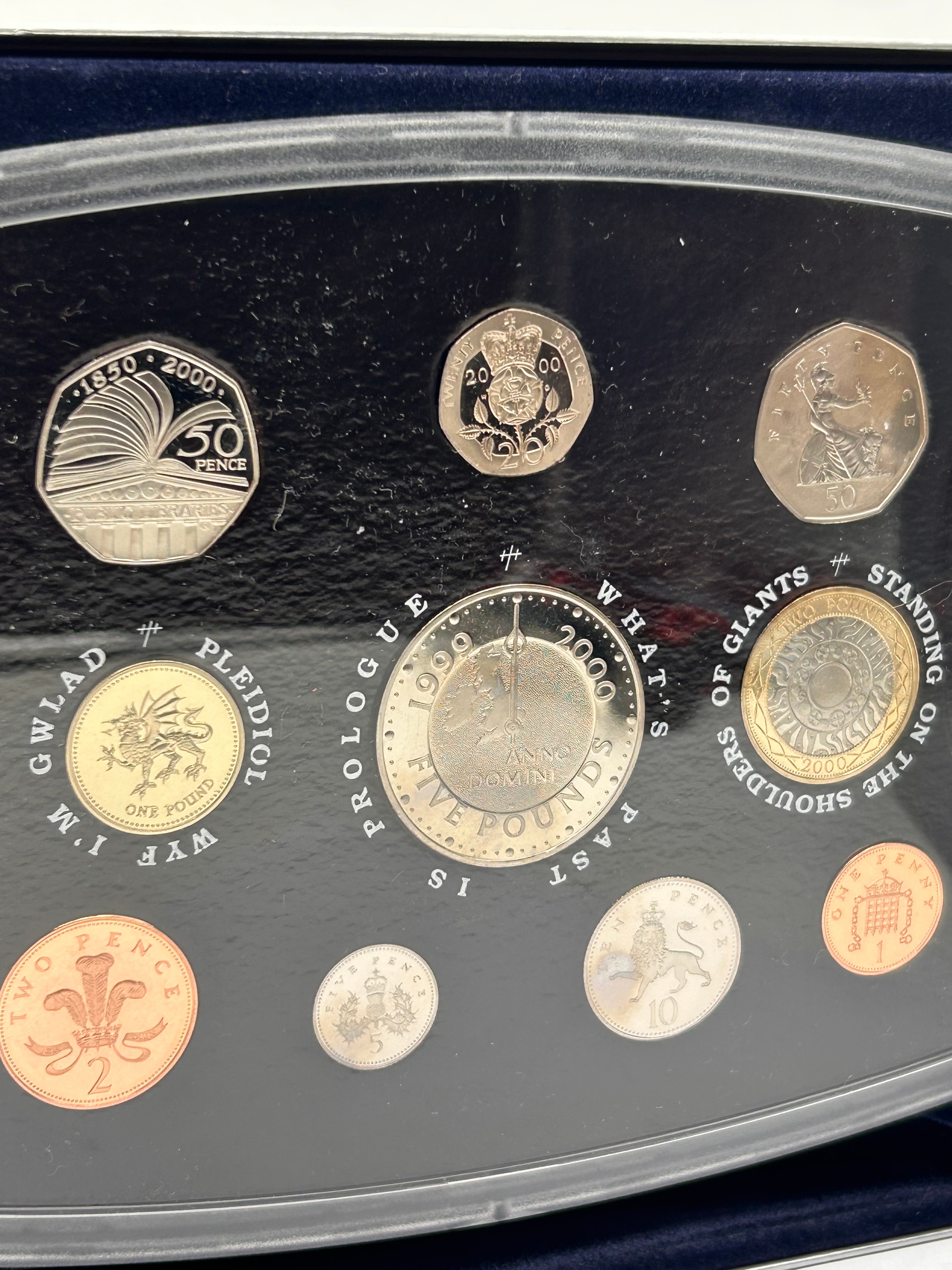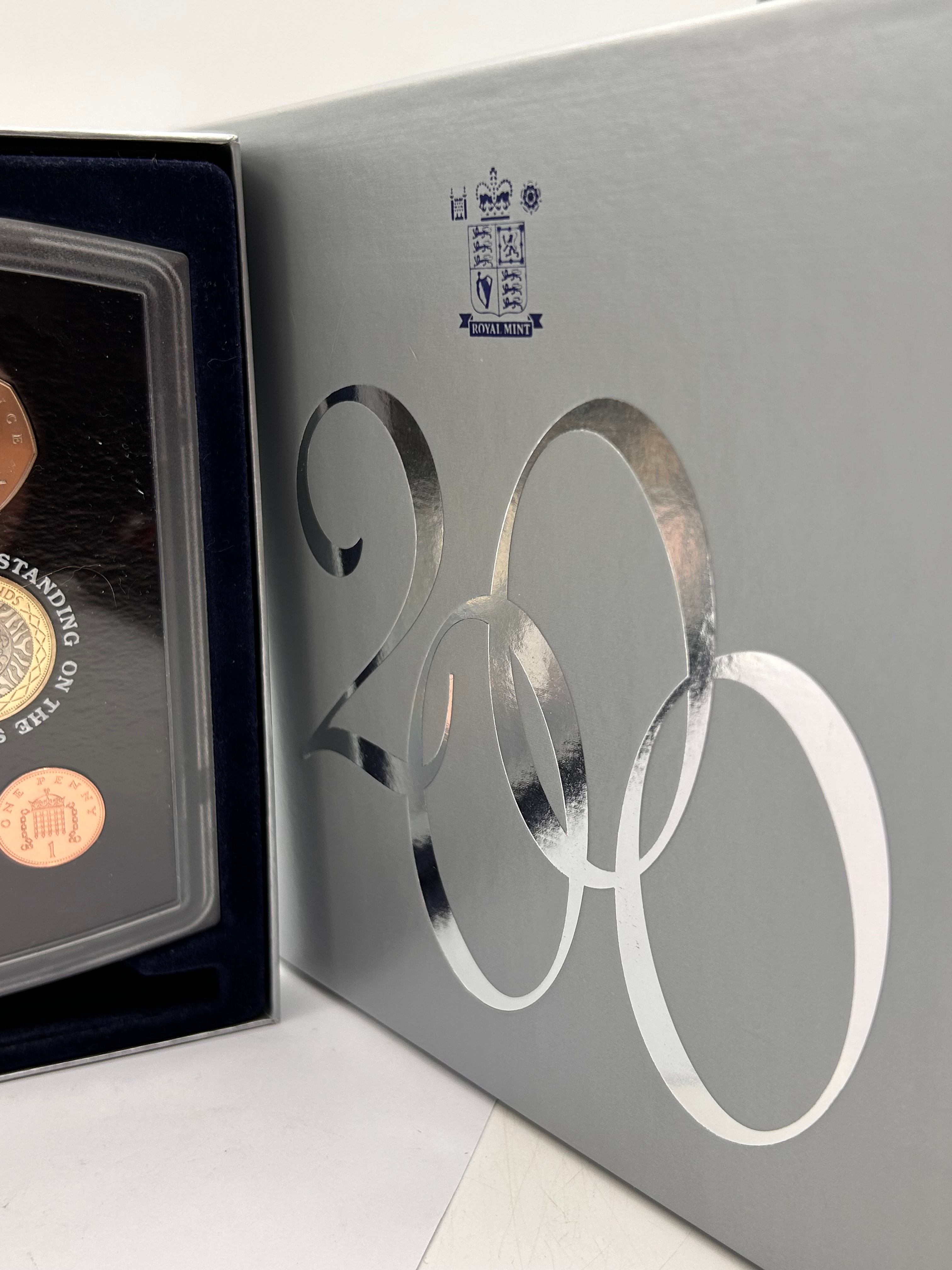 A 2000 Royal Mint United Kingdom Millennium 10 Coin Proof Set. Presented in a black molded display tray under a clear protective cover, housed within a silver-grey slipcase featuring the “ROYAL MINT” logo and a large, stylized “2000” in a reflective finish. The set contains ten uncirculated or proof-quality coins: a bi-metallic Five Pounds coin inscribed “ANNO DOMINI 1999 2000”, two One Pound coins (one bearing a Welsh dragon with the motto “GWLAD PLEIDIOL WYF I”), three Fifty Pence coins (one depicting an open book marked “1850 2000”, another with a figure and text “WHAT’S STANDING ON THE SHOULDERS OF GIANTS”), a Twenty Pence, a Ten Pence, a Two Pence, and a One Penny coin. The coins are composed of various metals including bi-metallic, silver-toned, and copper-toned alloys.