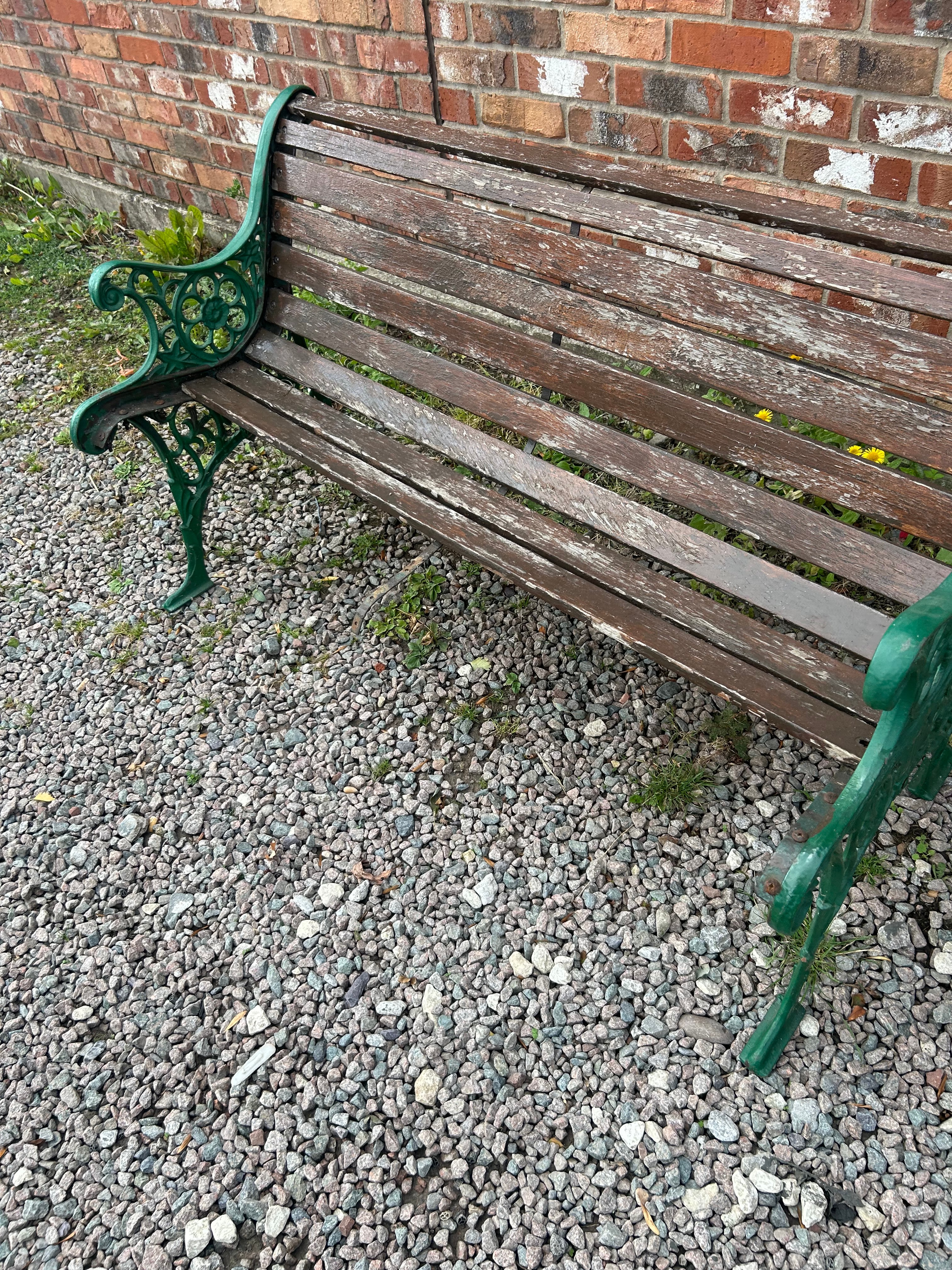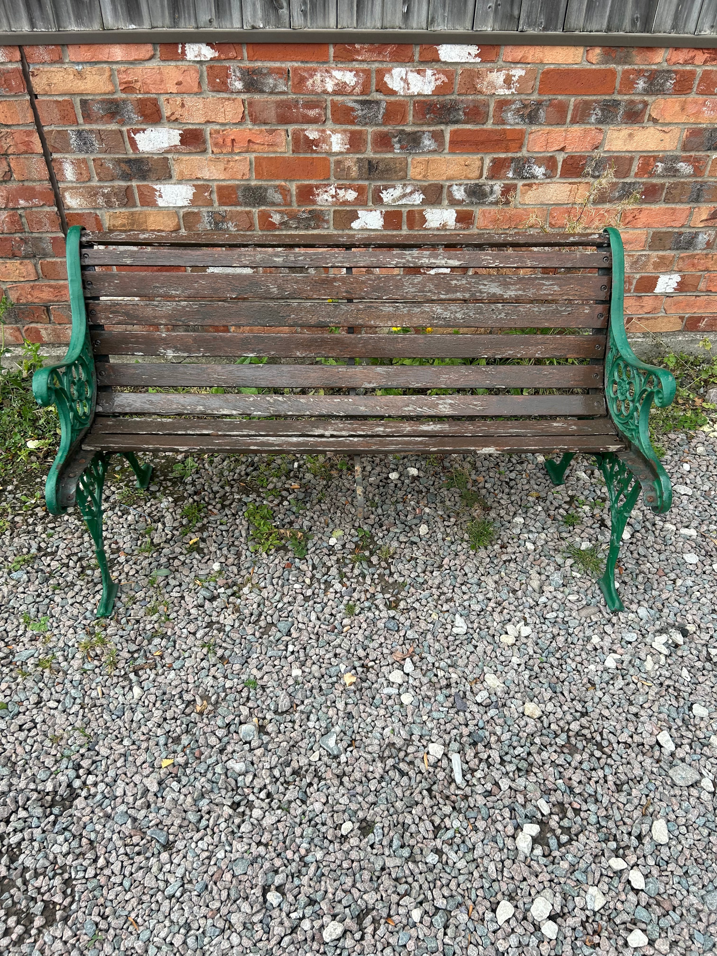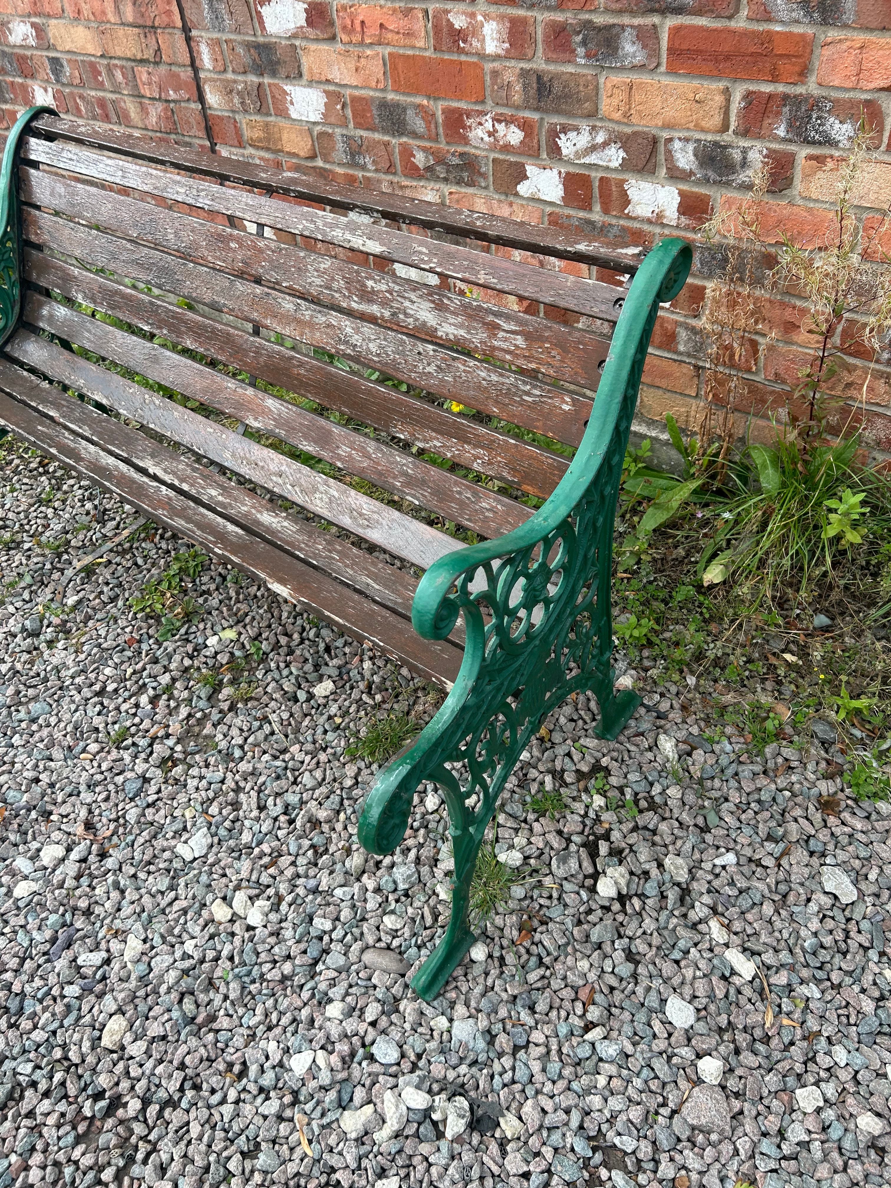 A garden bench featuring multiple horizontal wooden slats forming the seat and backrest, supported by two ornate, dark green-painted cast iron end supports that also serve as armrests and legs. The metalwork exhibits decorative scrolling and openwork designs, characteristic of Victorian or Edwardian-era garden furniture. No visible manufacturer’s marks, text, or inscriptions are discernible on any part of the item.