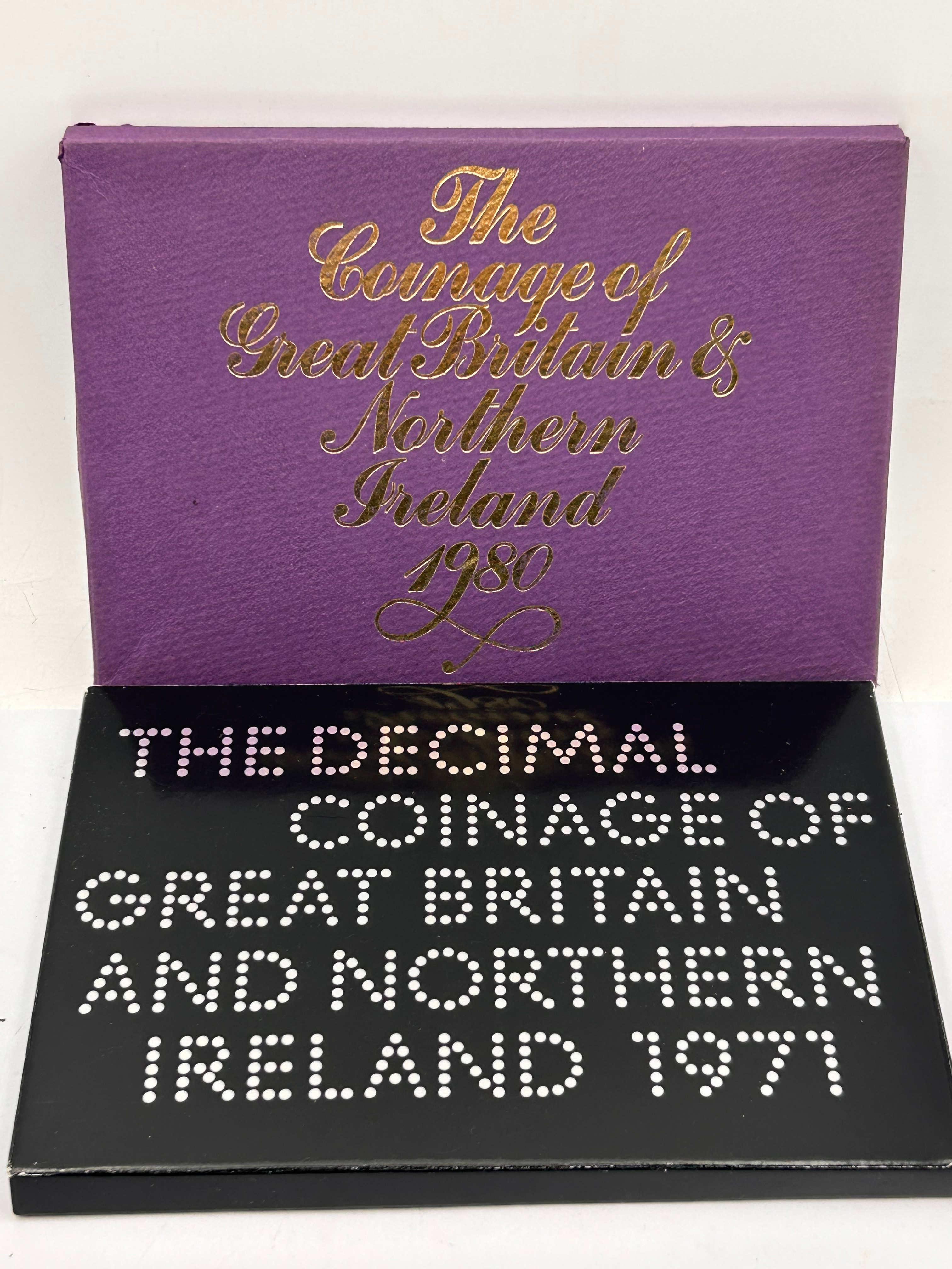 A Royal Mint bi-fold presentation case for a 1980 Great Britain & Northern Ireland Proof Coin Set. Constructed from a rigid material, the upper section is purple with embossed gold foil script lettering that reads “The Coinage of Great Britain & Northern Ireland 1980”. The lower section is black with white dot-matrix style text, stating “THE DECIMAL COINAGE OF GREAT BRITAIN AND NORTHERN IRELAND 1971”.