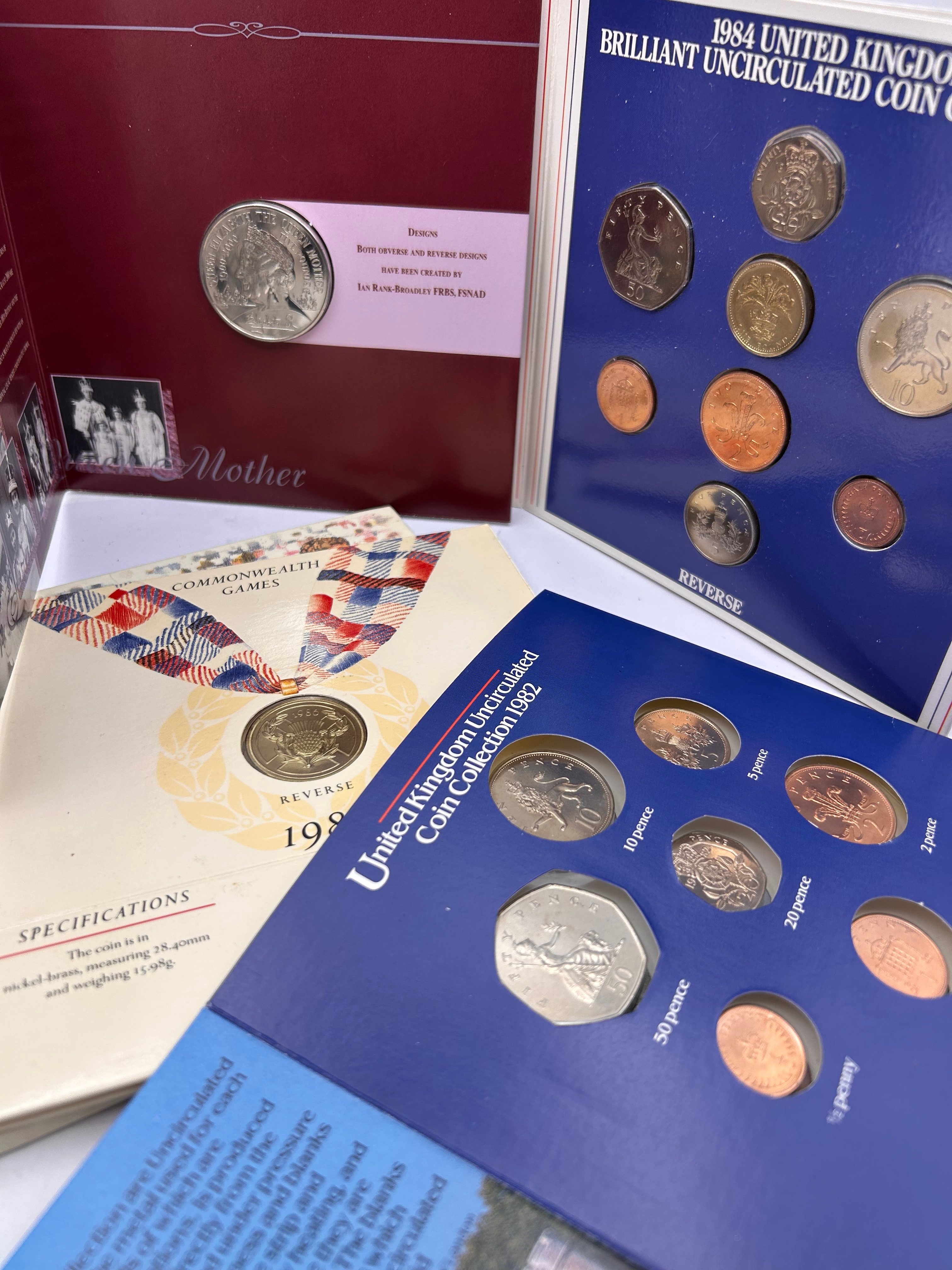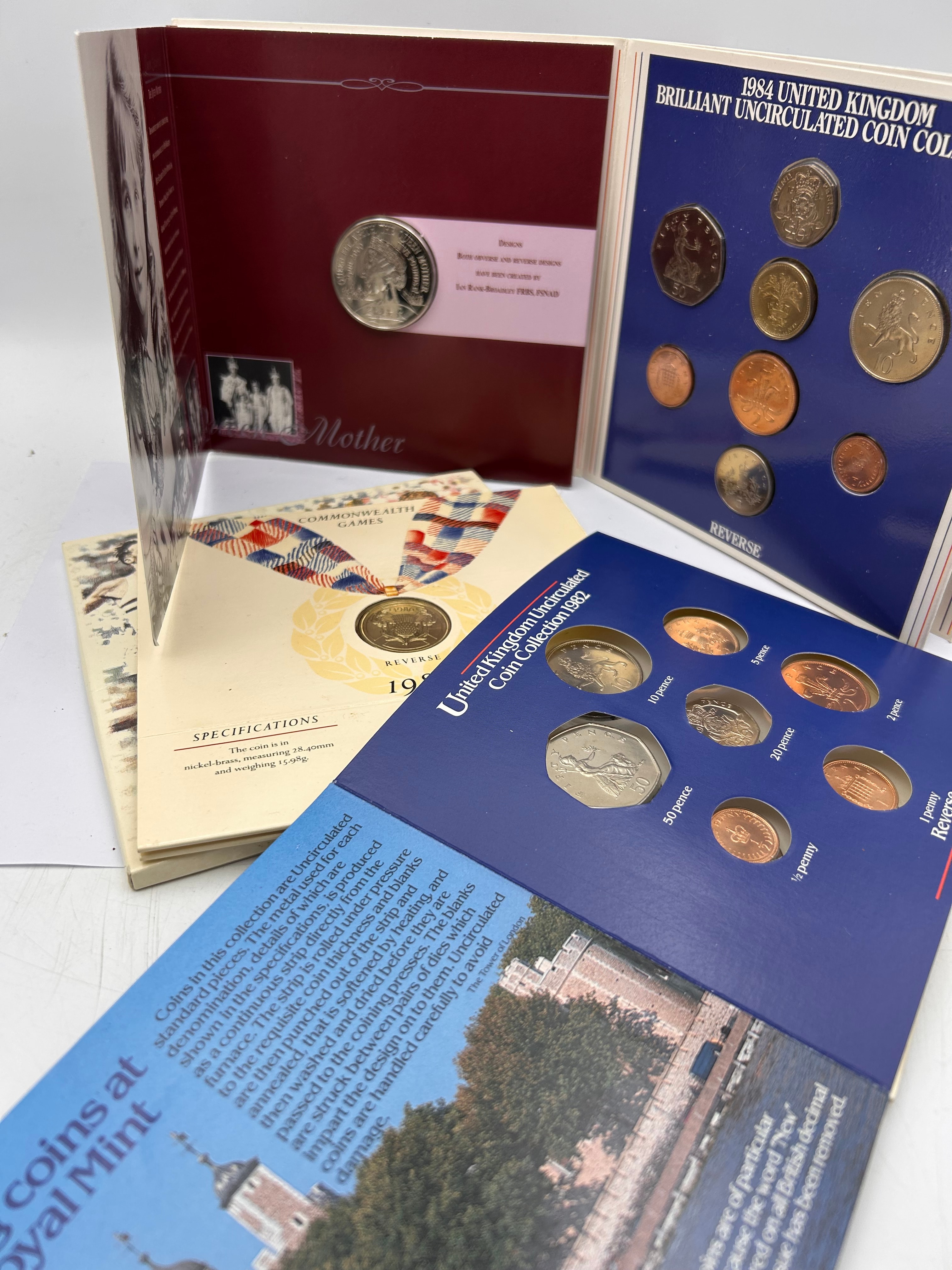 A collection of modern United Kingdom numismatic sets. This group includes a 1984 United Kingdom Brilliant Uncirculated Coin Collection and a 1982 United Kingdom Uncirculated Coin Collection, both presented in blue cardboard display folders containing various metallic denominations such as 50 pence, 10 pence, and 1 pence. Also present is a white folder for the 1984 Commonwealth Games, featuring a nickel-brass coin with accompanying specifications. A maroon folder showcases a coin depicting Queen Elizabeth II’s effigy, designed by Ian Rank-Broadley, and labeled “Mother.” All items are housed in their original paper and cardboard packaging.