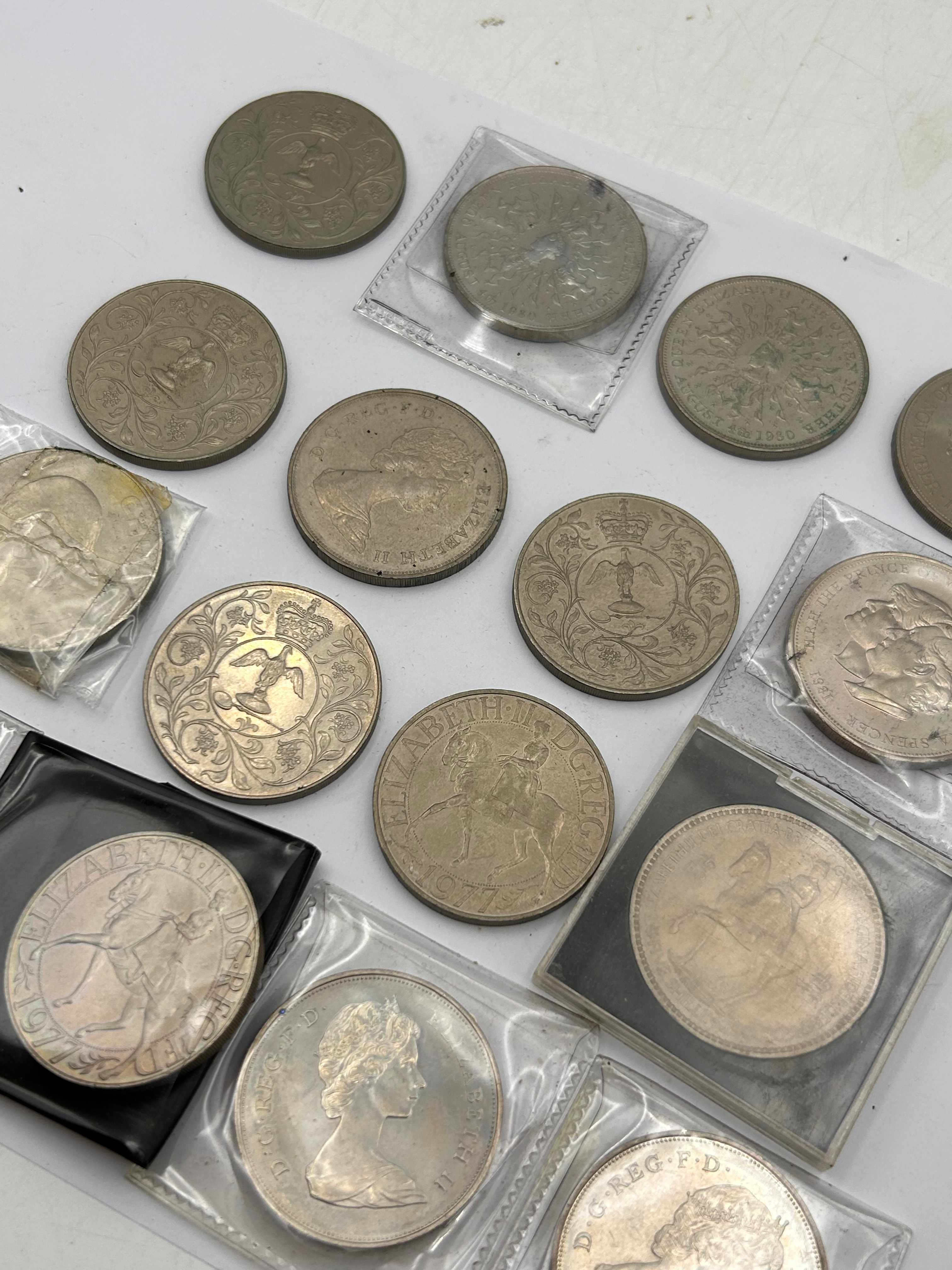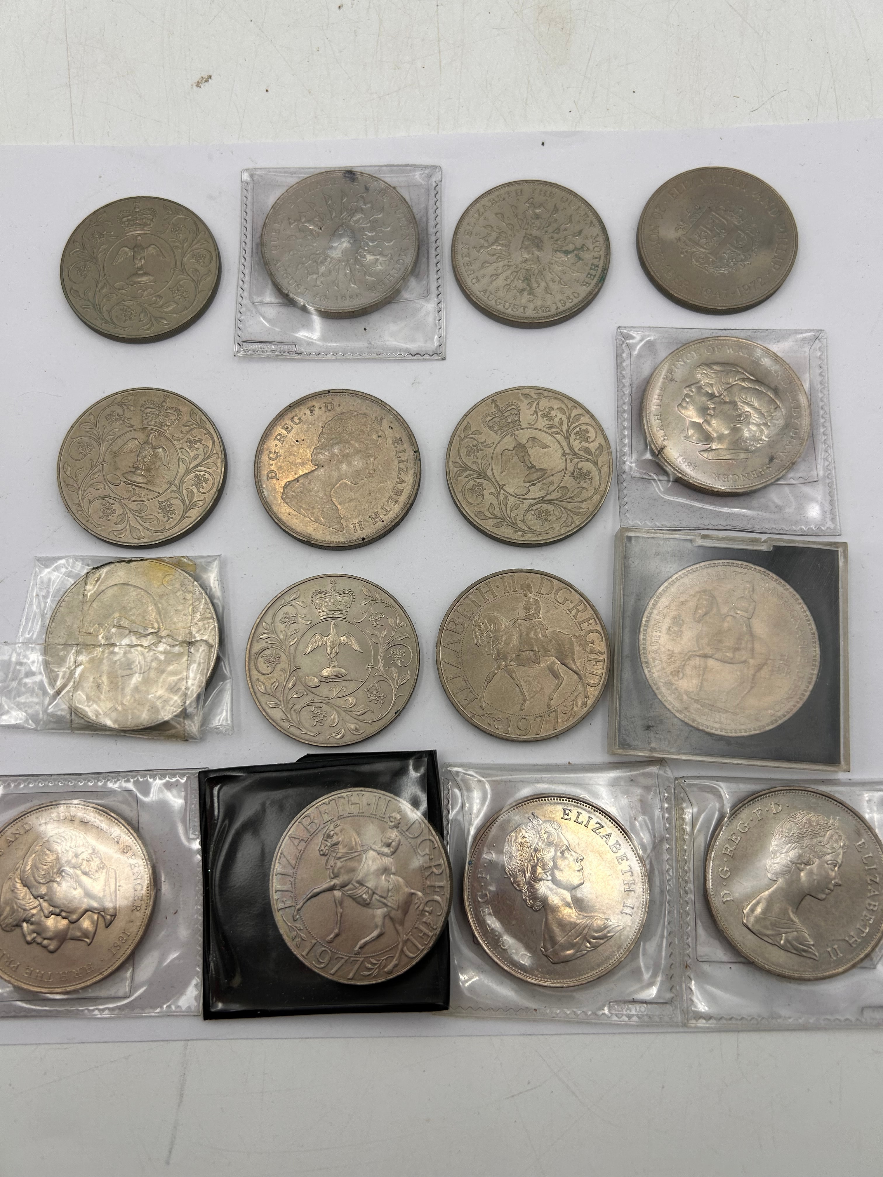 A collection of Morgan Silver Dollars. This lot consists of approximately 18 silver-toned metallic coins and medallions, predominantly from the mid to late 20th century and originating from the British Commonwealth. Several pieces display a profile of Queen Elizabeth II, often bearing the Latin inscription “ELIZABETH II D G REG F D” (Elizabeth the Second, By the Grace of God, Queen, Defender of the Faith). Visible dates range from 1953 to 1977, and imagery includes heraldic crowns, eagles, equestrian figures, and national symbols from countries such as New Zealand, Australia, and South Africa. Denominations like “TWO SHILLINGS” and “ONE CROWN” are also apparent. The items show varying levels of circulation wear and minor toning, with several individually protected in plastic sleeves or rigid holders.
