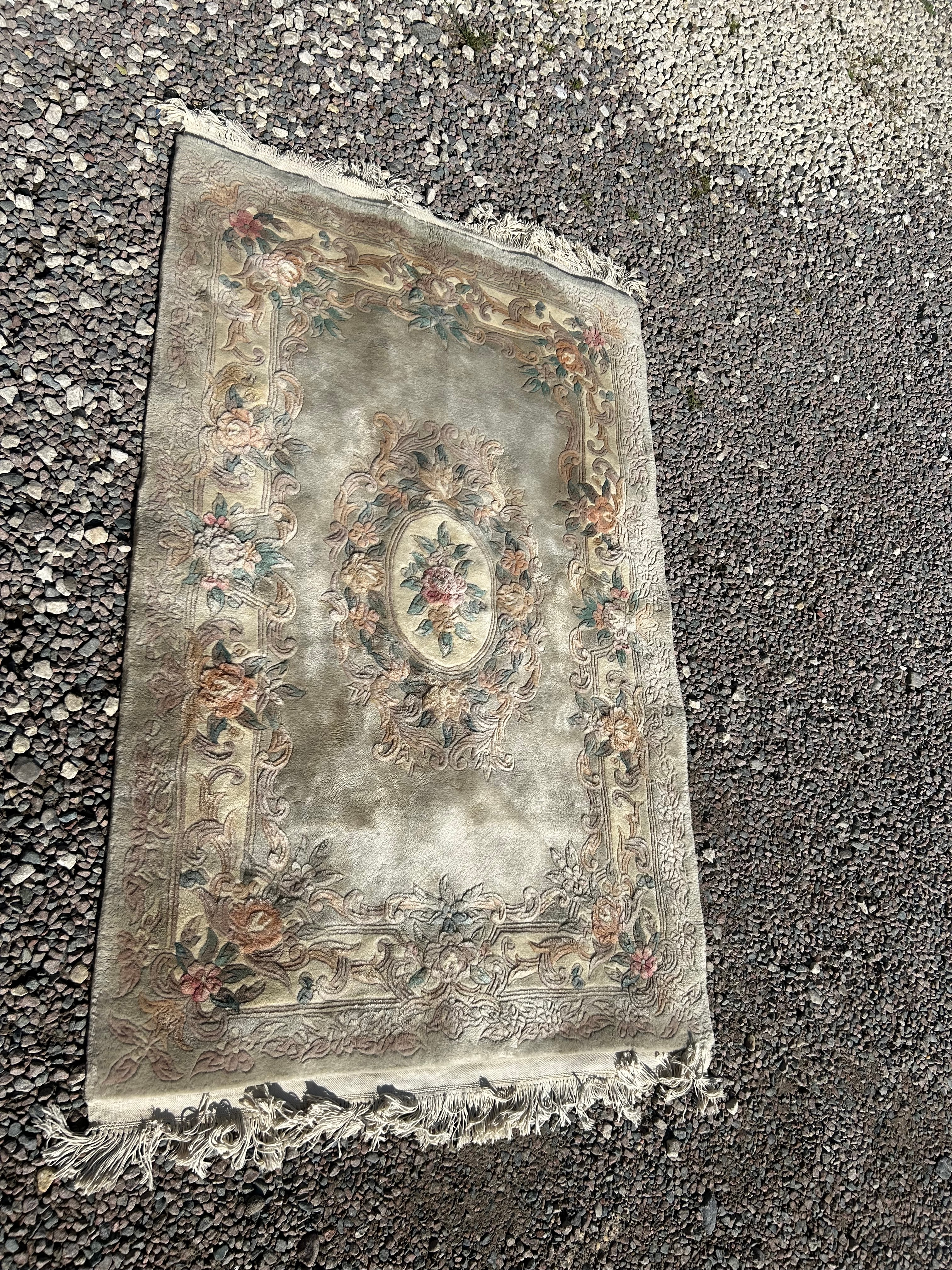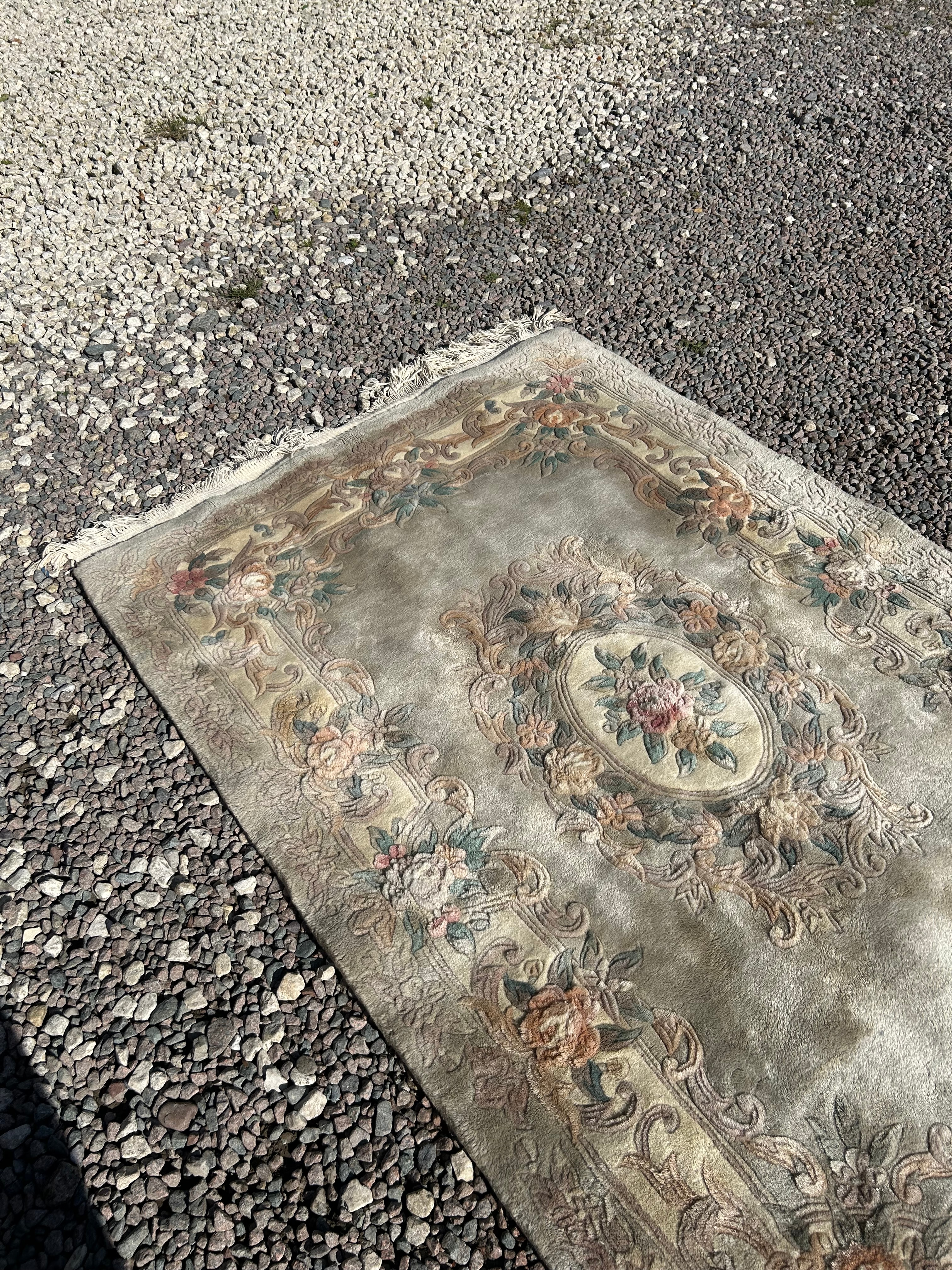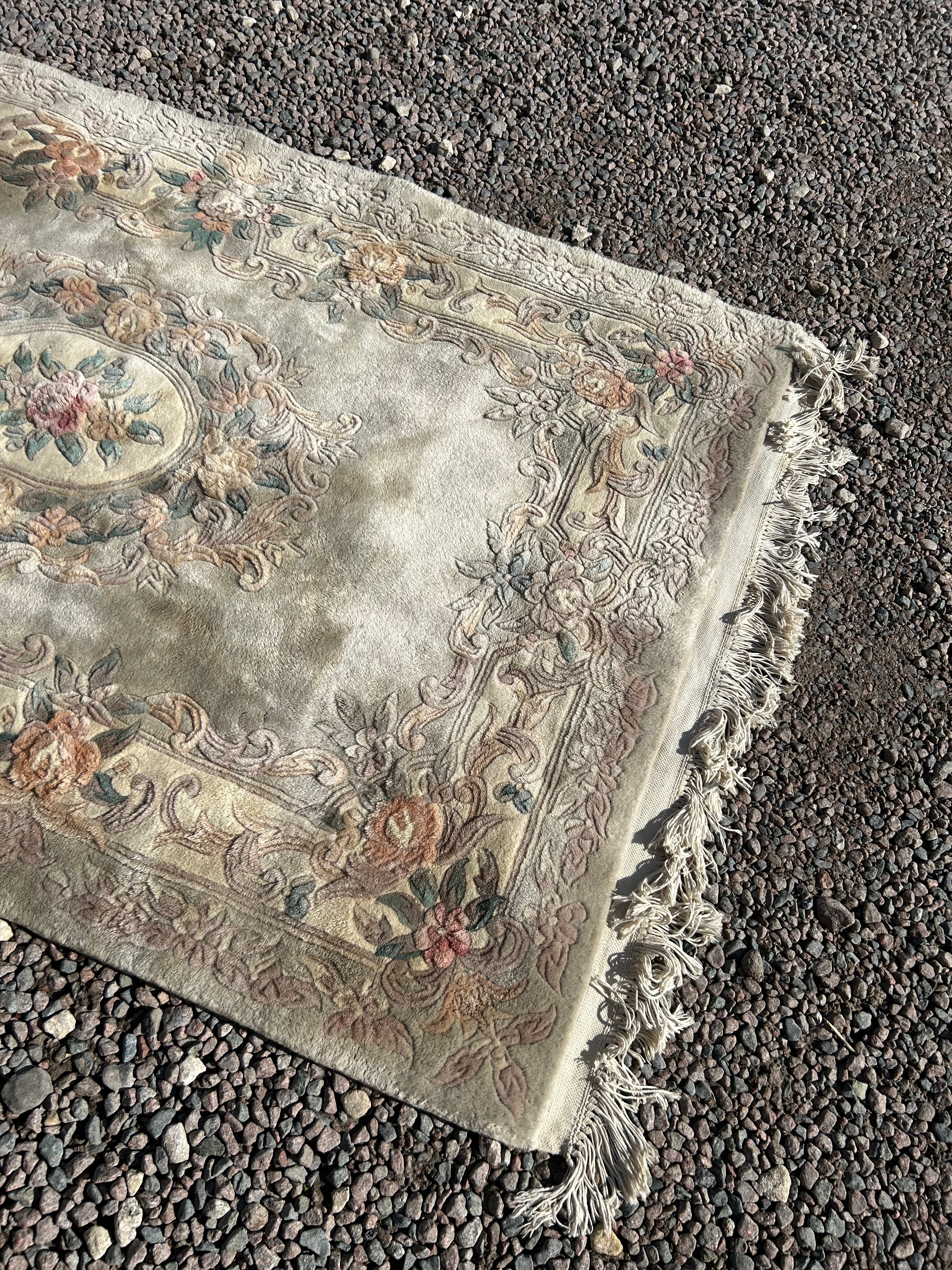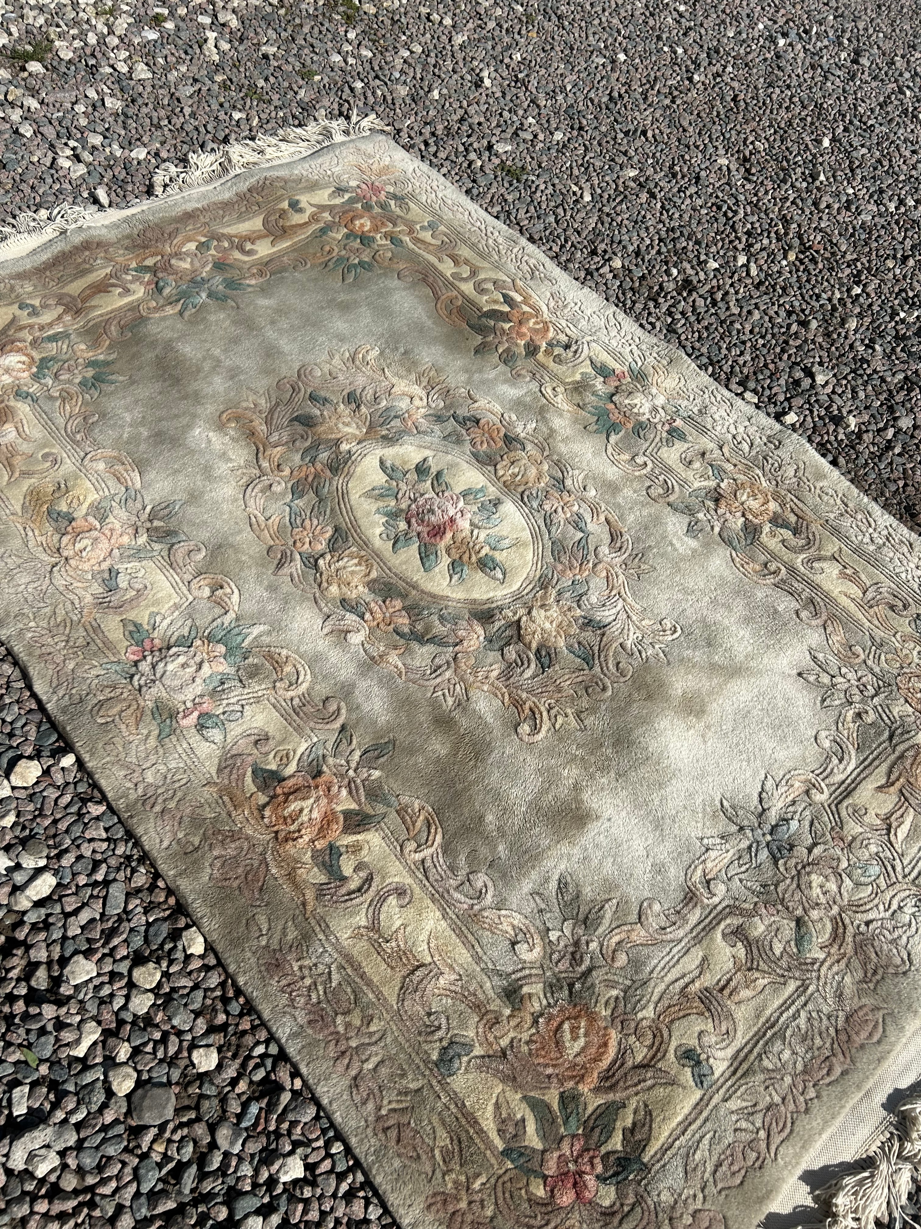 A rectangular textile rug or mat, featuring a formal, classicizing floral design. It presents a central oval medallion showcasing a floral bouquet, set against a muted greenish-grey field. This field is encircled by a wide, multi-tiered border composed of scrolling foliage and various floral motifs, rendered in hues of cream, pale green, soft pink, and muted orange/peach. The rug has white fringed edges on its shorter sides.