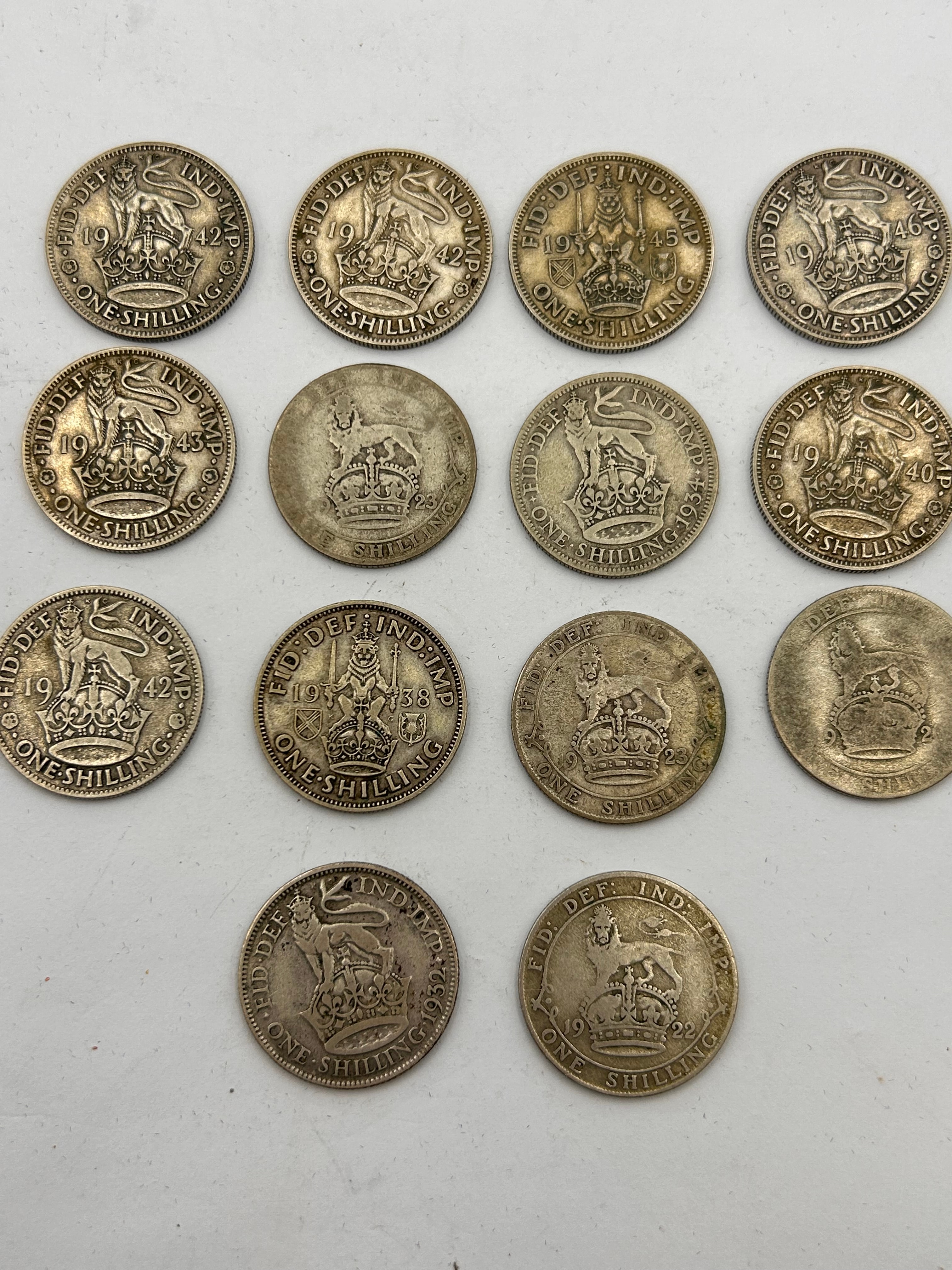 A collection of fourteen British .500 silver shilling coins. Each coin features a crowned lion standing on a crown on one side, with the denomination ‘ONE SHILLING’ inscribed below. The upper periphery bears the Latin inscription ‘FID. DEF. IND. IMP.’ (Defender of the Faith, Emperor of India). Visible dates range from the mid-1930s to the late 1940s, including examples from 1935, 1938, 1940, 1942, and 1947. These coins are consistent with the pre-1947 period of .500 silver content for British coinage.