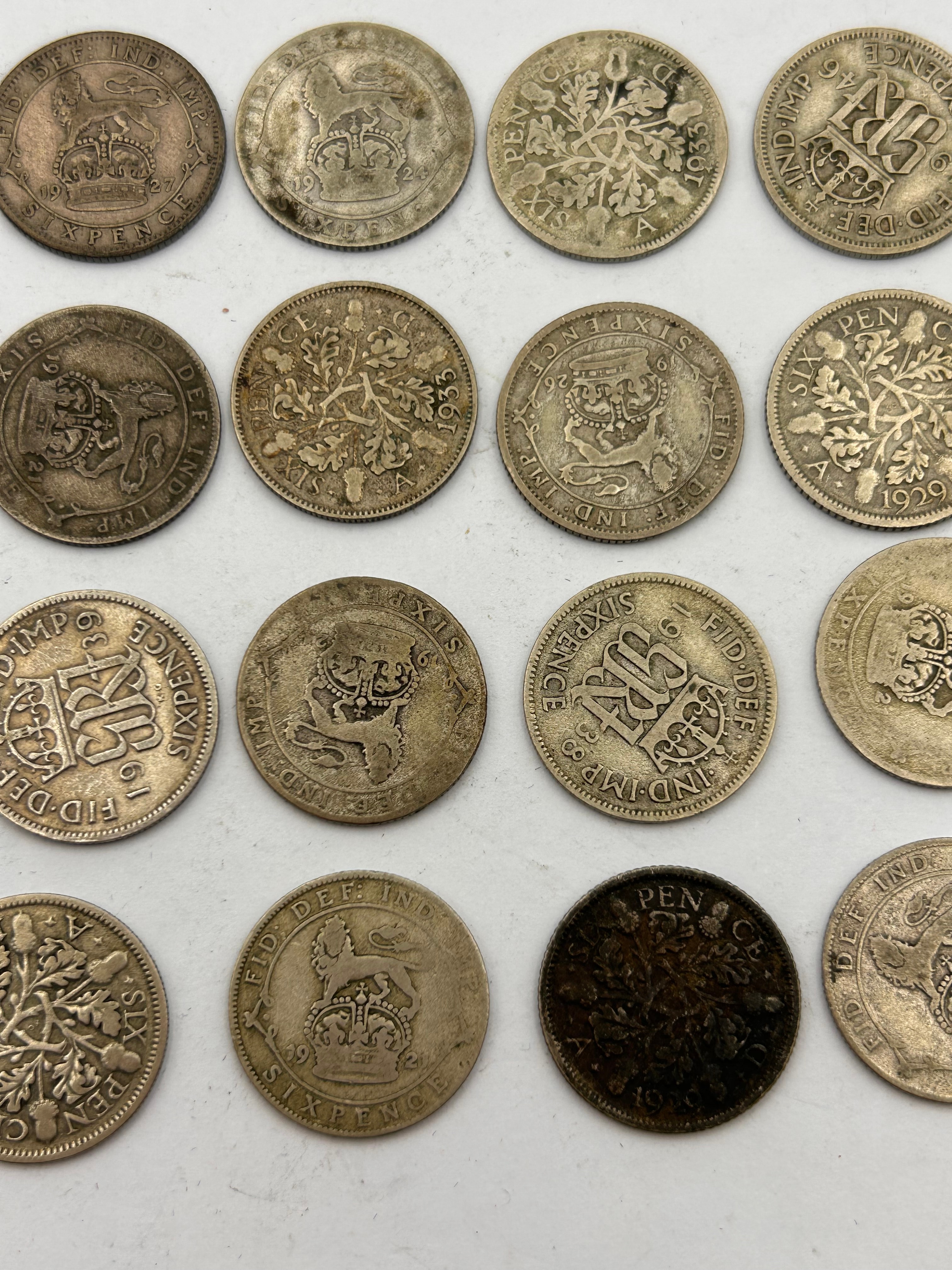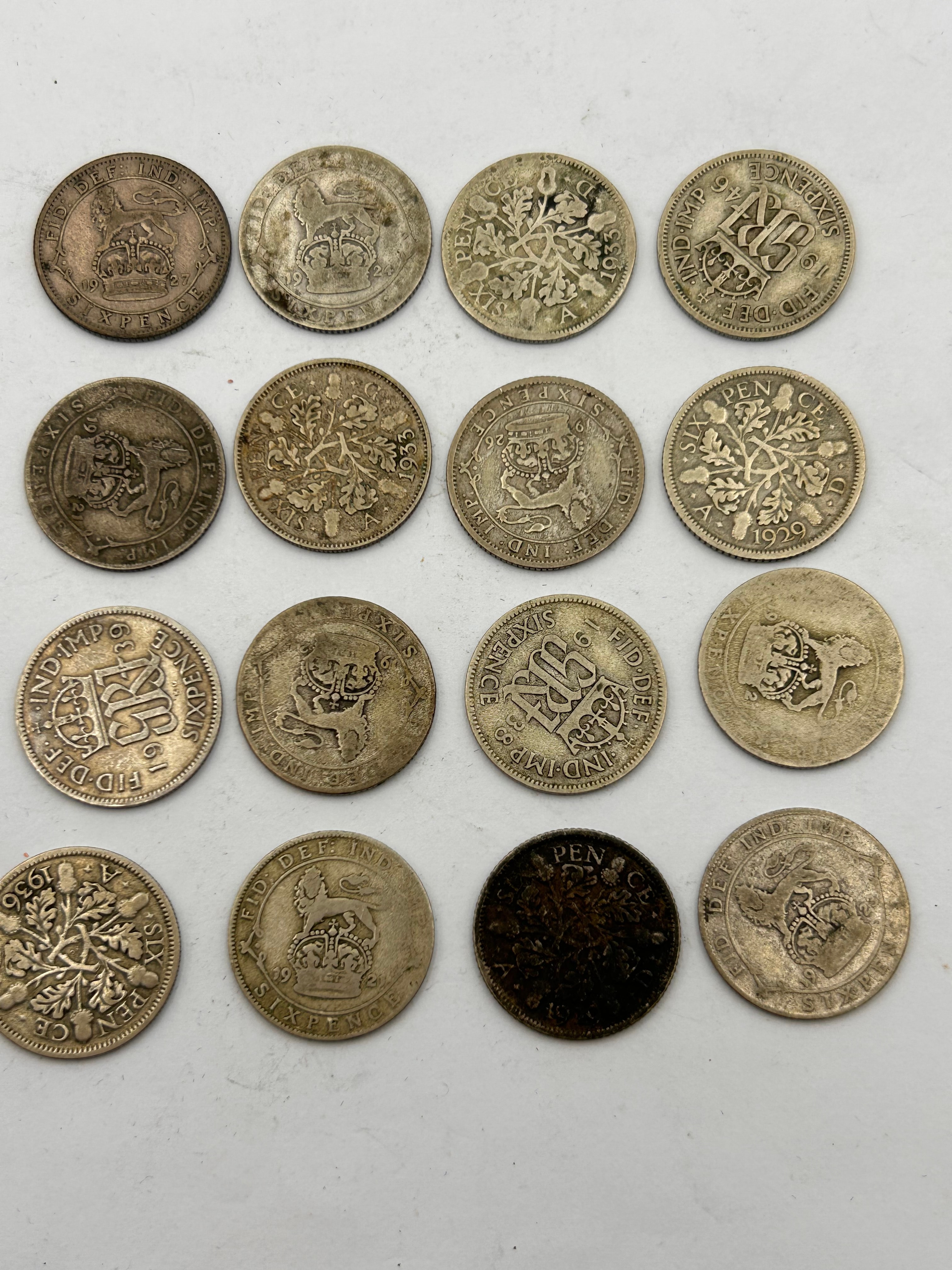 A collection of sixteen British Sixpence coins, primarily from the reigns of George V and George VI, dating between approximately 1918 and 1937. The coins are struck in a silver-colored metal, with one appearing significantly darker due to heavy toning or possibly different composition. Obverses typically feature the monarch’s bust with inscriptions such as “GEORGIVS V D. G. BRITT. OMN. REX F. D. IND. IMP.”, while reverses display the denomination “SIX PENCE” alongside various royal monograms (e.g., GVRI) or floral motifs like oak branches and national emblems. Visible dates include 1933, 1929, 1937, 1936, 1920, and 1918.