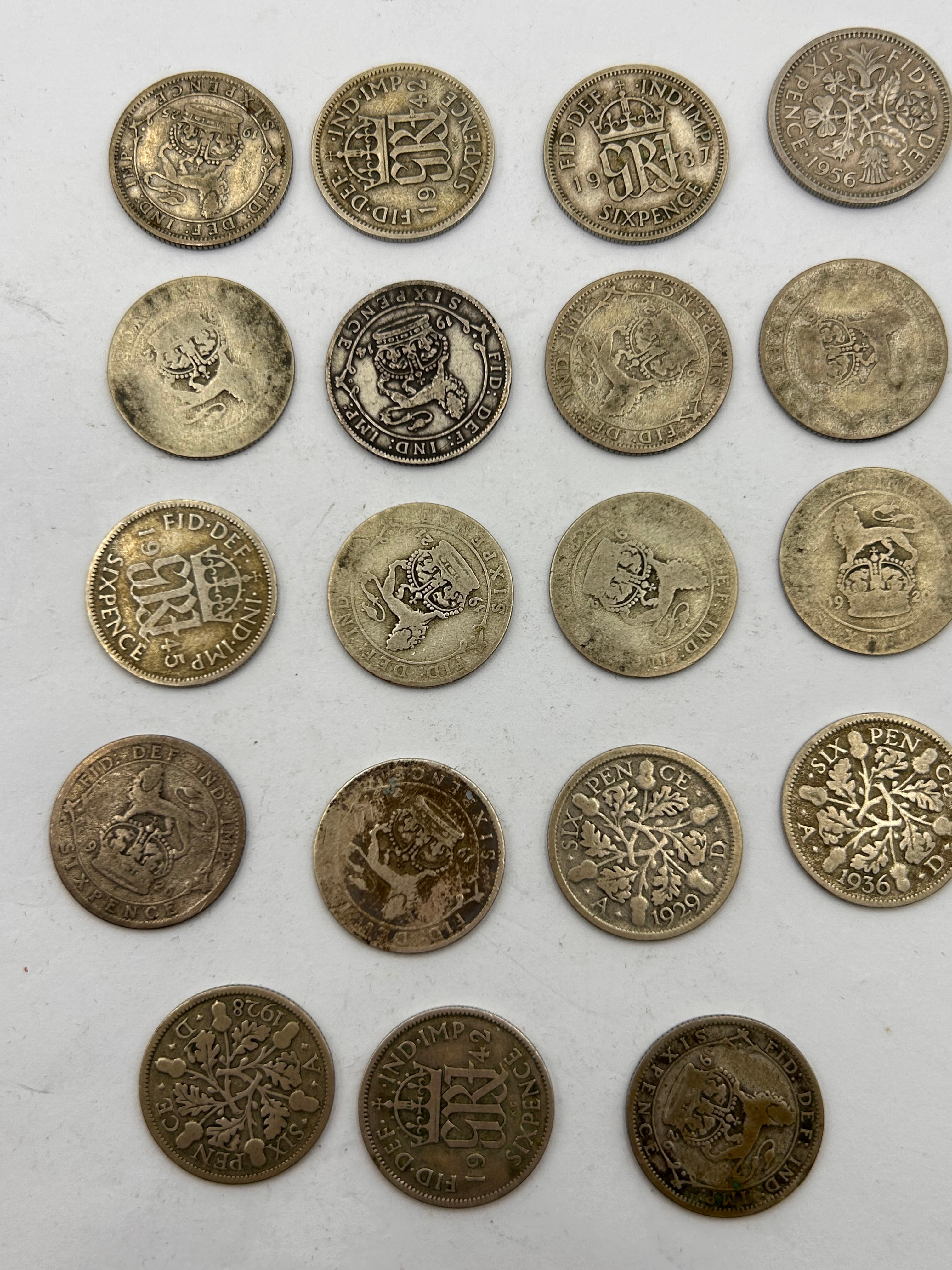 This collection comprises twenty British silver or silver-colored alloy coins, primarily dating to the early 20th century. Clearly visible dates include “1929”, “1931”, and “1936”. The obverse of many coins depicts a crowned monarch, identifiable as King George V. Reverses feature various designs such as crowned “GR” monograms, crowned lions, and floral arrangements including roses, thistles, and shamrocks. Common inscriptions include “SIX PENCE”, “ONE SHILLING” (on one coin), “FID DEF” (Fidei Defensor – Defender of the Faith), and “IND IMP” (Indiae Imperator – Emperor of India).