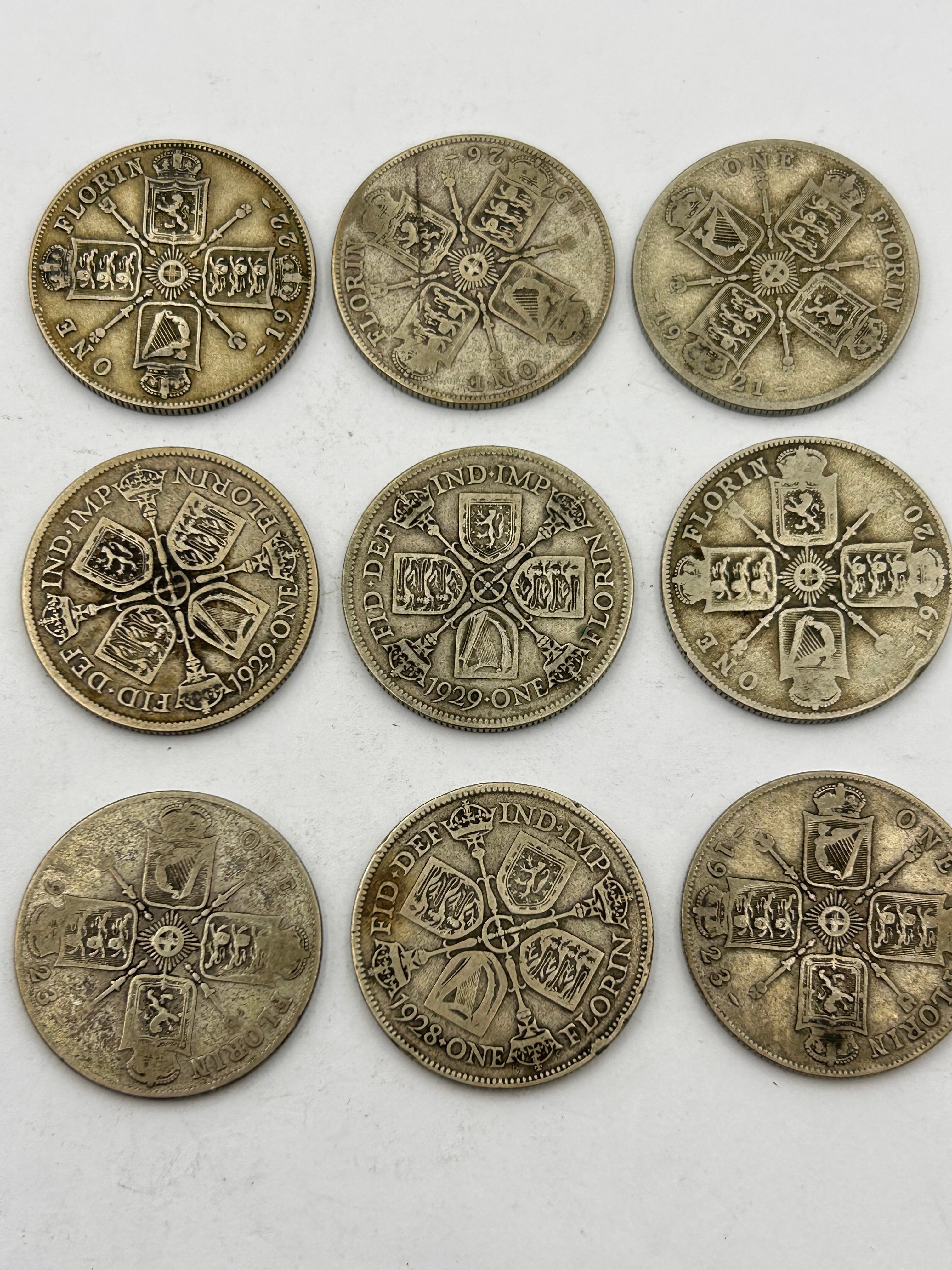 A group of nine George V Great Britain silver Florins, also known as Two Shillings. Each coin features a reverse design with a cruciform arrangement of four crowned shields (depicting emblems such as lions and a harp) around a central rose, with the text ‘ONE FLORIN’ and ‘FID. DEF. IND. IMP.’ visible on the perimeter. The dates observed within the group include 1920, 1921, 1922, 1928, and 1929.