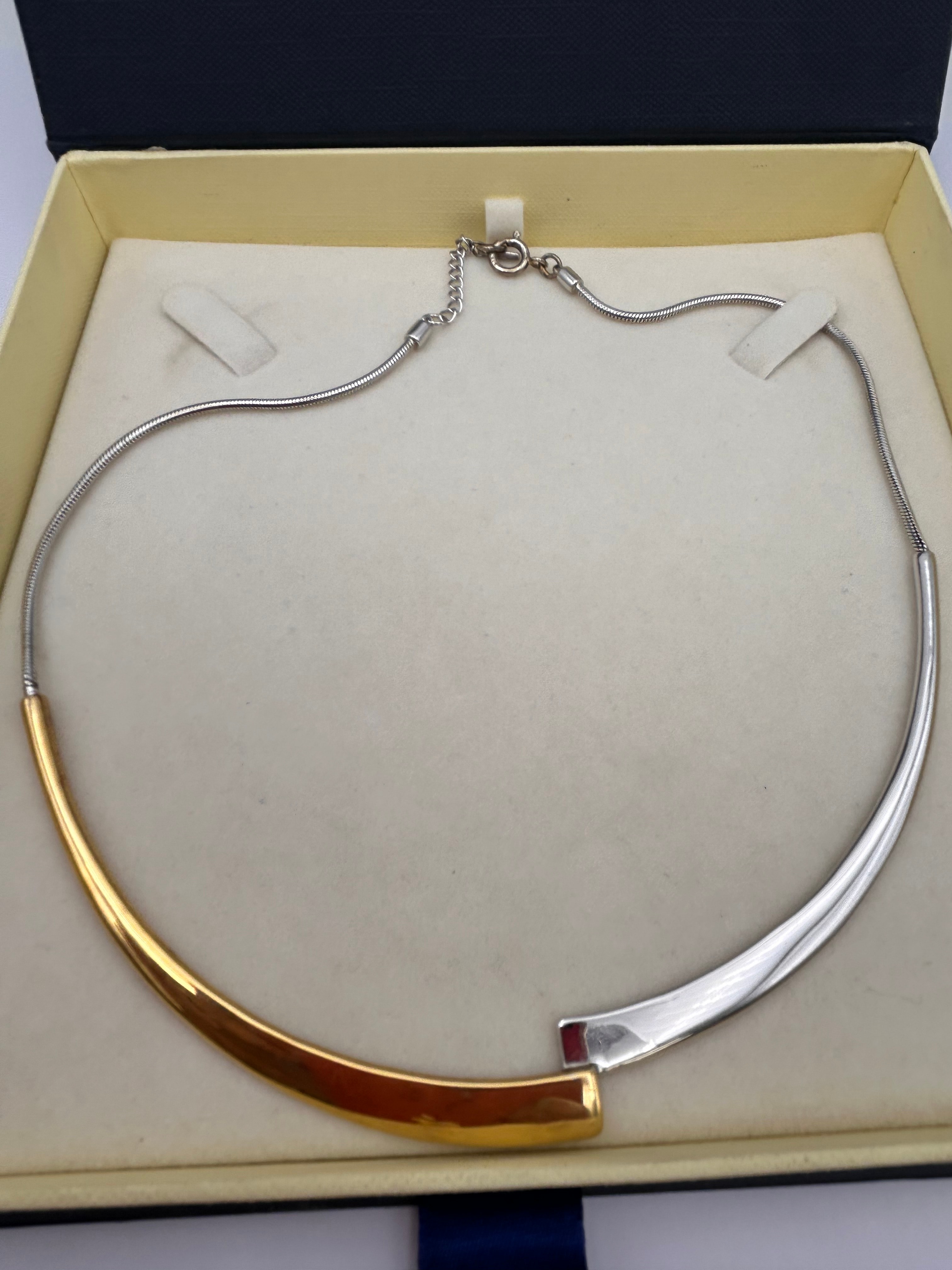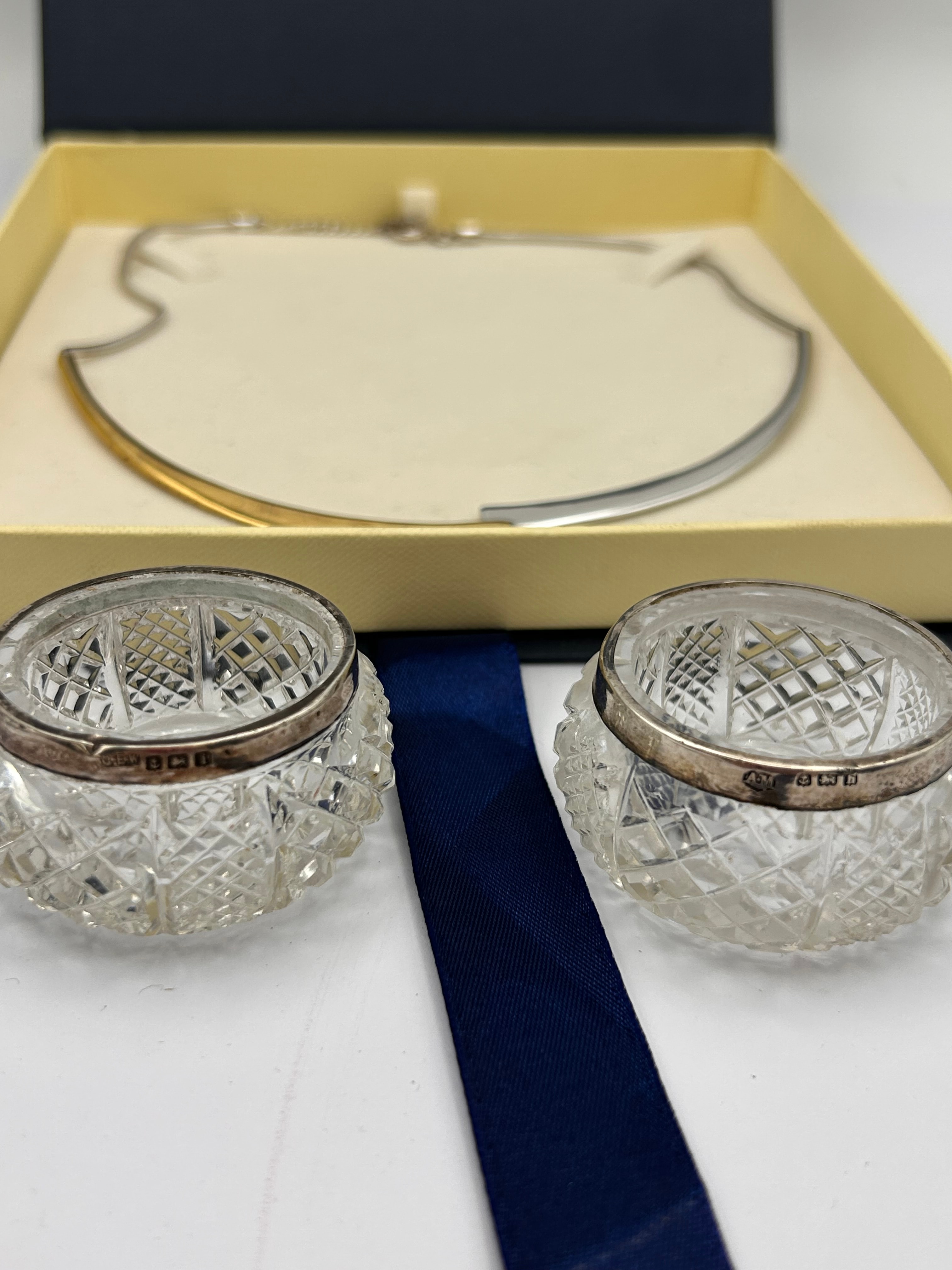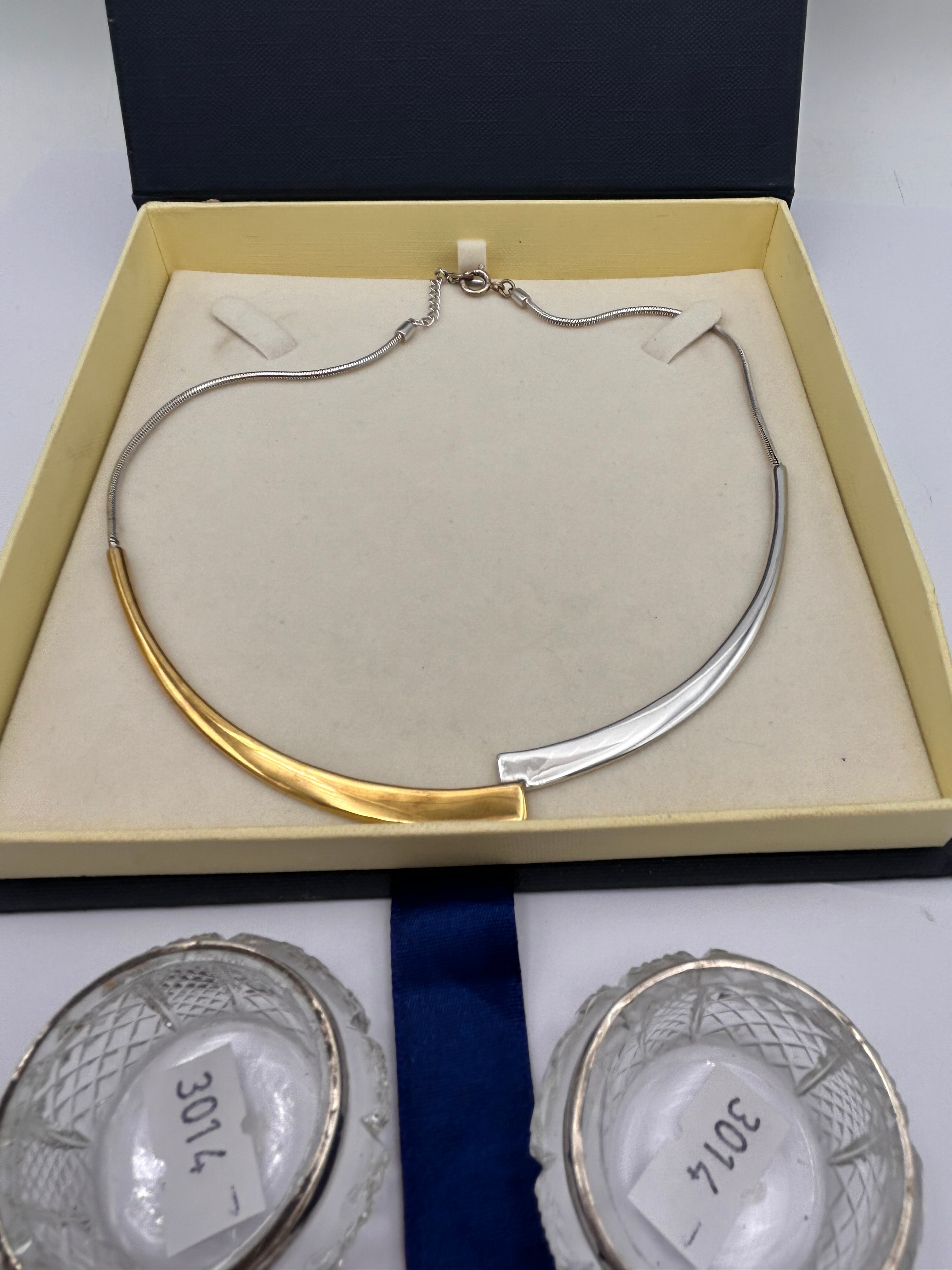 A modern bimetallic collar-style necklace featuring a snake chain connecting to a rigid, curved front element, divided into a gold-toned section and a contrasting silver-toned section, presented in an open, padded gift box. Accompanying the necklace is a pair of identical circular cut-glass bowls, each exhibiting a diamond-cut pattern. The bowls are fitted with sterling silver rims, each bearing visible hallmarks including a lion passant mark, indicating sterling silver, along with a maker’s mark “AM&S” or “AW&S”