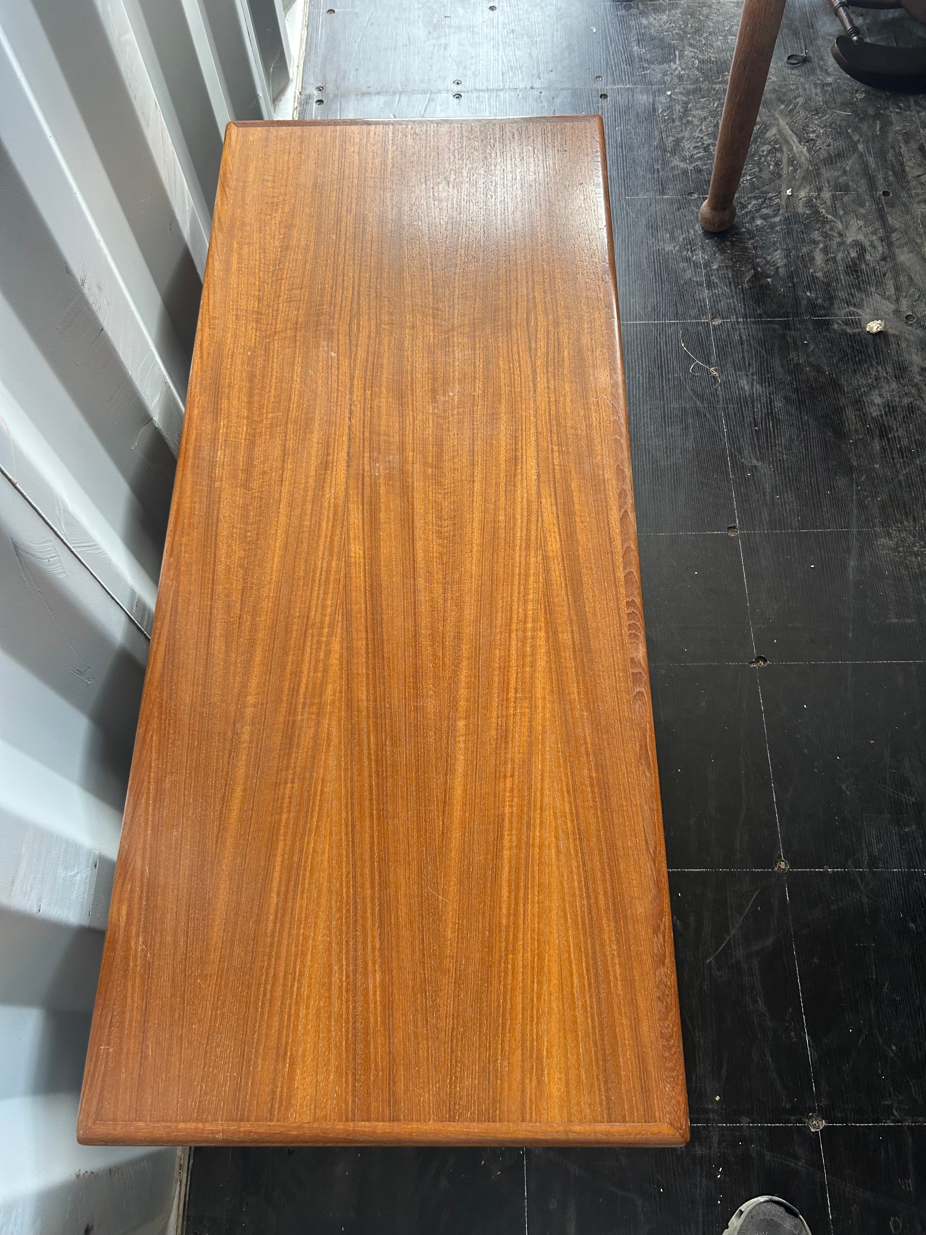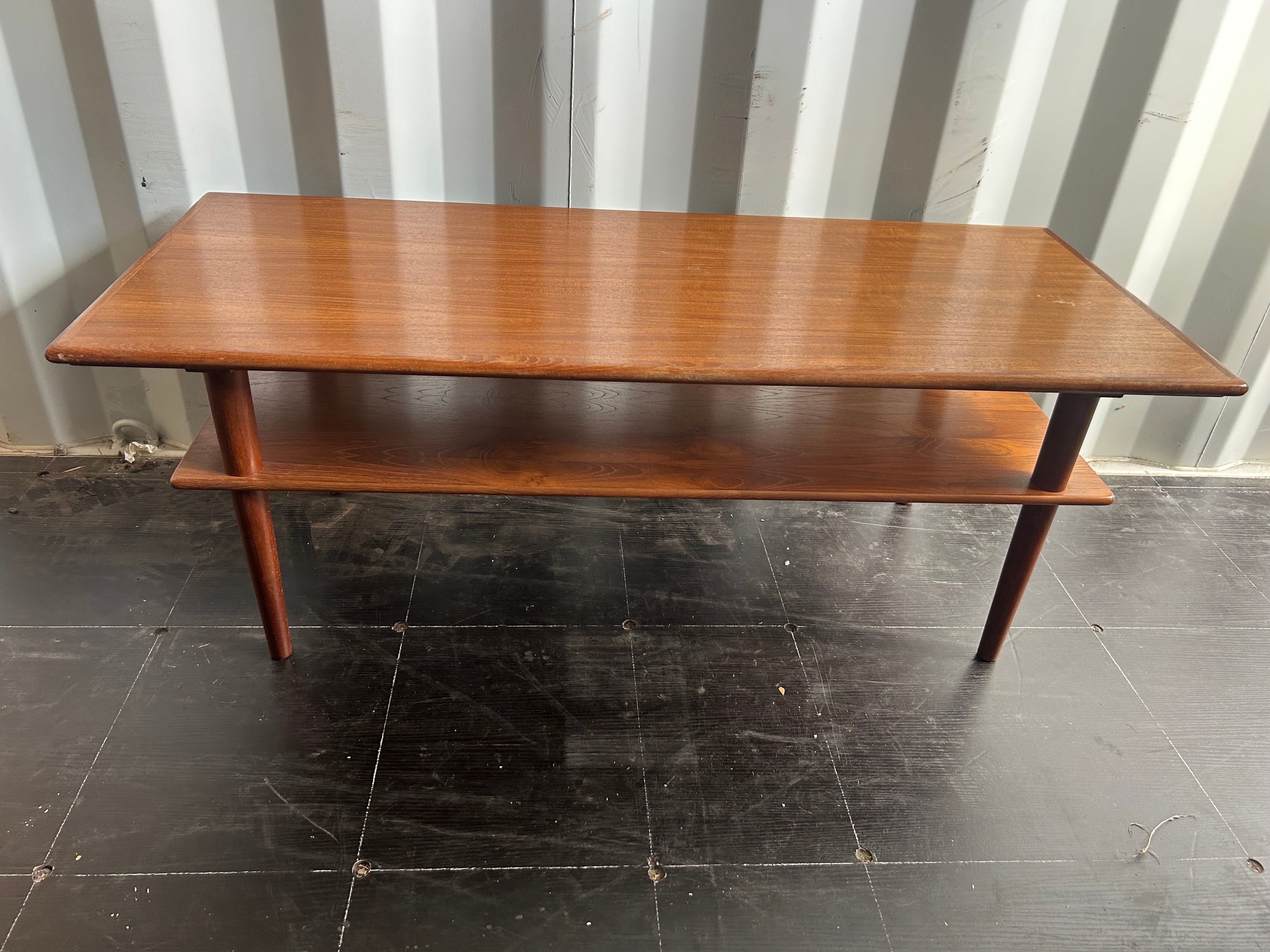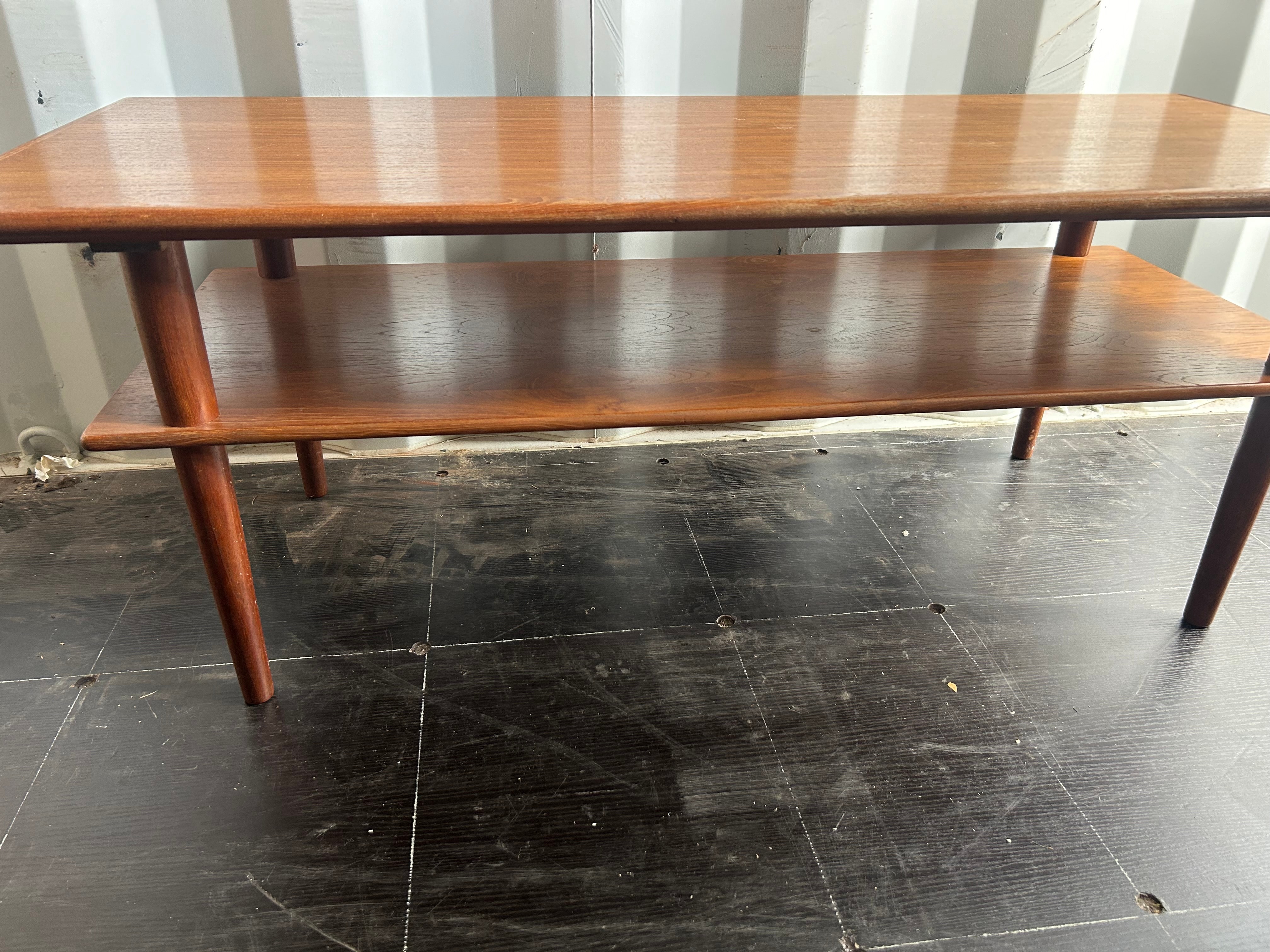 A Danish Mid-Century Modern two-tier coffee table. Crafted from teak wood, it displays a warm, reddish-brown finish highlighting a distinct straight grain across both the top and lower rectangular shelves. The structure is supported by four slender, tapered legs. No visible text, labels, or manufacturer’s markings are apparent.