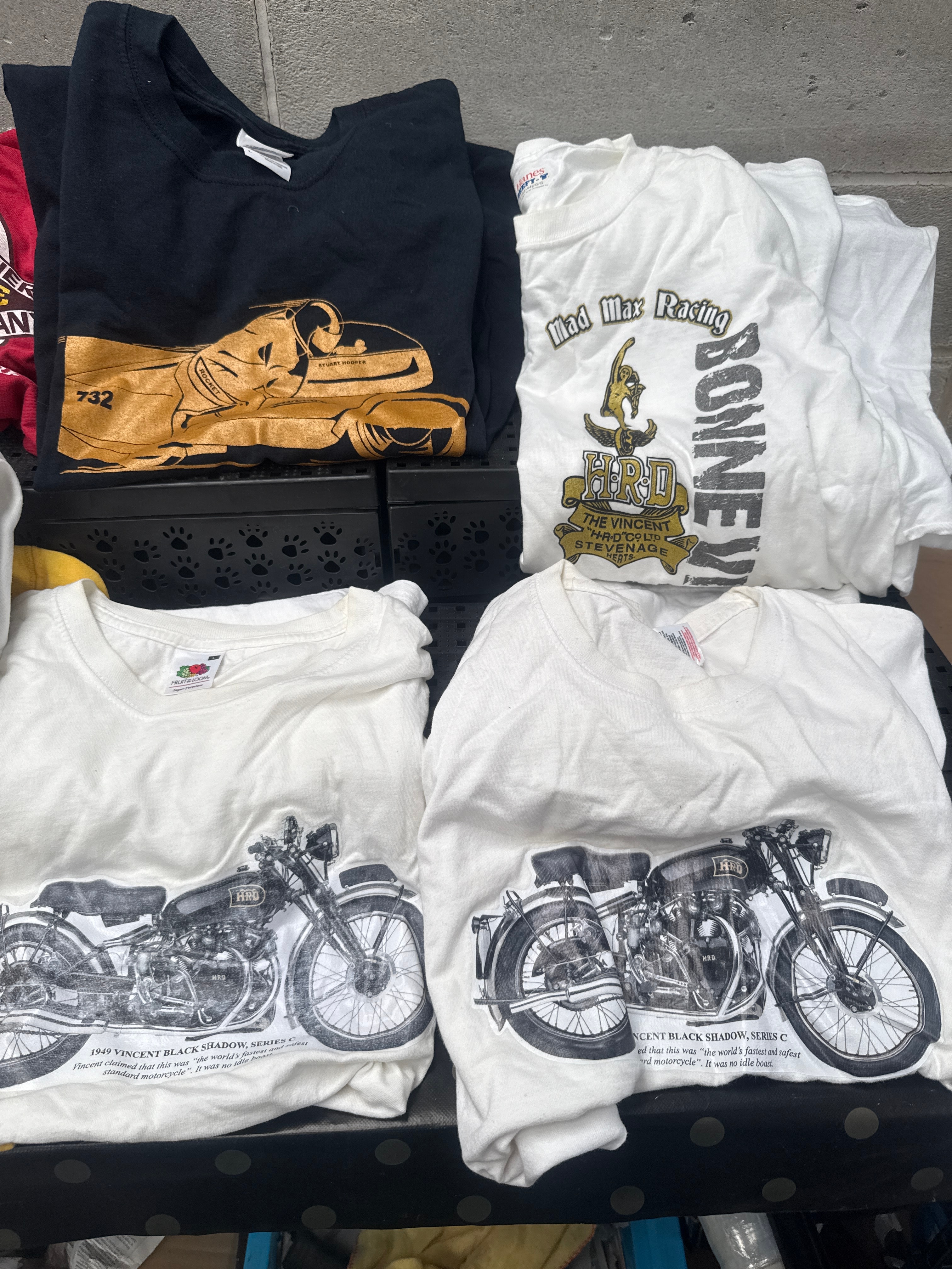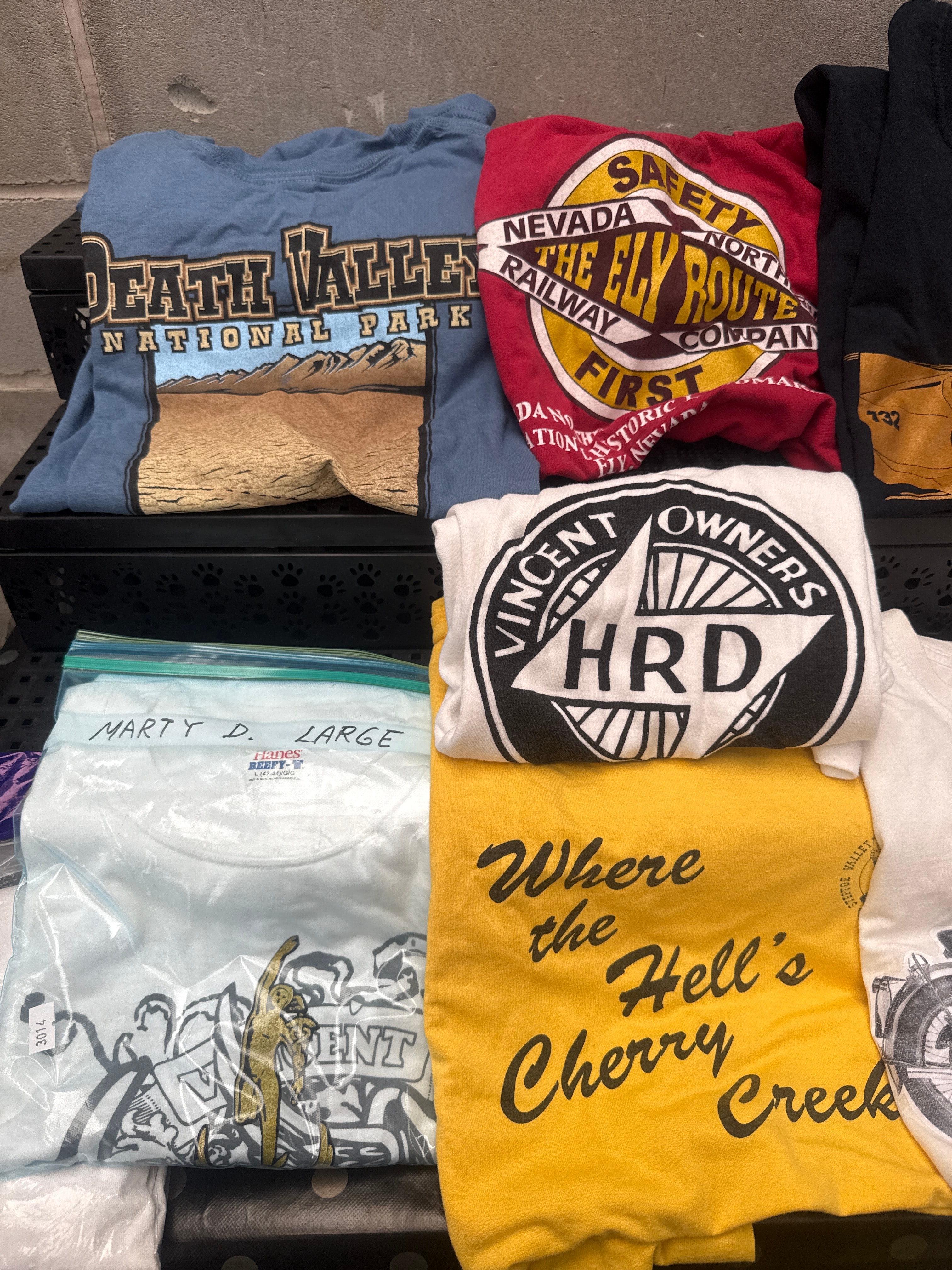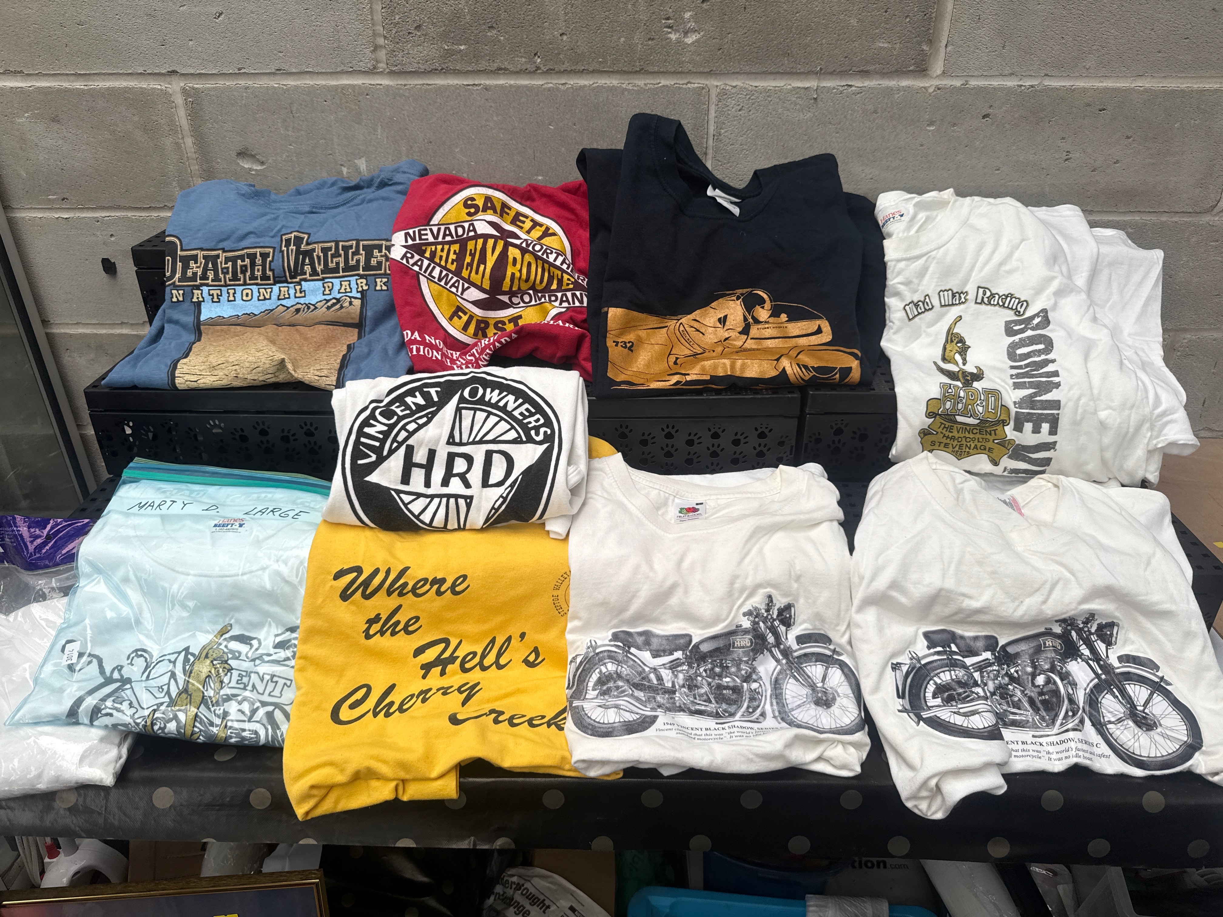 A collection of ten short-sleeved graphic t-shirts, all size Large, primarily constructed from cotton or a cotton-blend fabric. The designs feature diverse themes, including travel destinations such as ‘Death Valley National Park’ and ‘Nevada North Safety Railway, The Ely Route.’ A significant number of shirts are motorcycle-themed, prominently featuring ‘Vincent’ and ‘HRD’ brands, with graphics including the ‘VINCENT OWNERS HRD’ logo, detailed illustrations of the ‘1949 Vincent Black Shadow, Series C,’ and references like ‘Mad Max Racing BONNEVILLE.’ Additional visible text includes ‘Where the Hell’s Cherry Creek.’ Manufacturer tags such as ‘Hanes Beefy-T’ and ‘Fruit of the Loom’ are present. One light blue shirt is contained within a plastic bag labeled ‘MARTY D. LARGE.’ The styles and themes suggest a production period from the late 20th to early 21st century, consistent with popular biker and motorcycle-themed apparel often associated with brands like Harley Davidson in the secondary market.