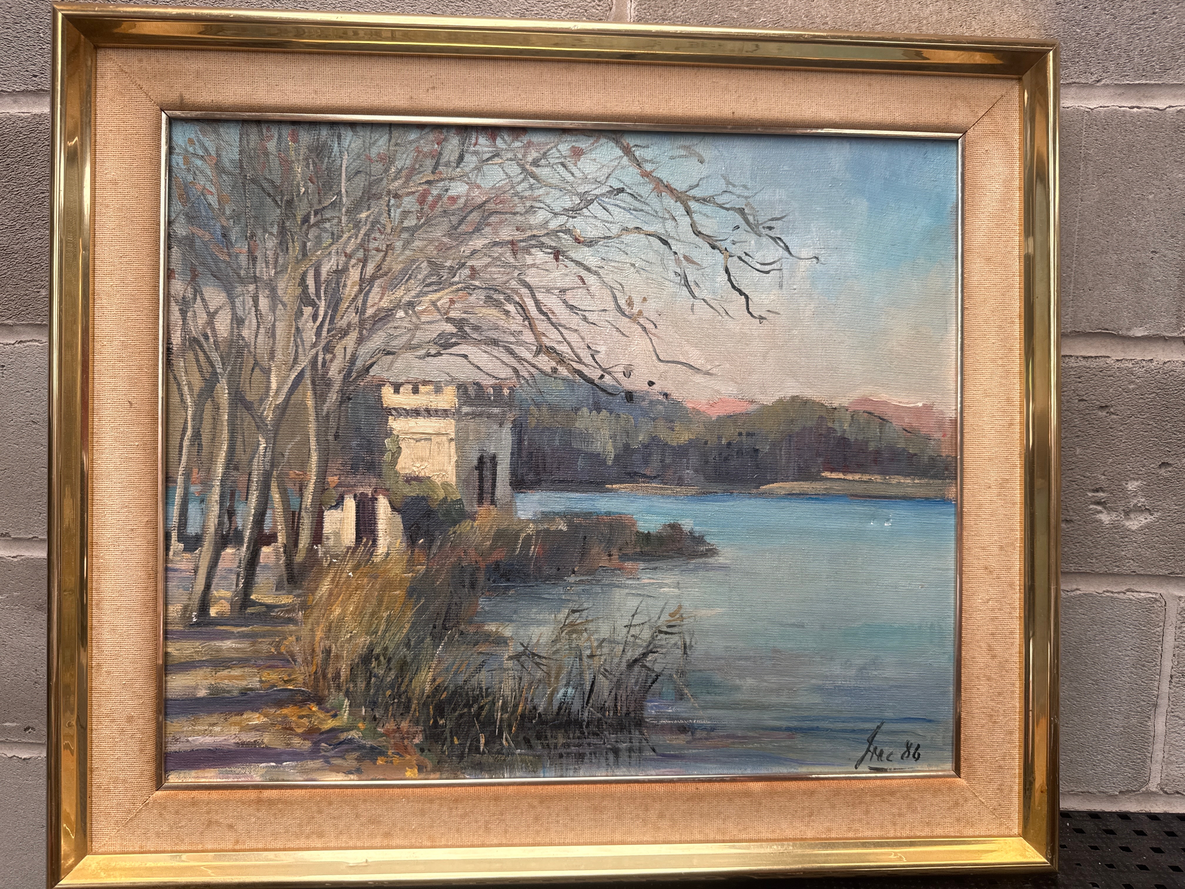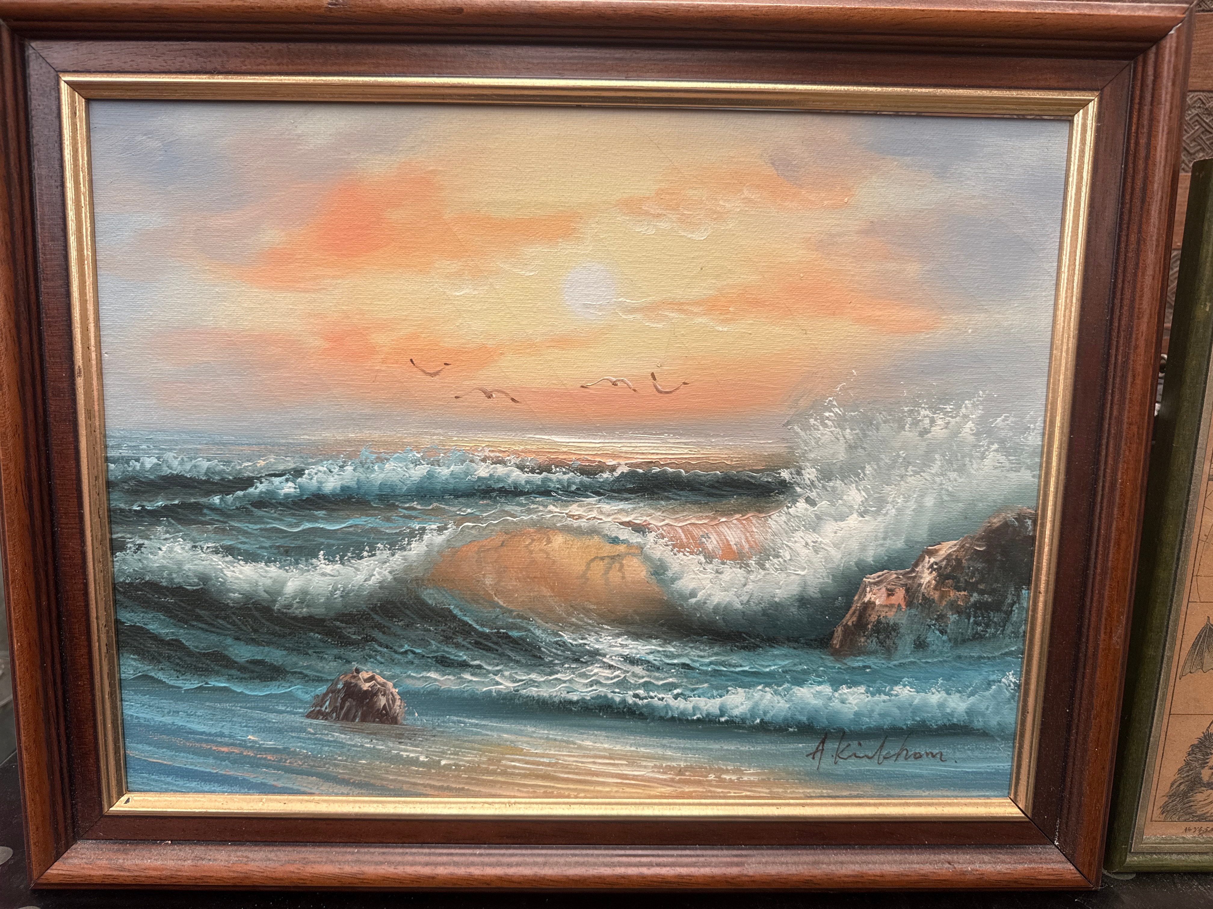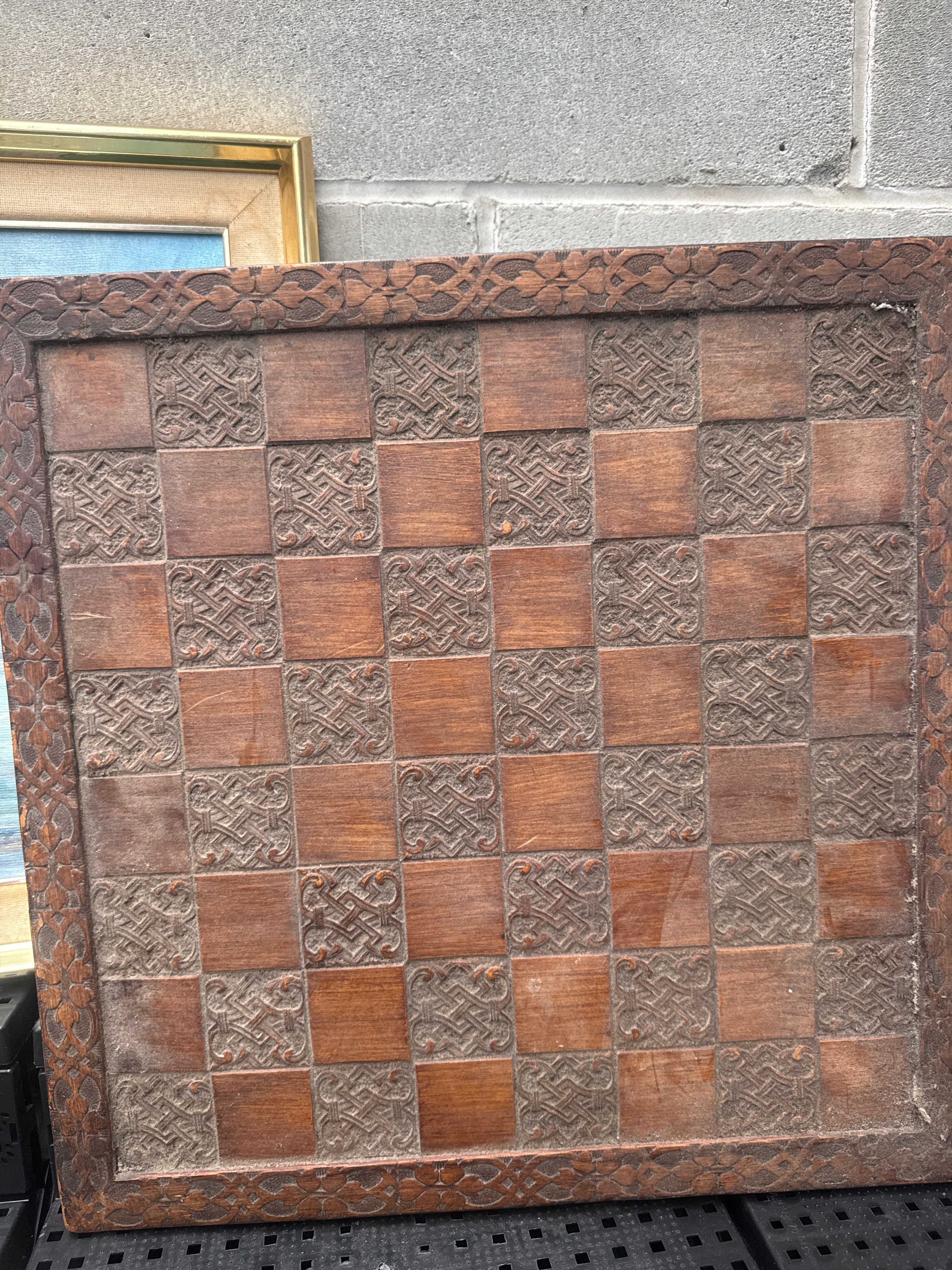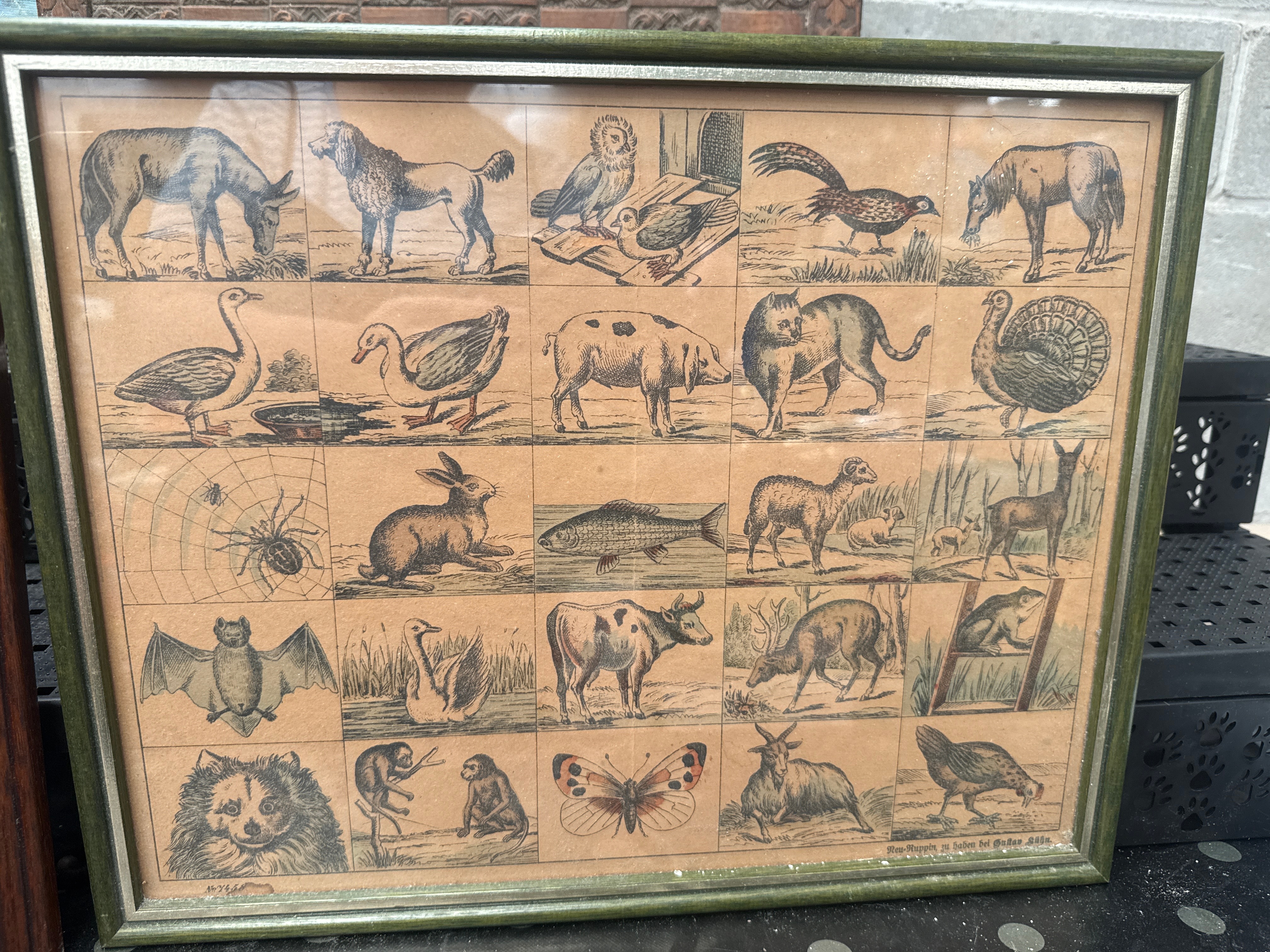 This lot comprises four distinct items. The first is a framed landscape painting, signed “Rue 86,” depicting a bare-branched tree and a stone tower beside a body of water, rendered in oil or acrylic, set within a gold-tone frame with a fabric liner. The second is a framed seascape painting, signed “A. Nicholson,” an oil or acrylic portraying crashing waves at sunset/sunrise, housed in a dark wood frame with a gold fillet. The third item is a carved wooden chessboard, crafted from dark wood with alternating plain and carved squares, surrounded by an intricately carved border. The fourth item is a framed print, likely an educational chart, featuring a grid of various animal illustrations in a vintage sepia style; it includes German text at the bottom right reading “Die Thiere in ihren Höhen u. Lebens-Klassen,” which translates to “The animals in their heights and life-classes.” The print is housed in a green-painted wooden frame.
