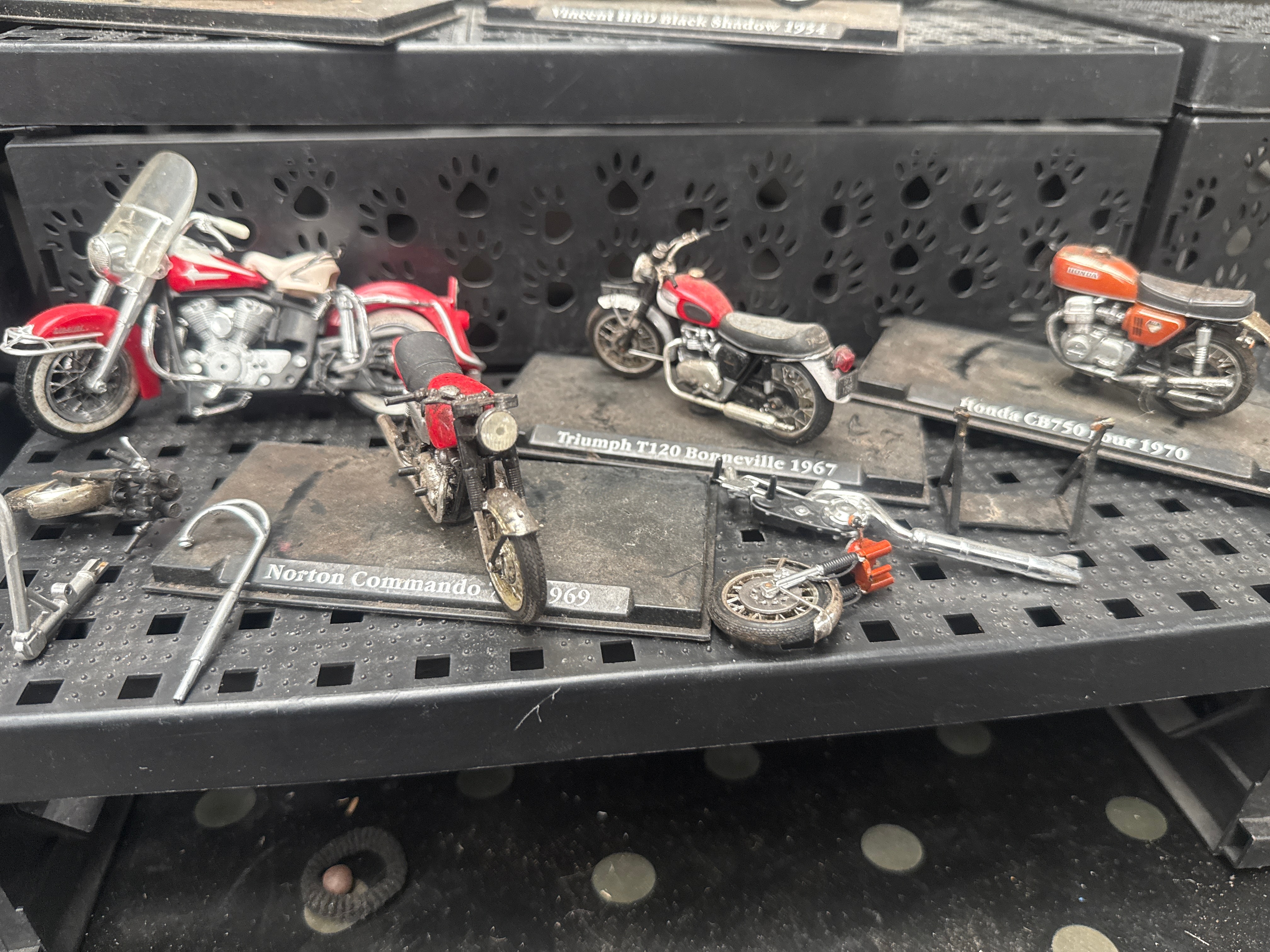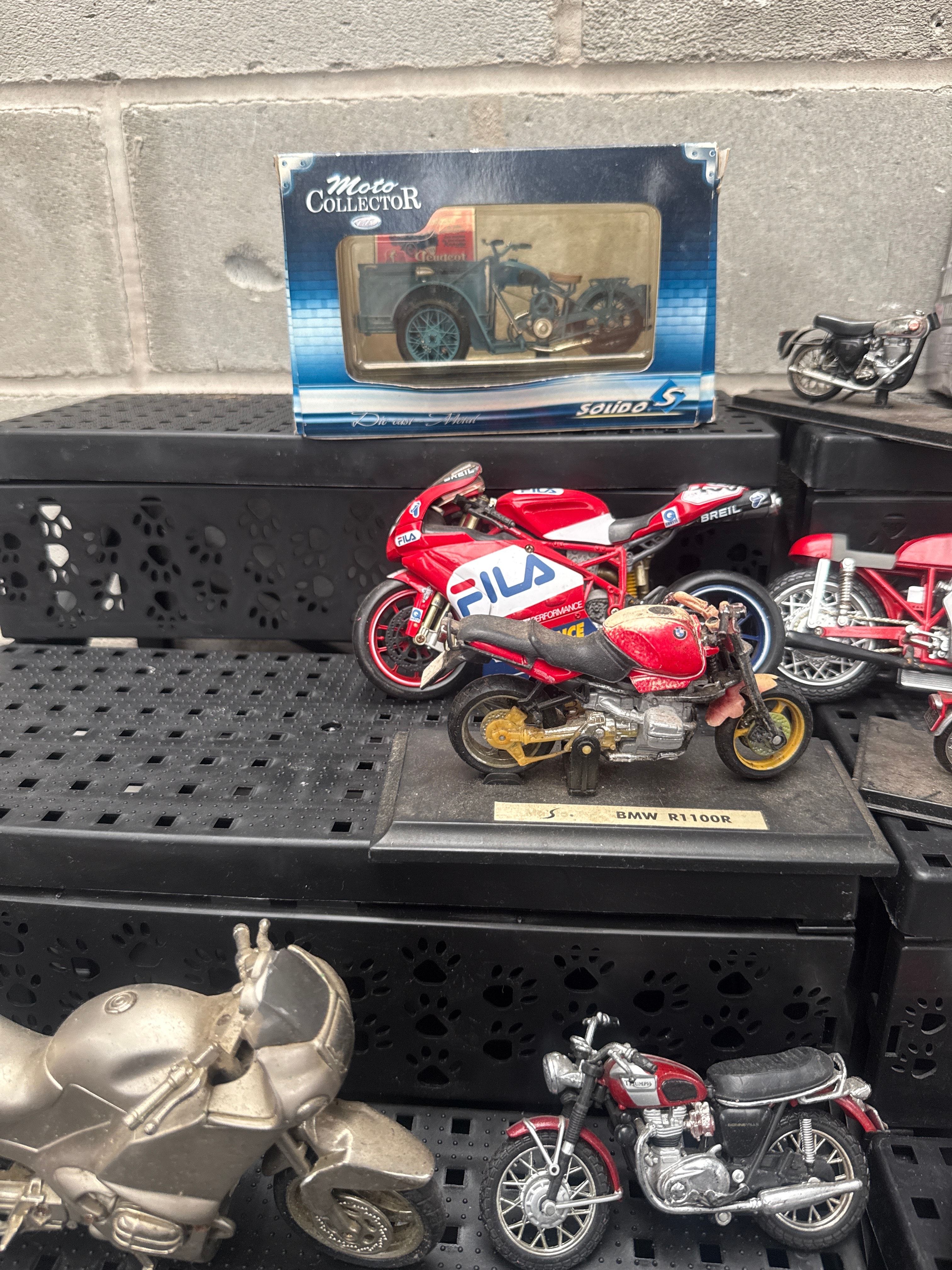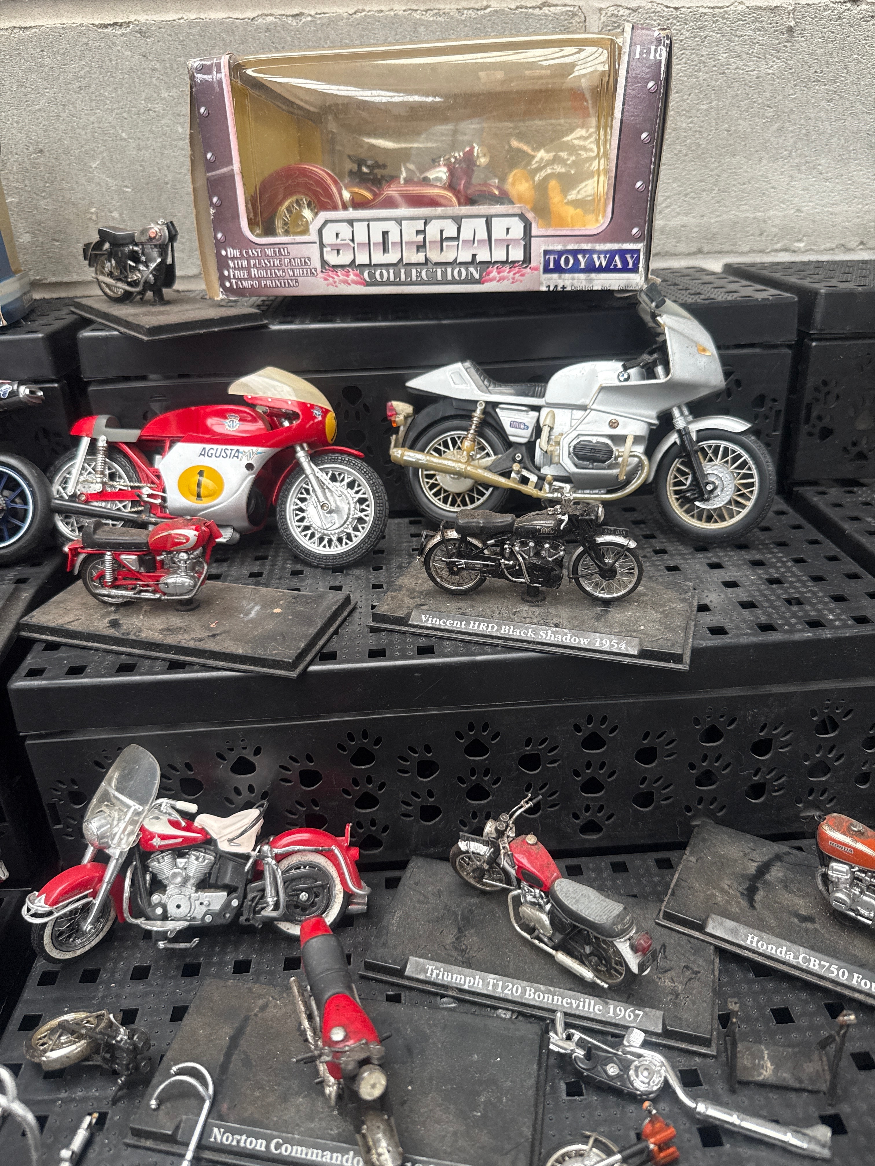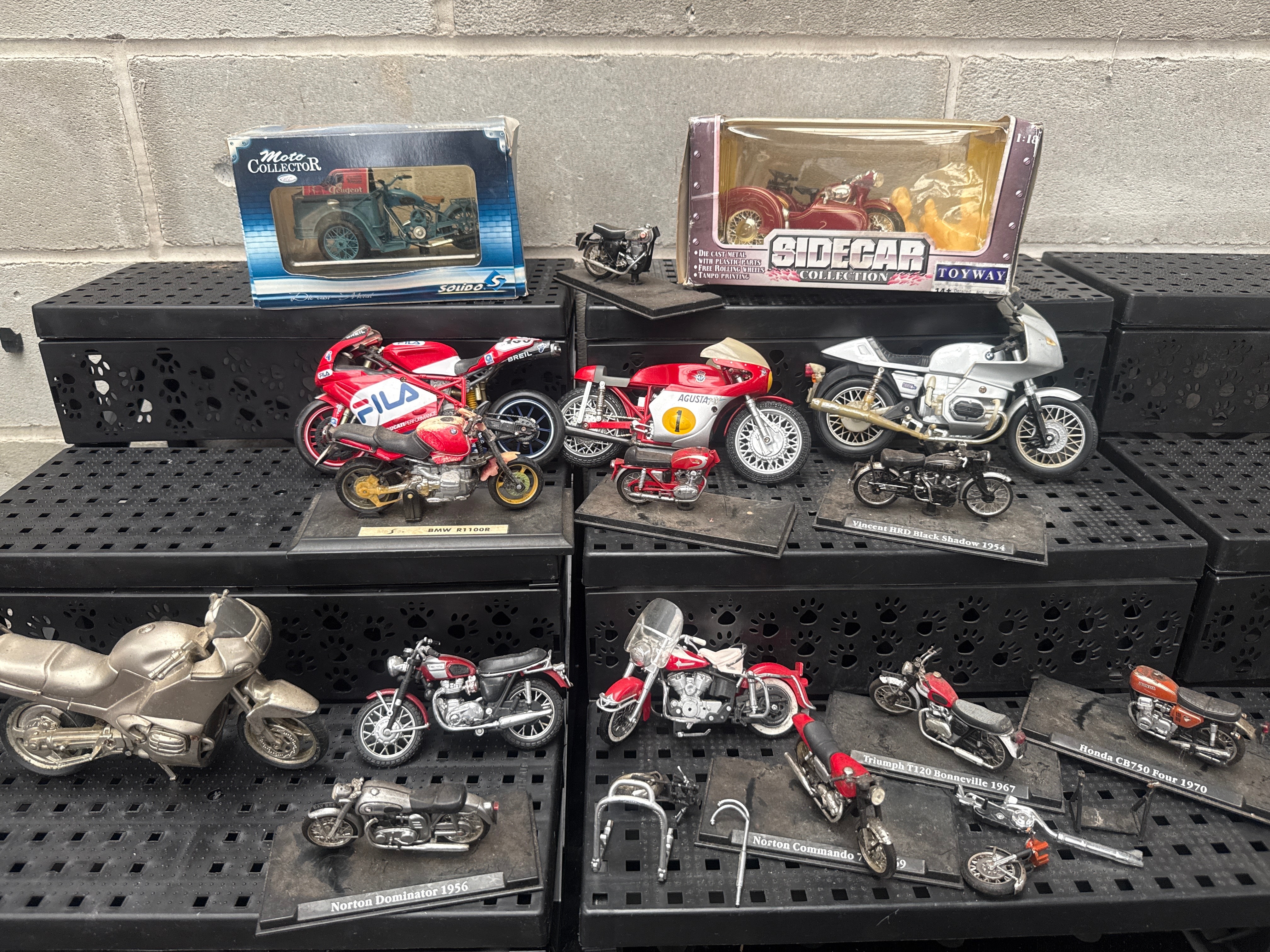 A collection of approximately two dozen vintage-style motorcycle and sidecar scale models, primarily constructed from die-cast metal and plastic. The collection includes models by manufacturers such as Maisto, MotorMax, Schuco, and Toy Way, with most items presented on individual black display stands. Two models are in their original packaging: one “Moto Collector” box by Schuco features a motorcycle with a utility sidecar, and another “Sidecar Collection” box by TOY WAY contains a red motorcycle and sidecar, both marked 1:18 scale. Visible labels identify specific models and years, including a Fila-branded model, an Agusta-branded model, a BMW R1100R, a Vincent HRD Black Shadow 1954, a Norton Dominator 1956, a Triumph T120 Bonneville 1967, a Honda CB750 Four 1970, and a Norton Commando 1969.