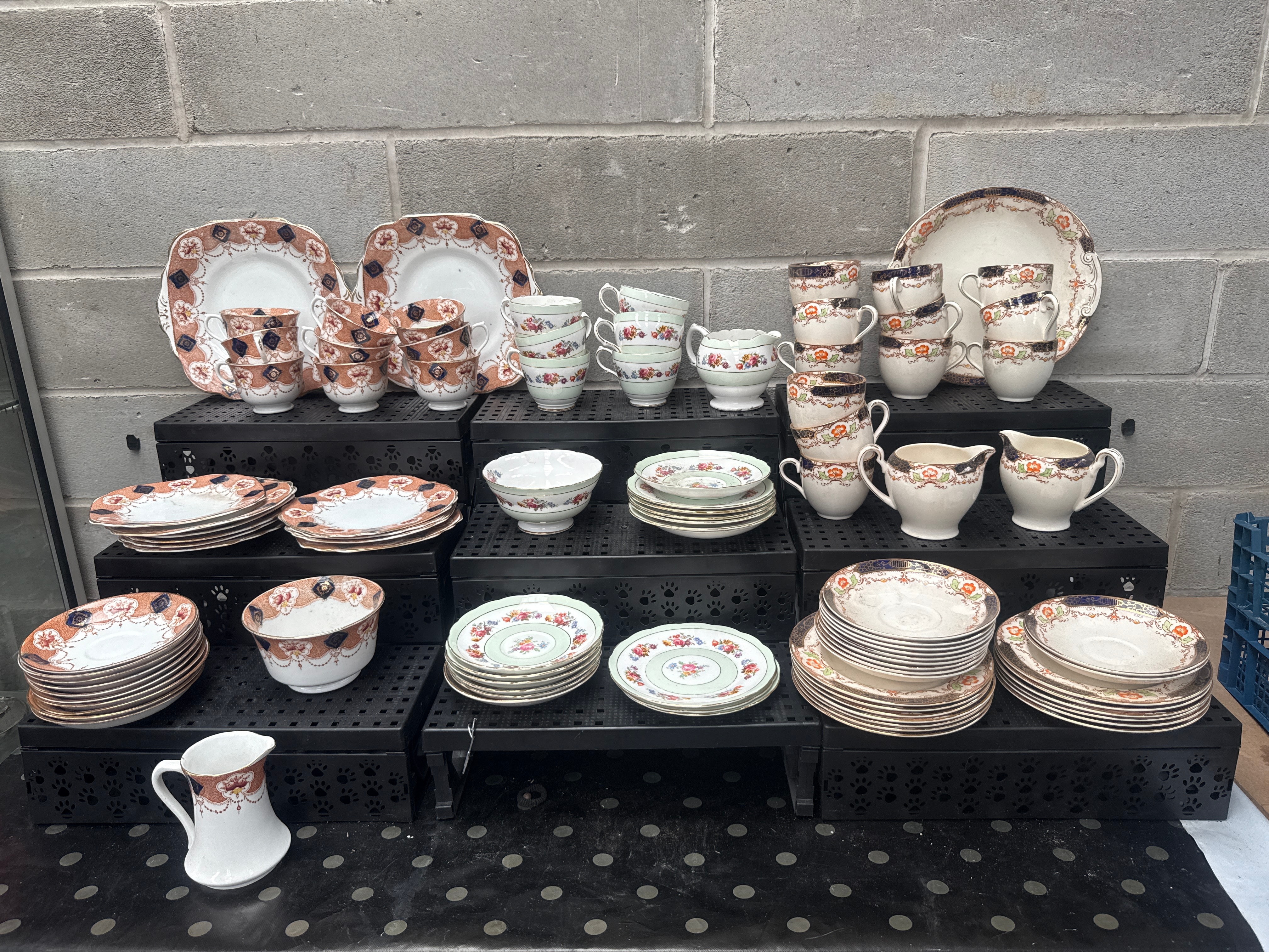 A collection of ceramic tableware, primarily comprising items in the Wedgwood ‘Kashmar’ pattern. The predominant pattern features an intricate border in terracotta/orange and dark blue with geometric and stylized floral designs, accented by extensive gold gilding, appearing on various plates (including square and round forms), saucers, cups, serving dishes, pitchers, and creamers. A second, lighter pattern showcases a pale green border with vibrant central floral bouquets and smaller floral sprays, also highlighted with gold accents, present on cups, saucers, and plates. All items appear to be glazed ceramic, consistent with earthenware or porcelain. No manufacturer’s marks or textual inscriptions are clearly visible.