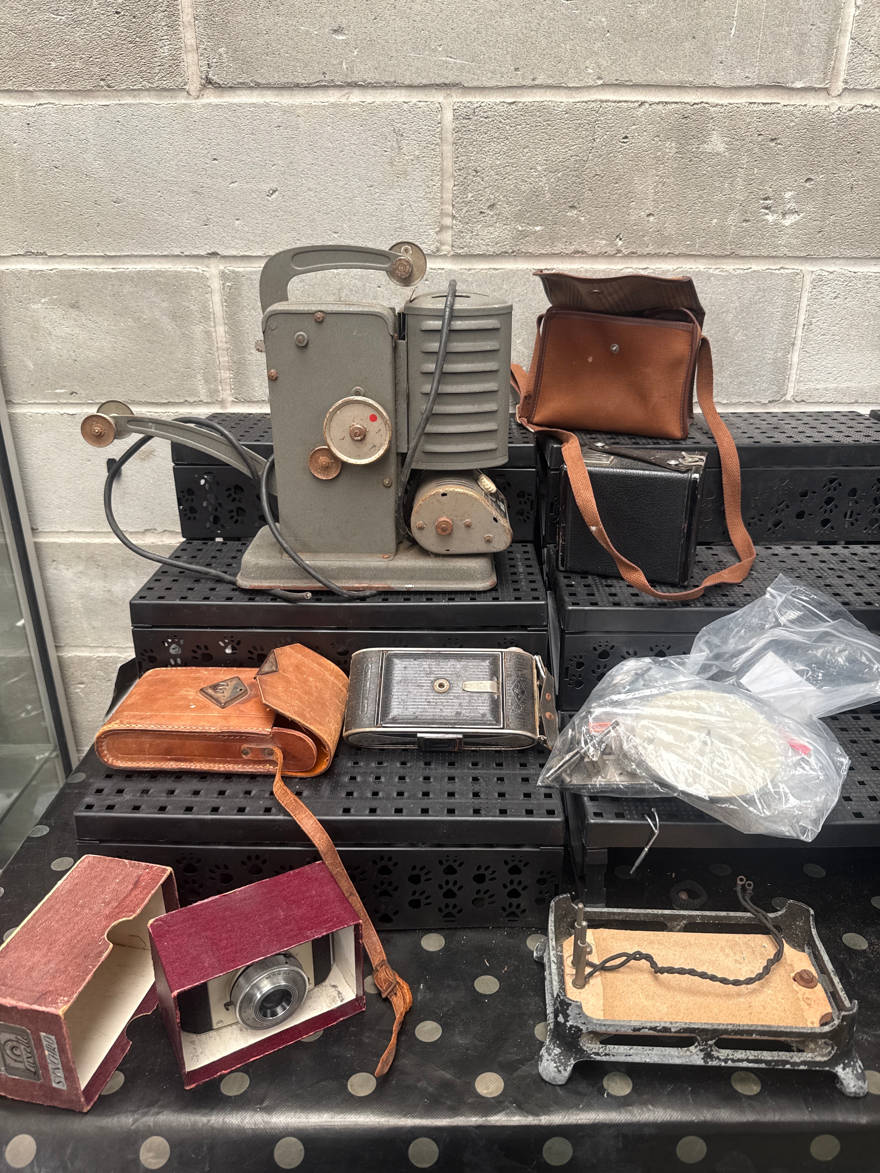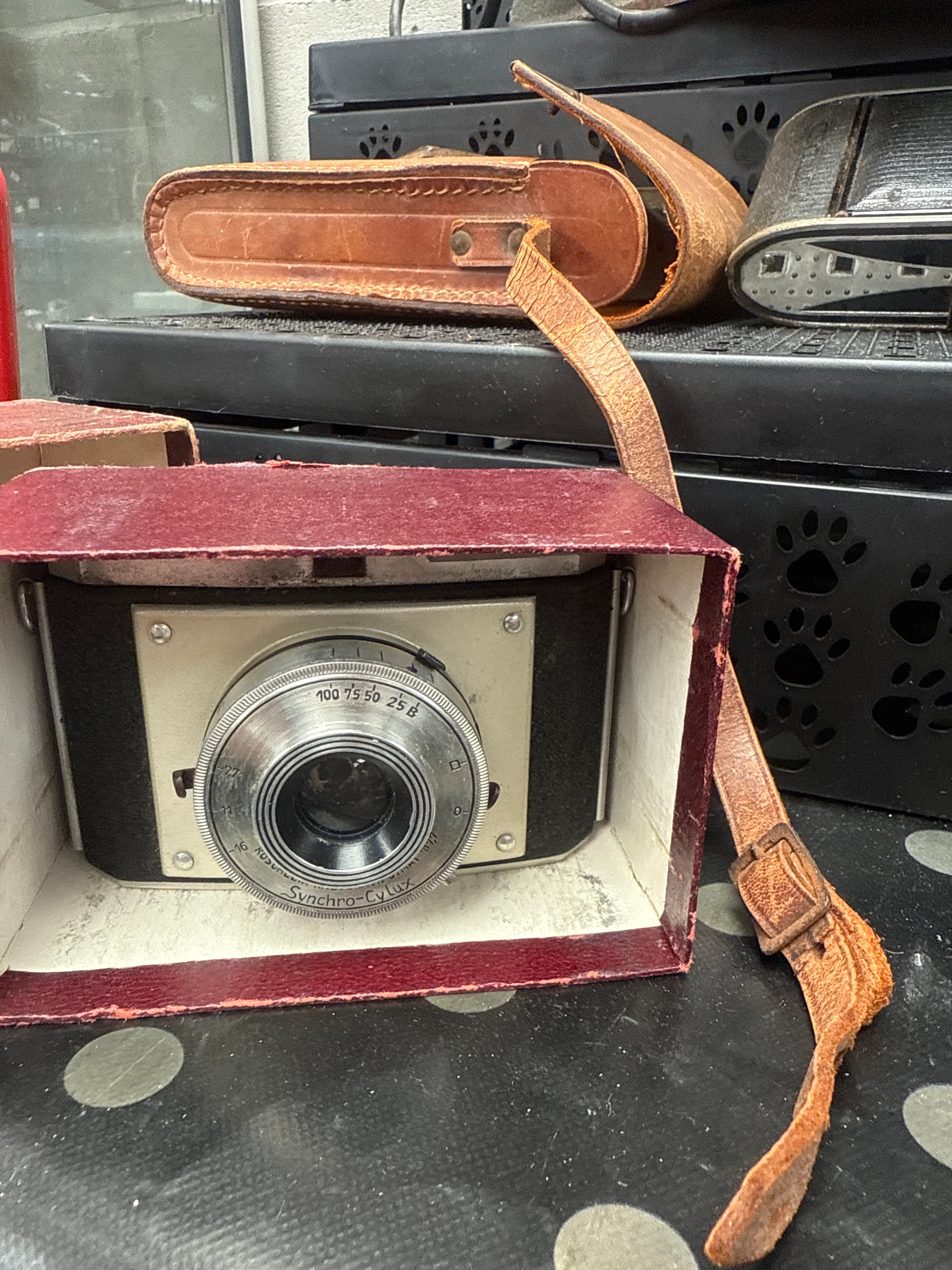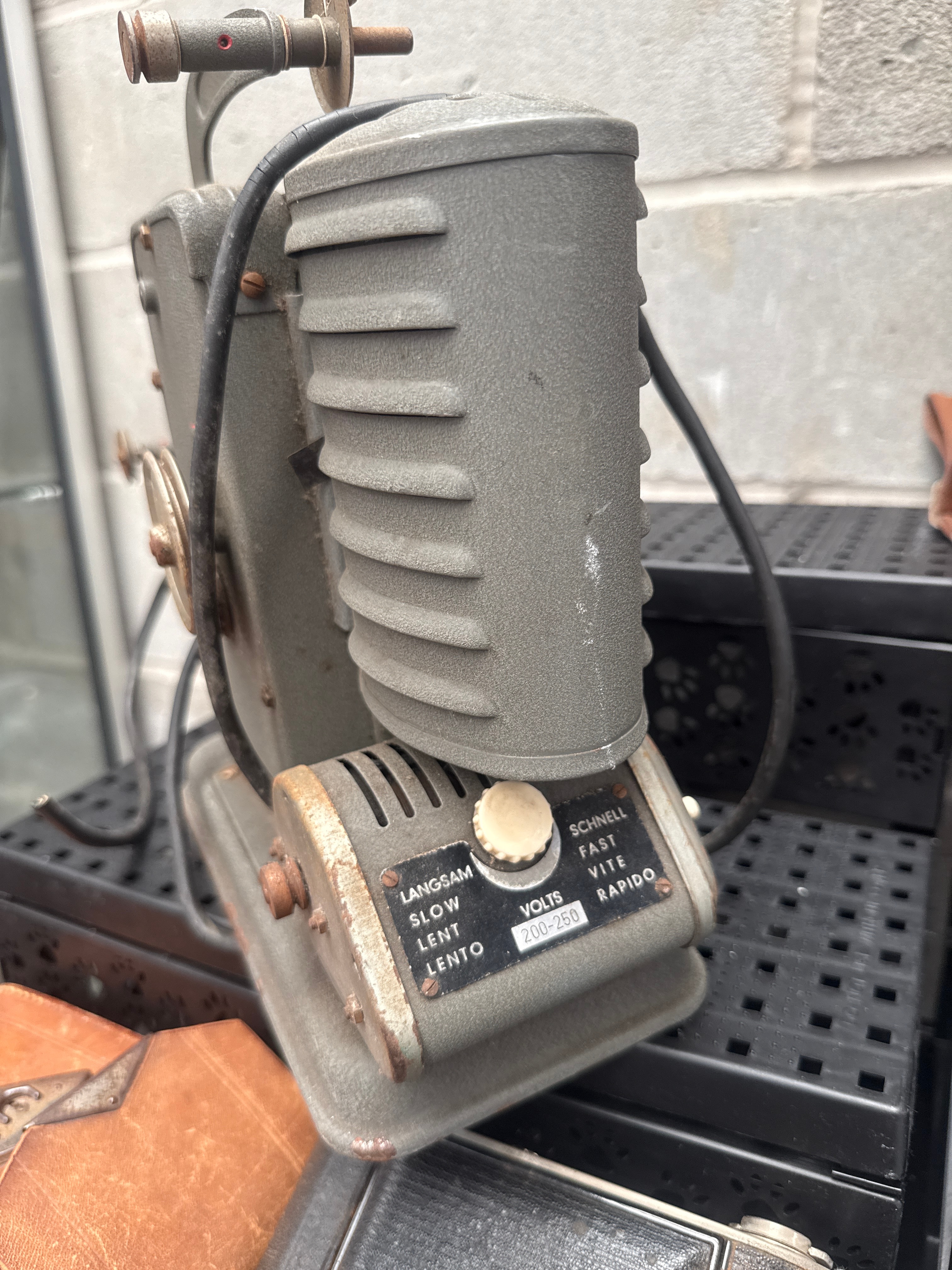 A vintage Golde Film Slide Projector, grey-painted metal, featuring spools, cooling fins, and a control knob. A visible label on the projector displays speed settings in multiple languages: “LANGSAM SLOW LENT LENTO” (Slow) and “SCHNELL FAST VITE RAPIDO” (Fast), alongside “VOLTS 200-250”. Accompanying items include two worn brown and black leather camera cases, a black folding bellows camera, and a compact camera with a chrome-finished lens barrel marked “SYNCHRO-CULT” and numbered settings (100, 75, 56, 25 B), presented in an open red cardboard box. A plastic-bagged round object and a dark metal frame with a wooden base and cord are also part of the grouping.
