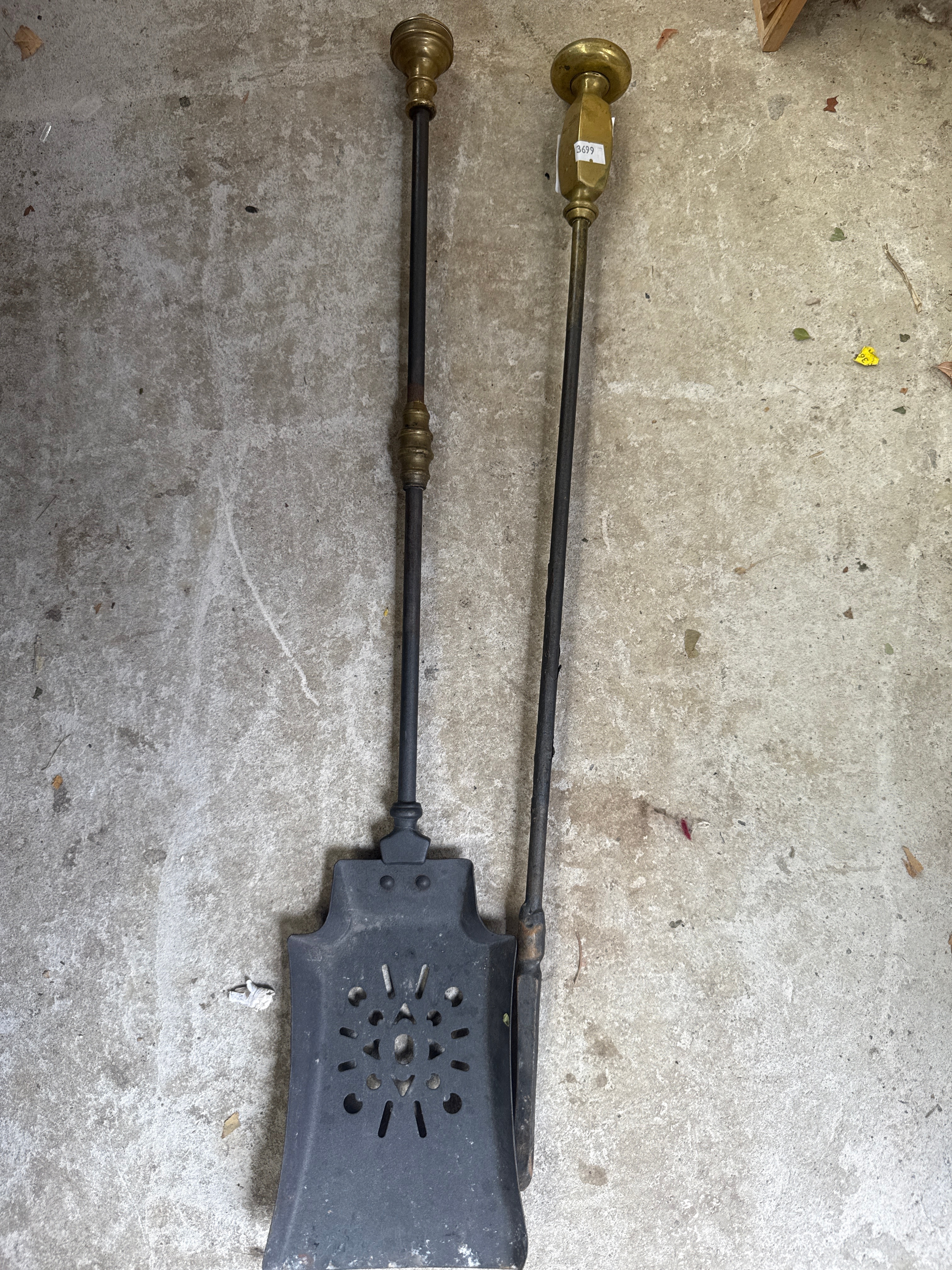 A pair of 18th Century Dutch brass and iron fireplace tools, comprising a shovel and a poker. Each tool features a brass handle and a dark metal shaft and implement. The shovel is fitted with a cast-metal blade displaying an intricate, openwork radial design incorporating various geometric shapes. The poker features a hexagonal-faceted brass handle, to which a white label with the number ‘3699’ is adhered.