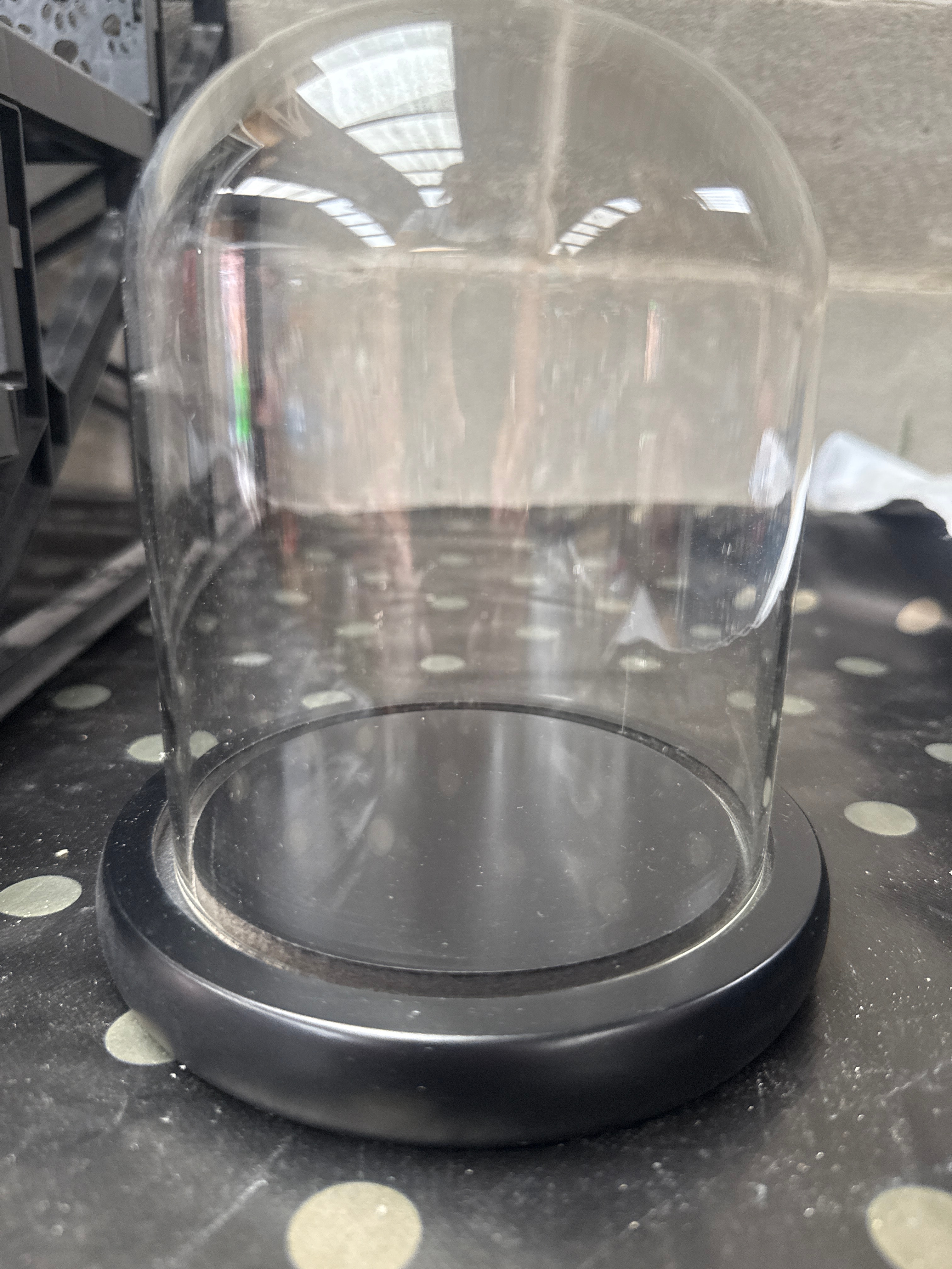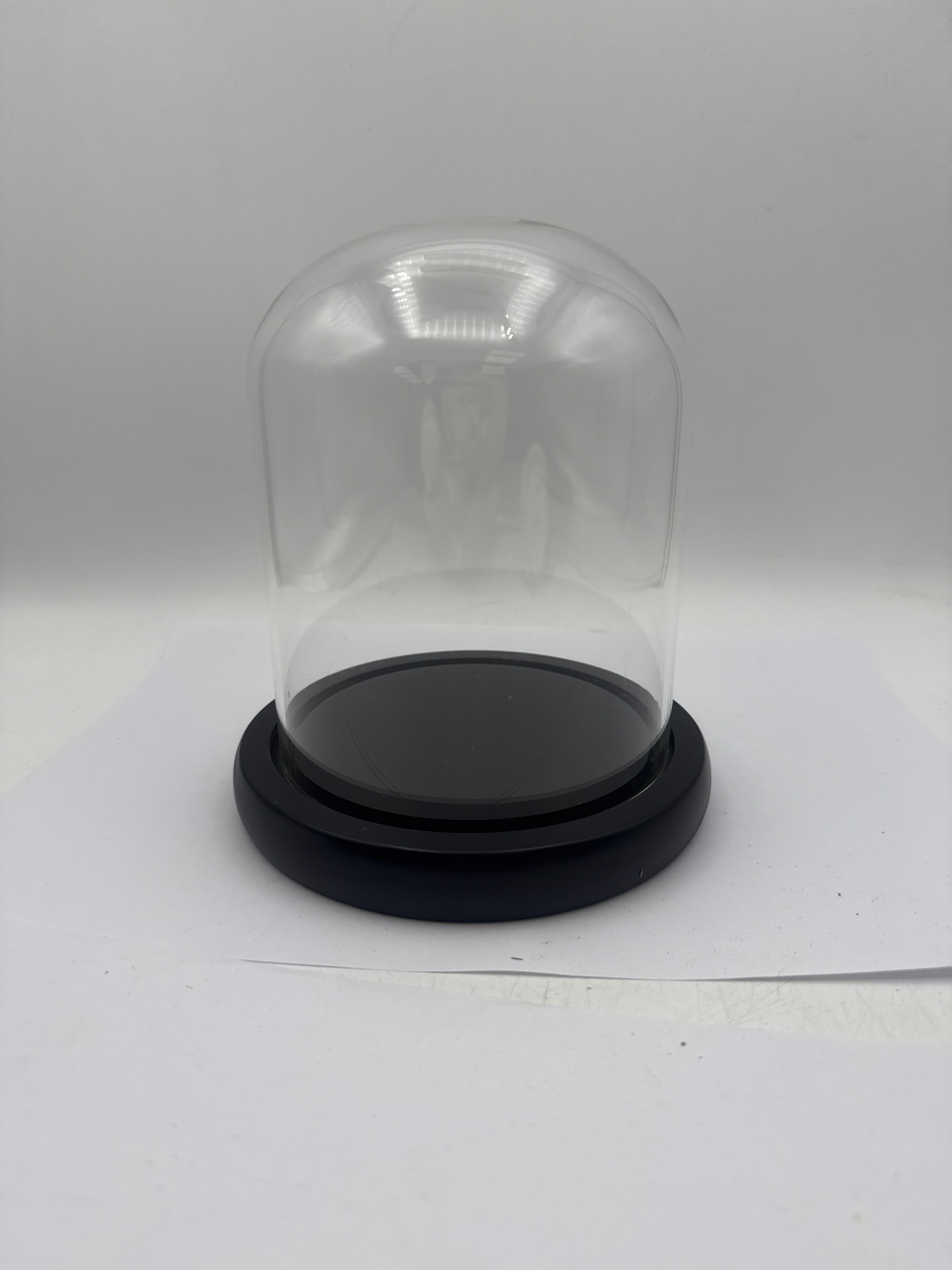 A contemporary display cloche comprising a clear, bell-shaped glass dome, confirmed to be Glass, fitted into a round, flat black base. The base appears to be a solid material, possibly MDF wood or composite, with a matte finish. No visible text, markings, or manufacturer’s stamps are discernible.