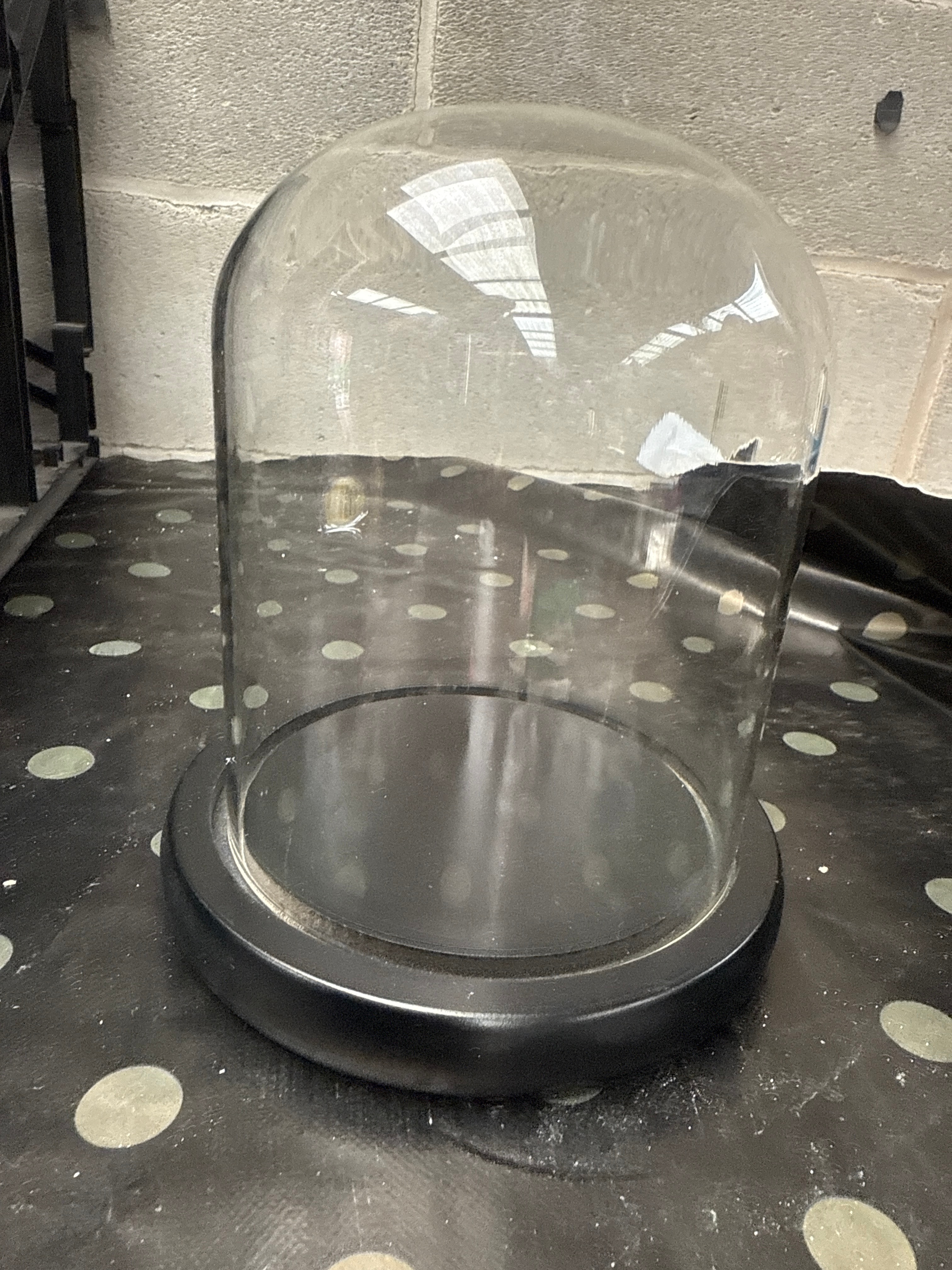 A clear glass display cloche or bell jar, comprising a simple, rounded glass dome fitted into a circular, dark-colored base with a matte finish, likely constructed from painted wood or a composite material. The utilitarian design suggests a modern or contemporary style, devoid of ornate decoration. No visible text, maker’s marks, or distinct period identifiers are discernible.