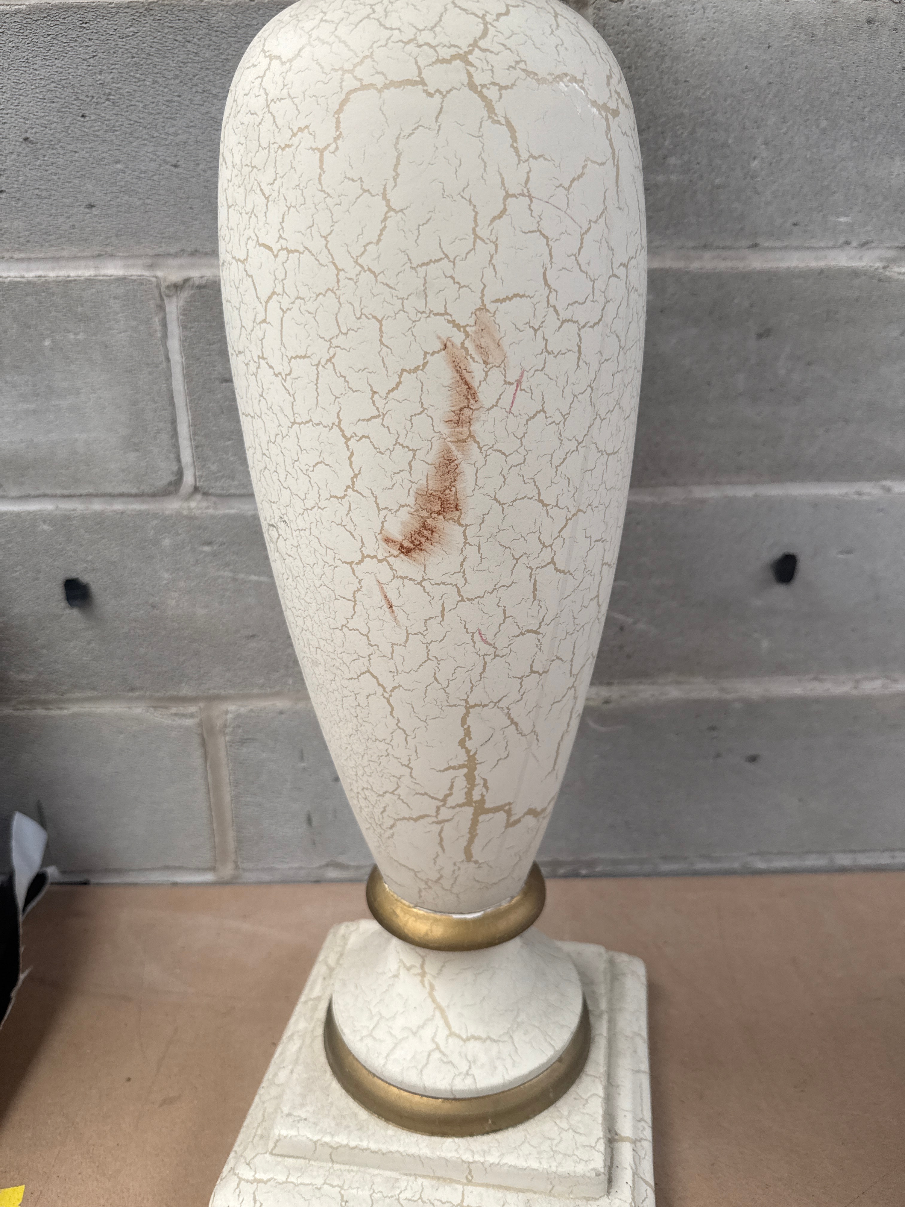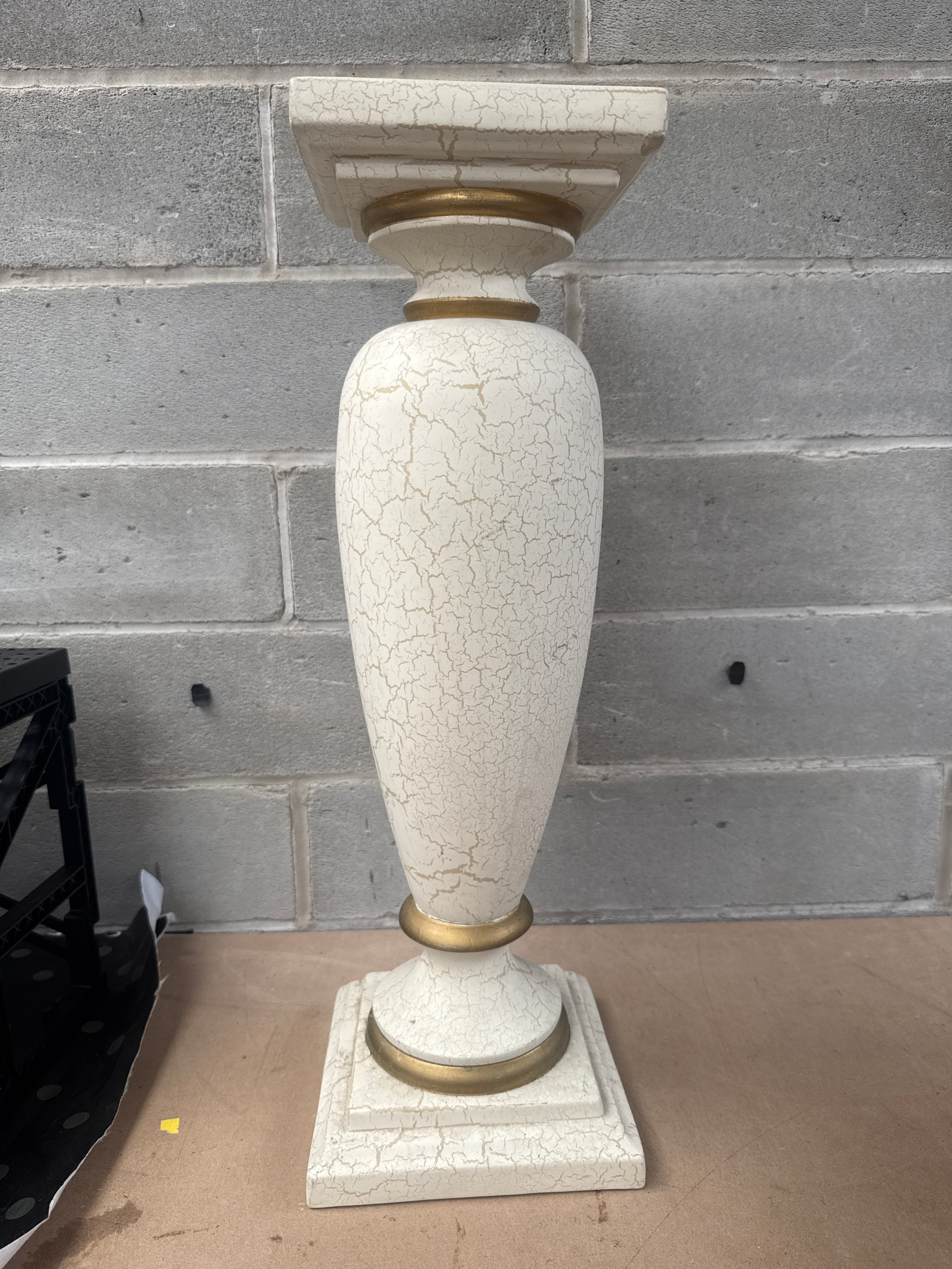 A decorative pedestal stand, crafted from ceramics, featuring a tapered central body with a square stepped base and a square stepped capital. The piece is finished in an off-white or cream color with a deliberate craquelure effect, accented by gold-painted bands at the neck and base. No visible text or markings are present.