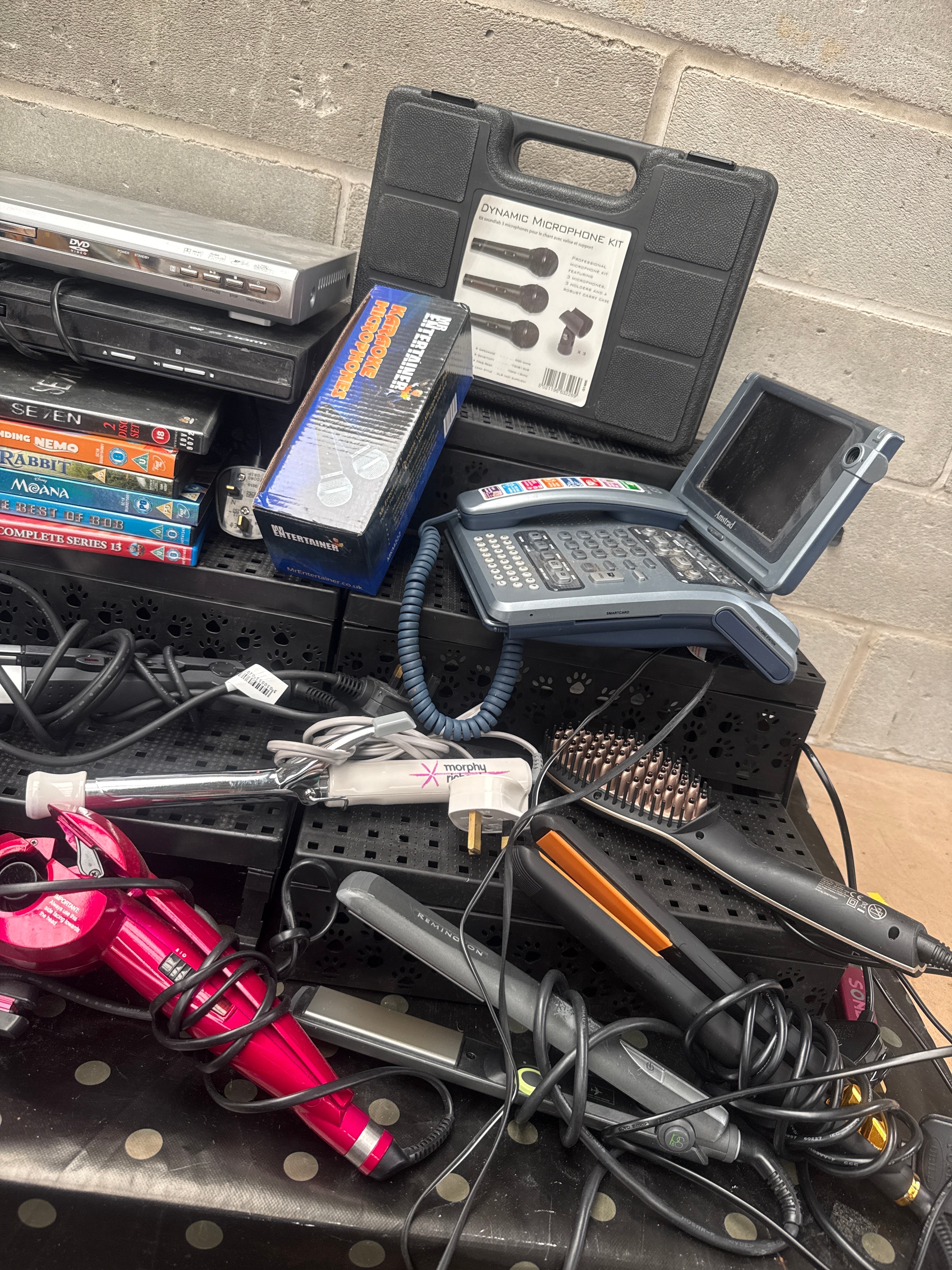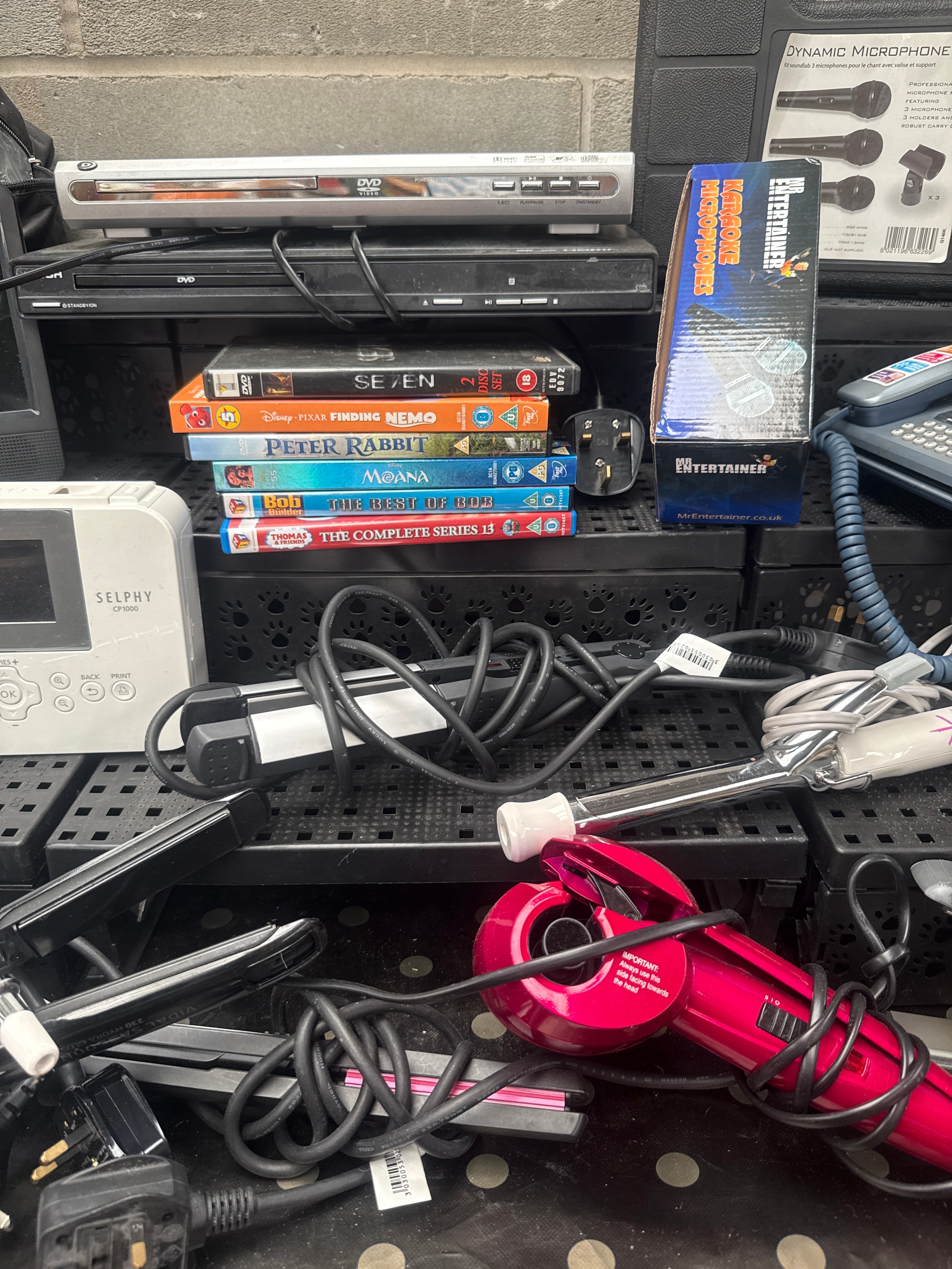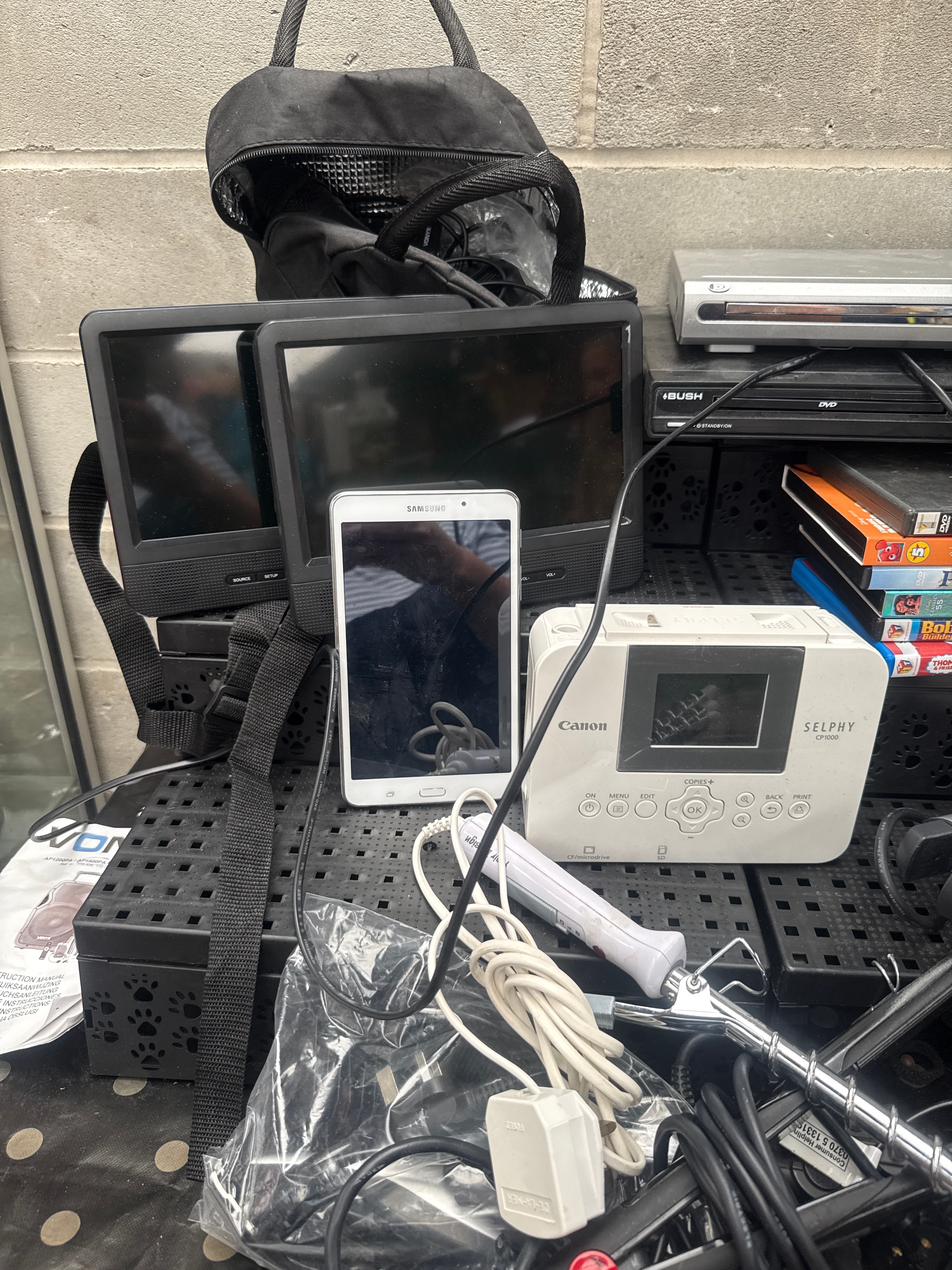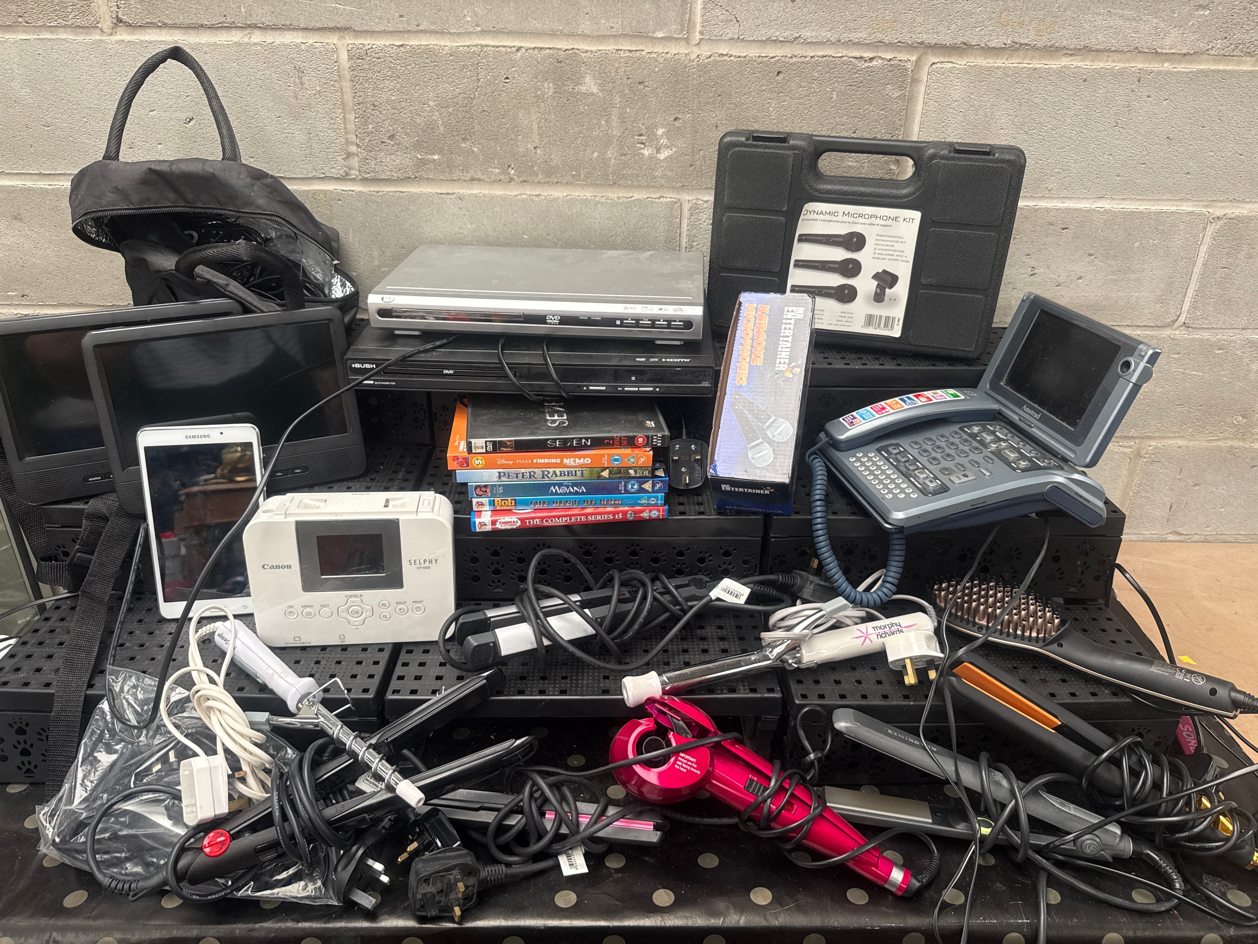 This lot comprises a diverse collection of used consumer electronics and personal care appliances, predominantly dating from the 2000s-2010s. Included are two black portable media players, identified through web intelligence as Audiovox (ADV12) D1210 12” Portable LCD Monitor DVD/MP3 Combo Bundles. Also present is a white Samsung tablet and a white Canon Selphy CP1000 compact photo printer. Entertainment electronics feature a silver DVD player and a black Bush-branded DVD player, accompanied by a stack of seven DVDs including “SE7EN,” “Finding Nemo,” “Moana,” “Peter Rabbit,” “Bob the Builder,” and “Thomas the Tank Engine.” Audio equipment consists of a “DYNAMIC MICROPHONE KIT” in a black hard case and a “MrEntertainer” branded microphone box. A blue-grey BT-branded landline telephone with an integrated screen is also present. Personal care items include Remington-branded hair straighteners, a red automatic hair curler, and a metal-bristled brush. The collection is completed by a multitude of tangled power cables and adapters, primarily with UK plugs.