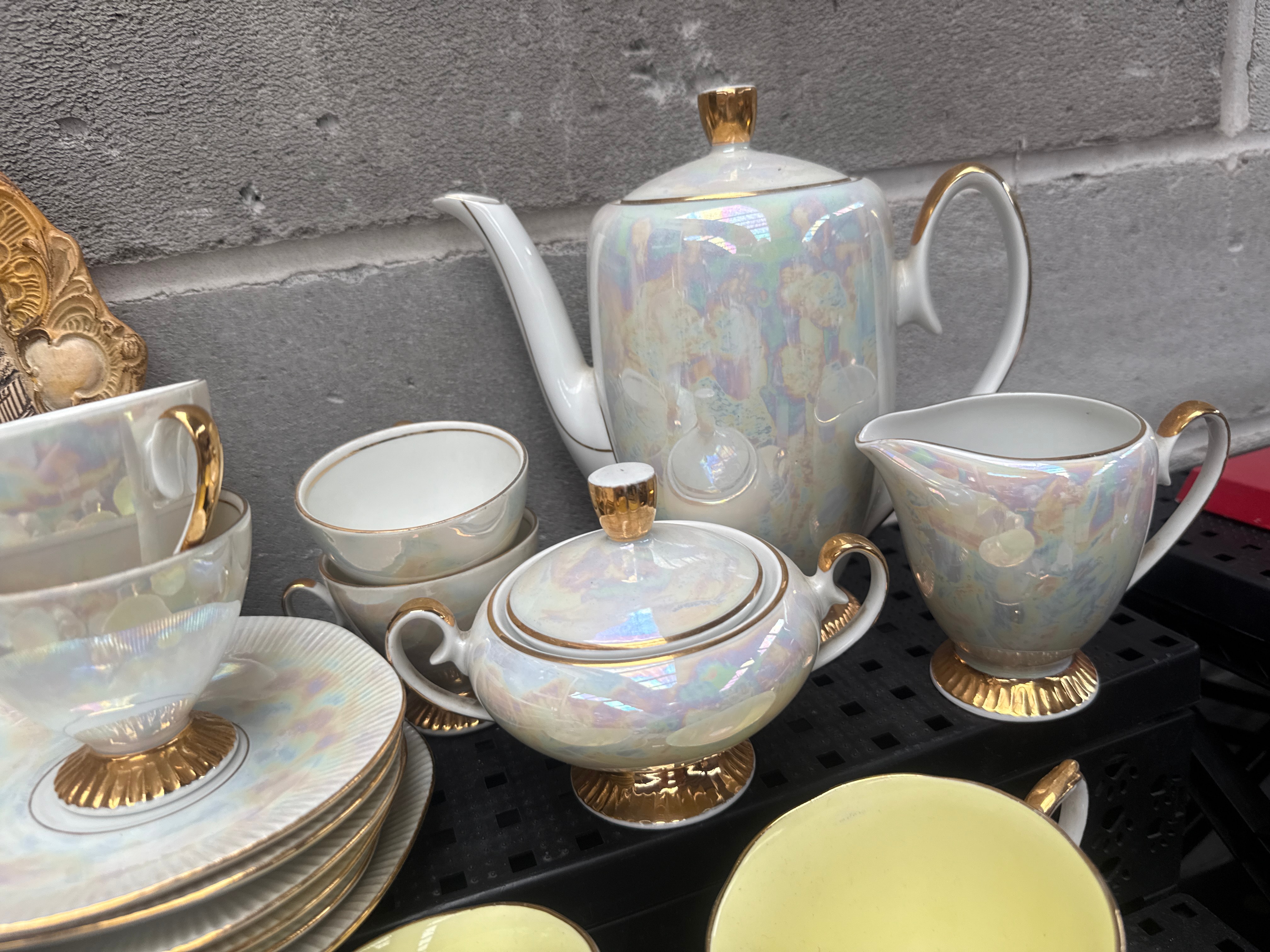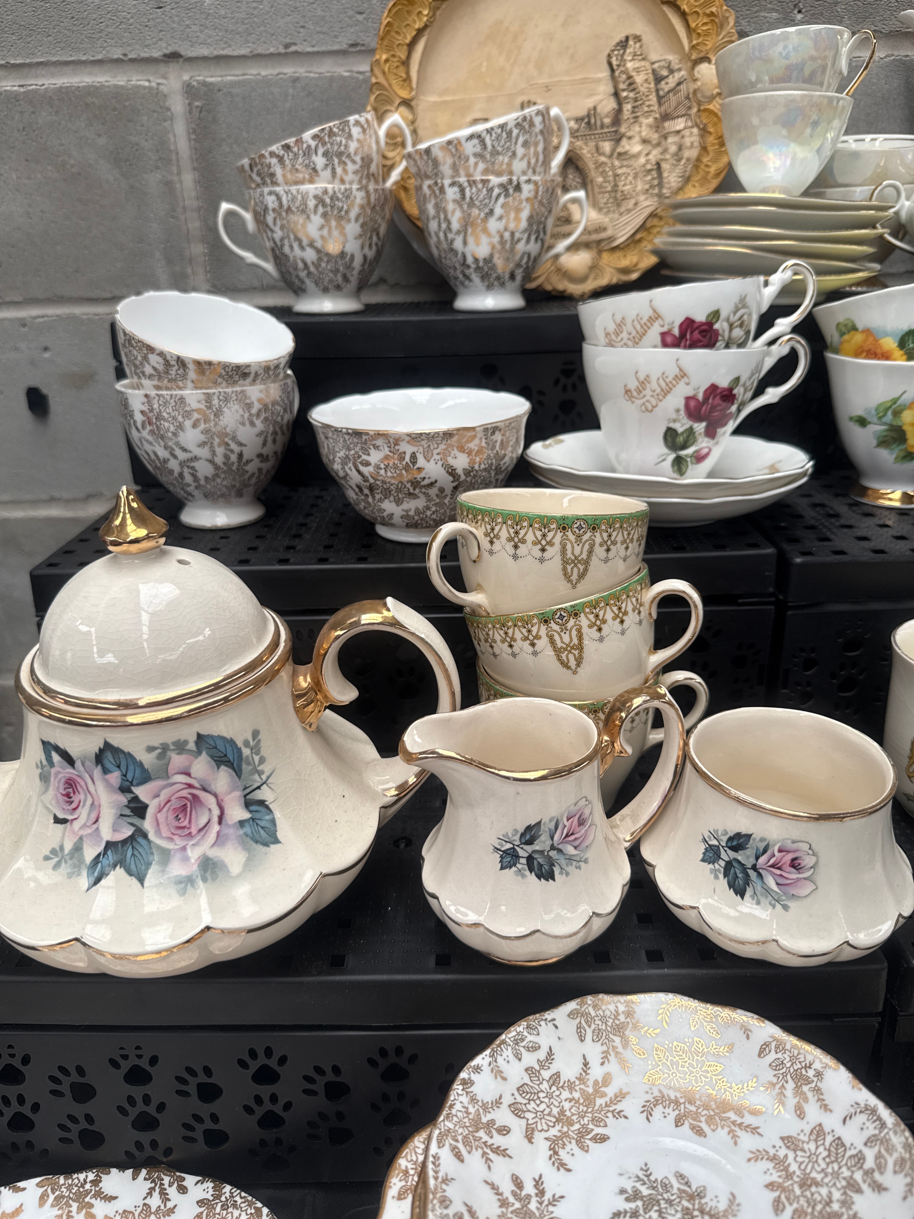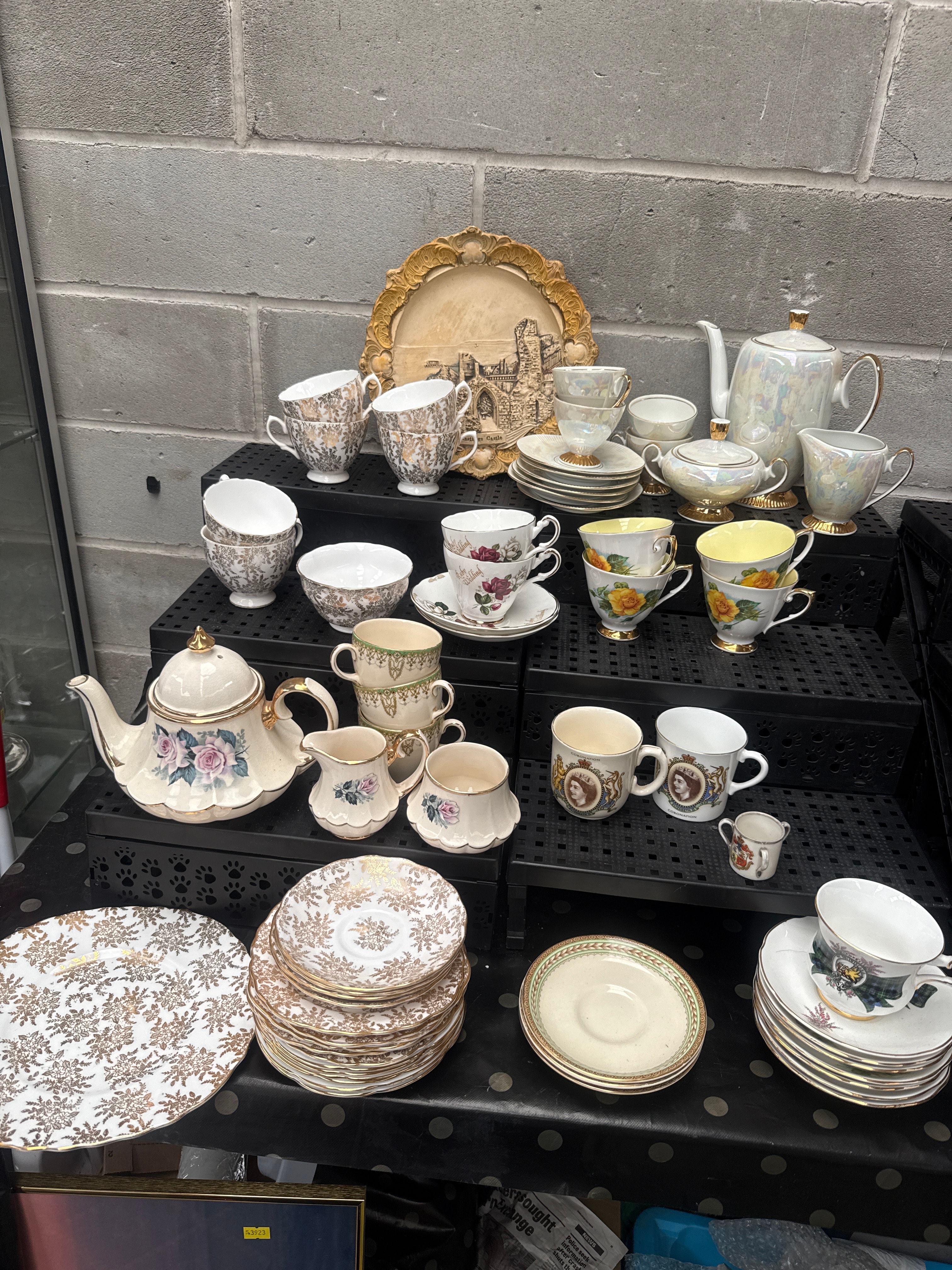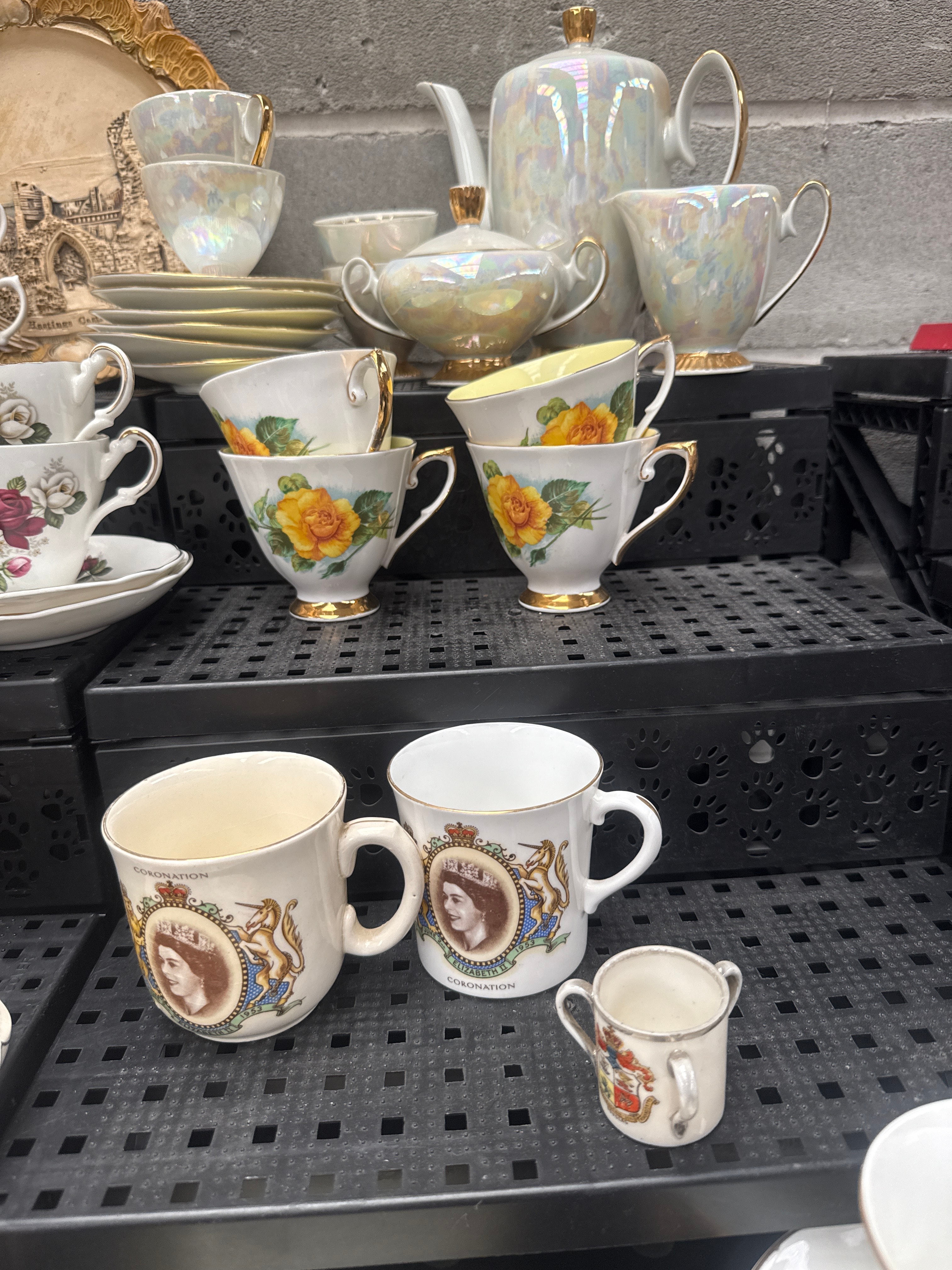A diverse collection of vintage ceramic tea and dinnerware, primarily appearing as porcelain or fine china. The collection encompasses numerous teacups and saucers, teapots, sugar bowls, creamers, bowls, and decorative plates, alongside a small framed plaque with a relief architectural scene. Styles vary significantly, featuring intricate gold filigree patterns, an array of vibrant floral motifs including pink and red roses, and yellow flowers, and a distinctive set with an iridescent pearlescent glaze. Prominently visible are two commemorative cups with a portrait of Queen Elizabeth II and the English text “CORONATION,” indicating a mid-20th century origin, likely 1953, for these specific items.