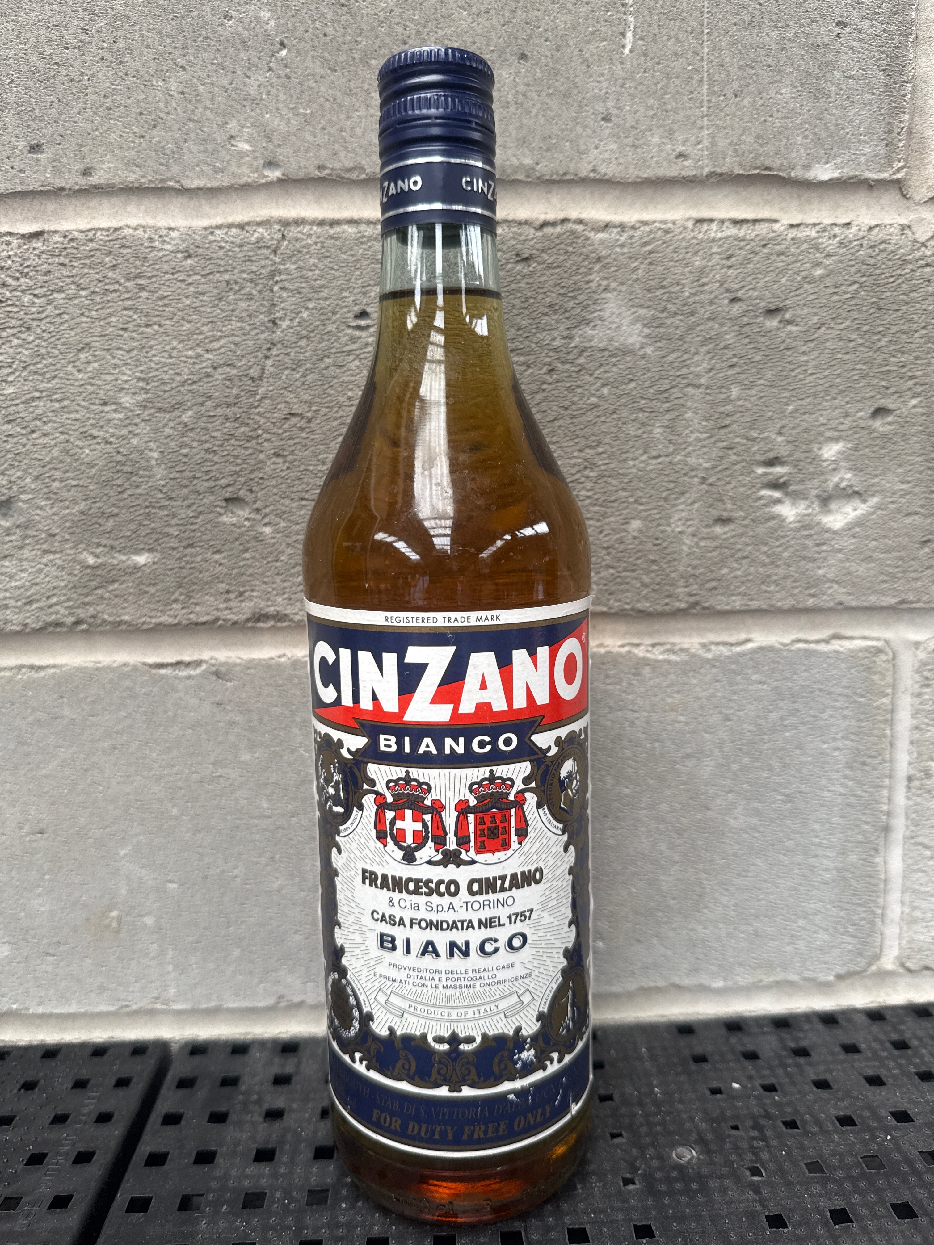 A vintage full, clear glass bottle of Cinzano Bianco Vermouth, sealed with a dark blue ridged metal screw cap featuring “CINZANO” text. The primary paper label is in a traditional style with red, white, and dark blue elements, prominently displaying “CINZANO” and “BIANCO.” Further visible text includes “REGISTERED TRADE MARK,” “FRANCESCO CINZANO & C.ia S.p.A. – TORINO,” “CASA FONDATA NEL 1757” (House founded in 1757), “PROVVEDITORI DELLE REALI CASE D’ITALIA E PORTOGALLO E PREMIATI CON LE MASSIME ONORIFICENZE” (Suppliers to the Royal Houses of Italy and Portugal and awarded with the highest honors), “PRODUCE OF ITALY,” and “FOR DUTY FREE ONLY.” The label is embellished with two crowned heraldic crests and decorative vignettes. The liquid inside the bottle has a clear, yellowish-brown appearance. The bottle contains 100cl (1 Litre) of vermouth with an alcohol content of 16.5%.