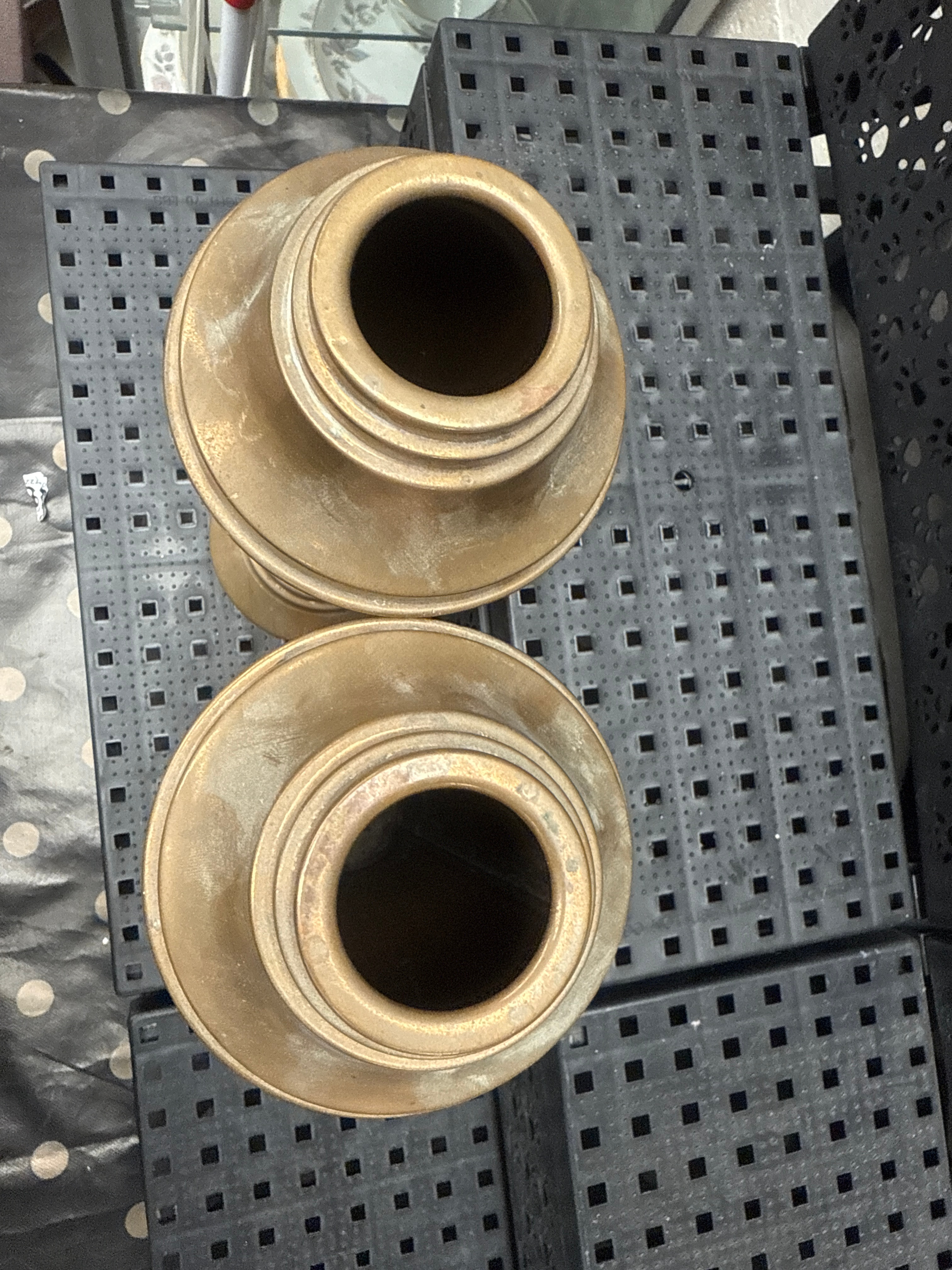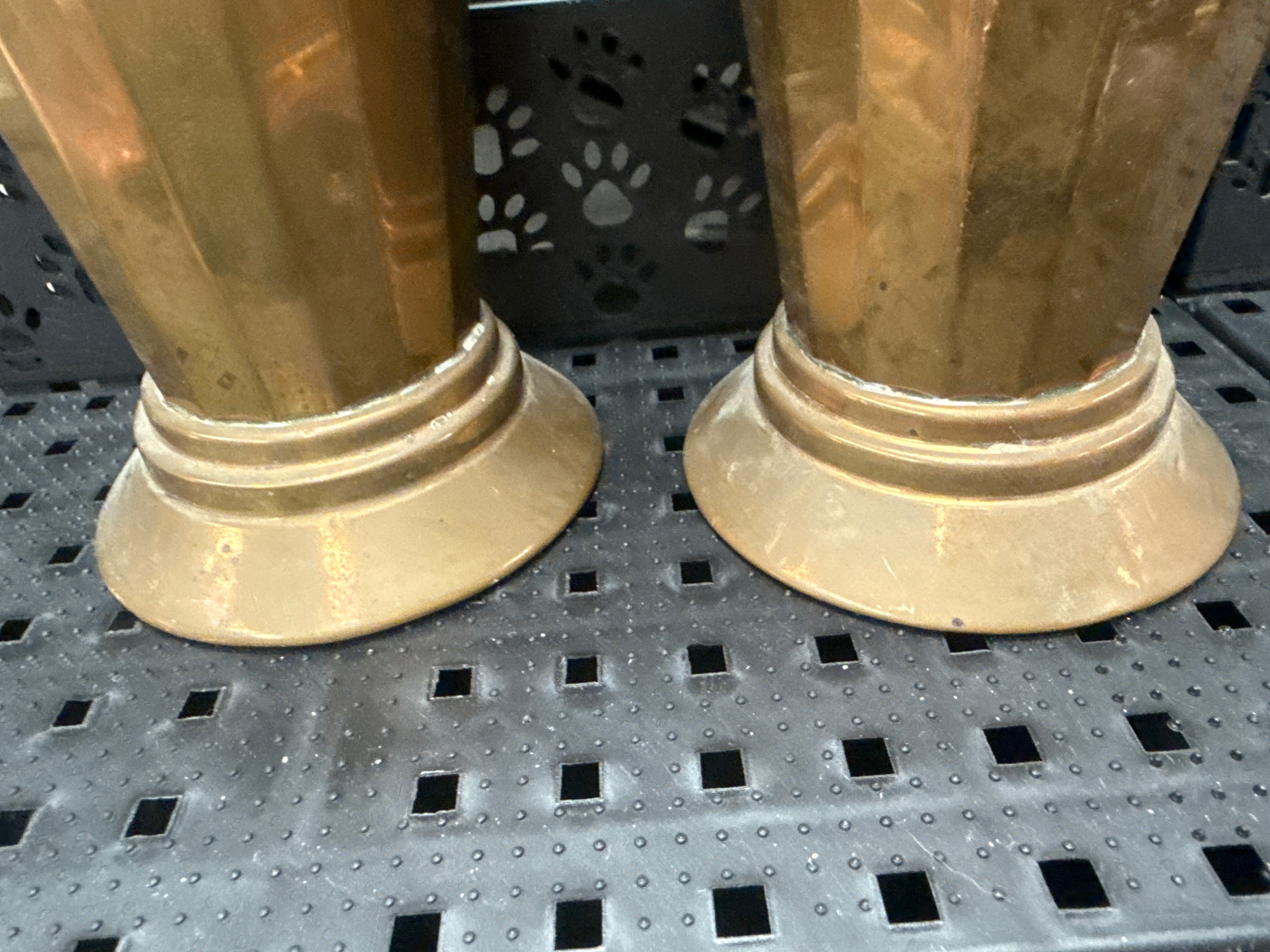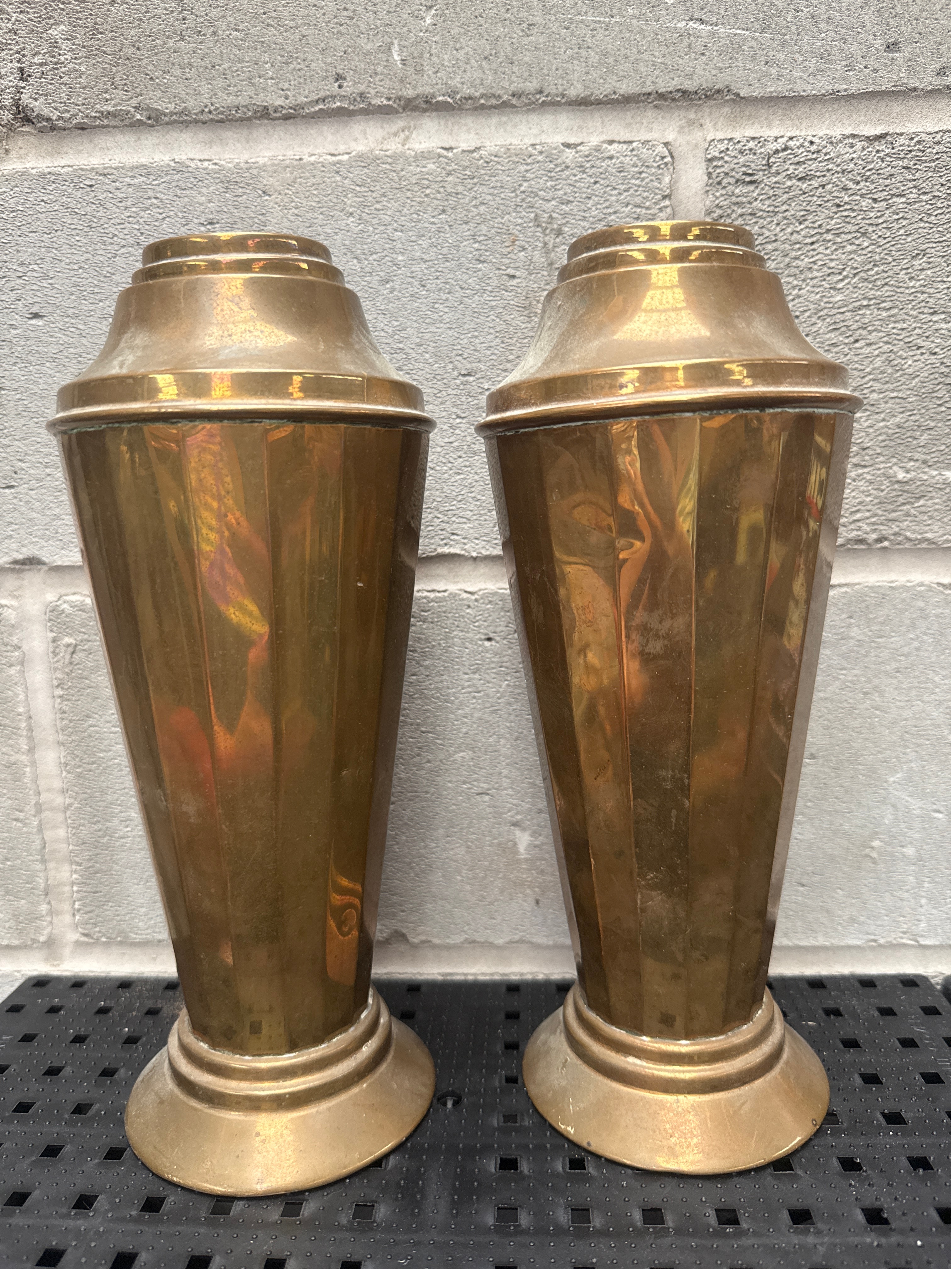 A pair of vintage brass vases, each featuring a tapered, faceted body resting on a stepped circular base and culminating in a stepped, conical top with a central opening. The design exhibits a geometric style.
