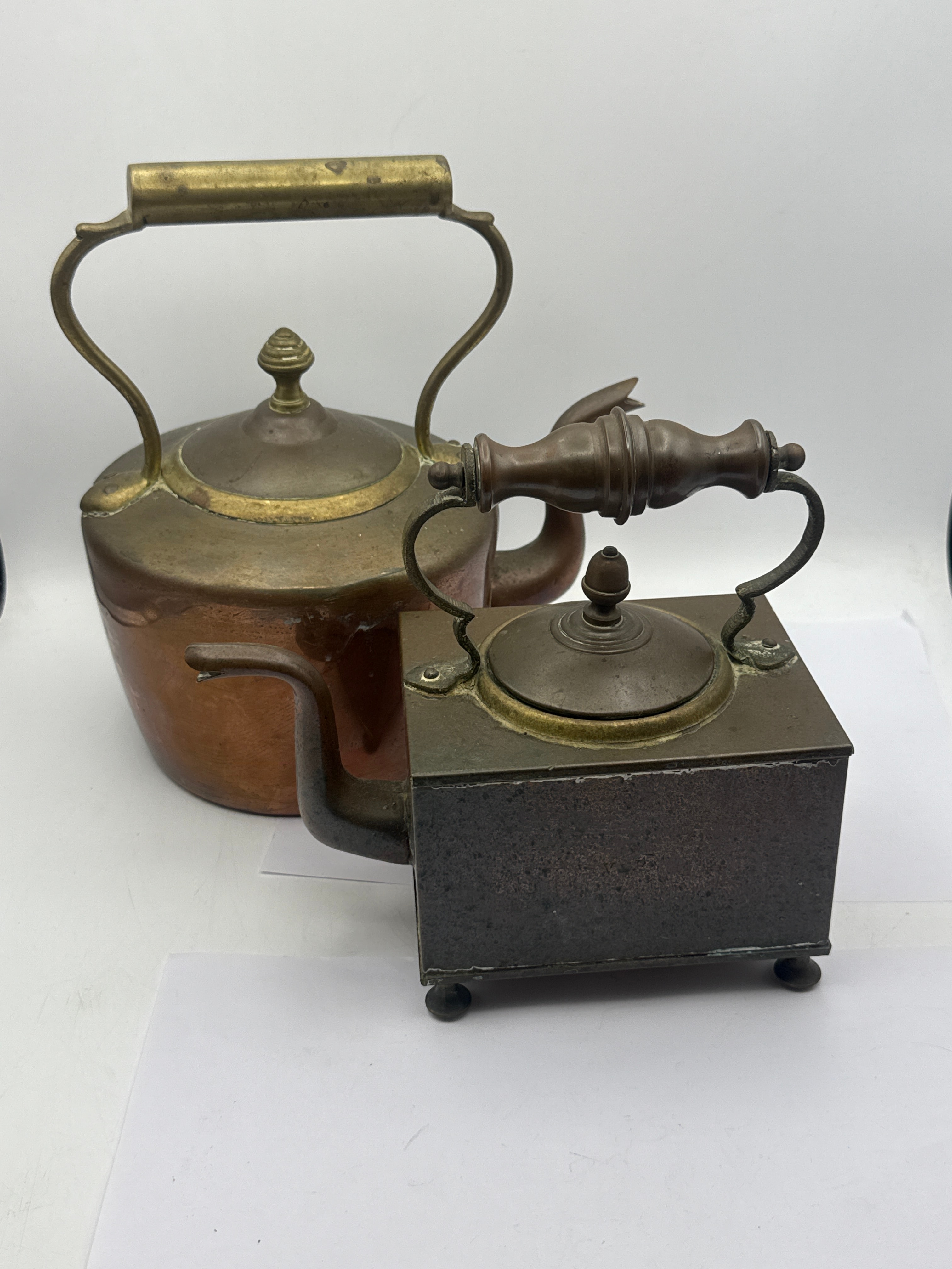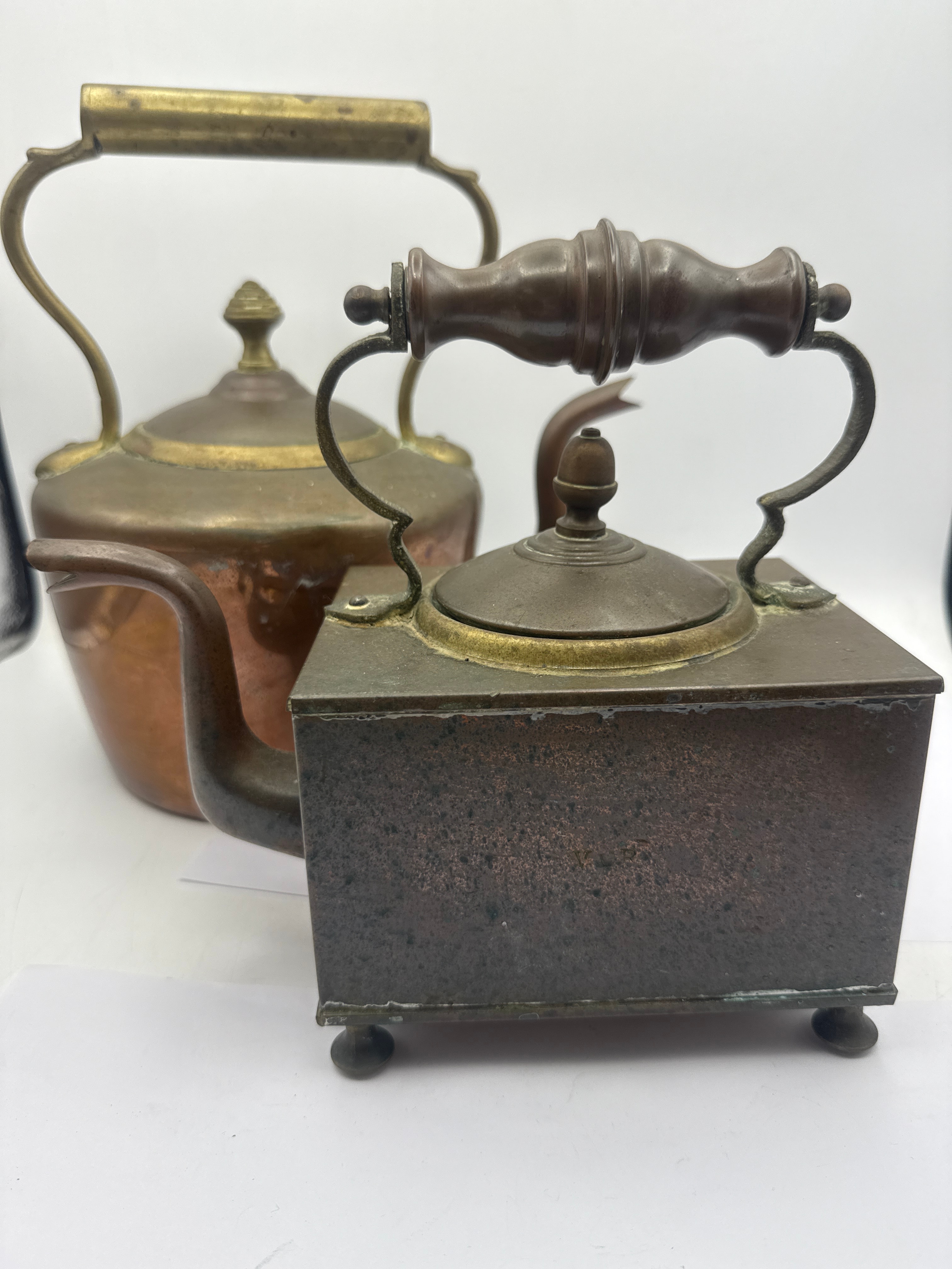 A pair of 19th Century kettles. The larger example is a traditional copper kettle with a bulbous body, a curved spout, and a hinged brass handle with a central brass grip, topped by a brass finial on the lid. The smaller item is a distinctively square-bodied kettle, possibly a spirit lamp or miniature travel kettle, constructed from patinated brass or bronze, featuring a short spout, a swing handle with a turned wooden grip, and four small feet.