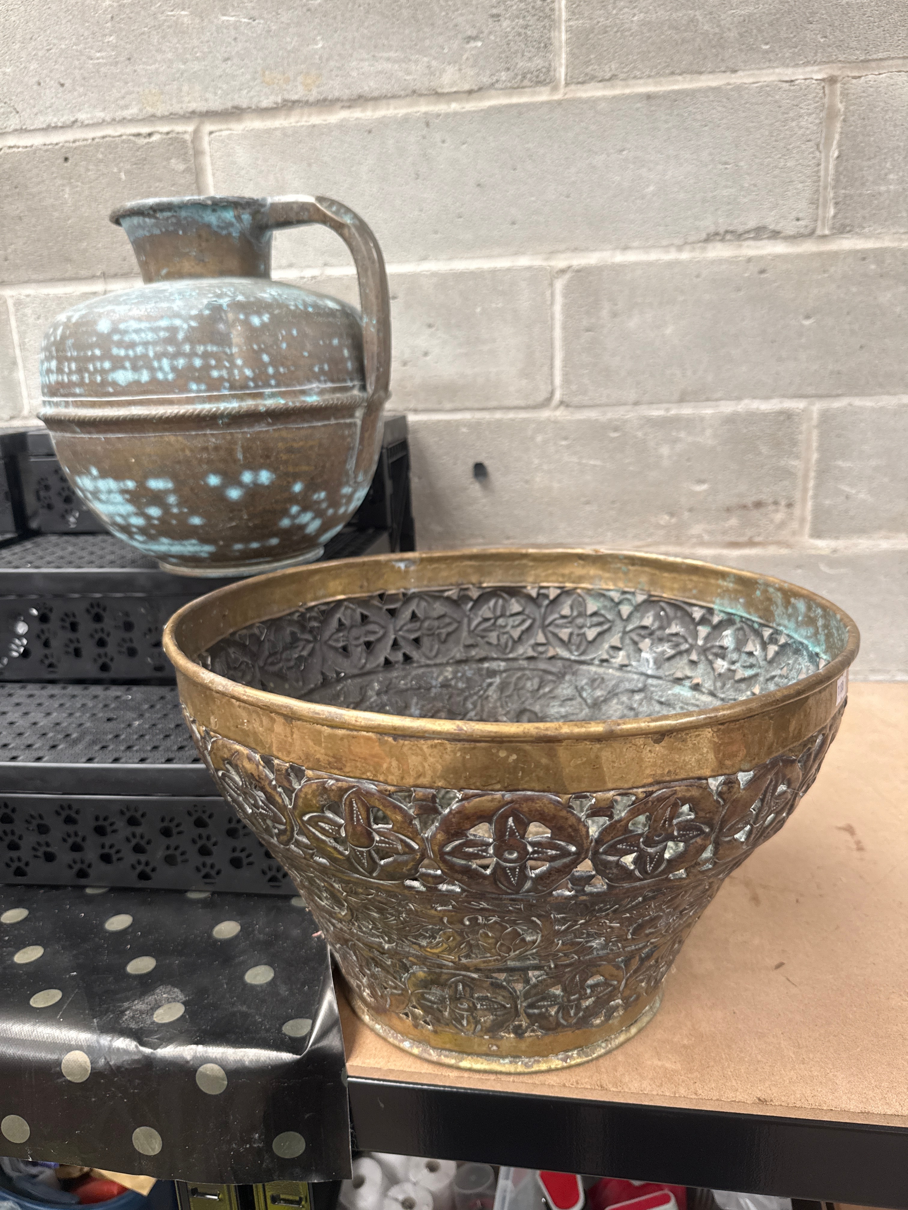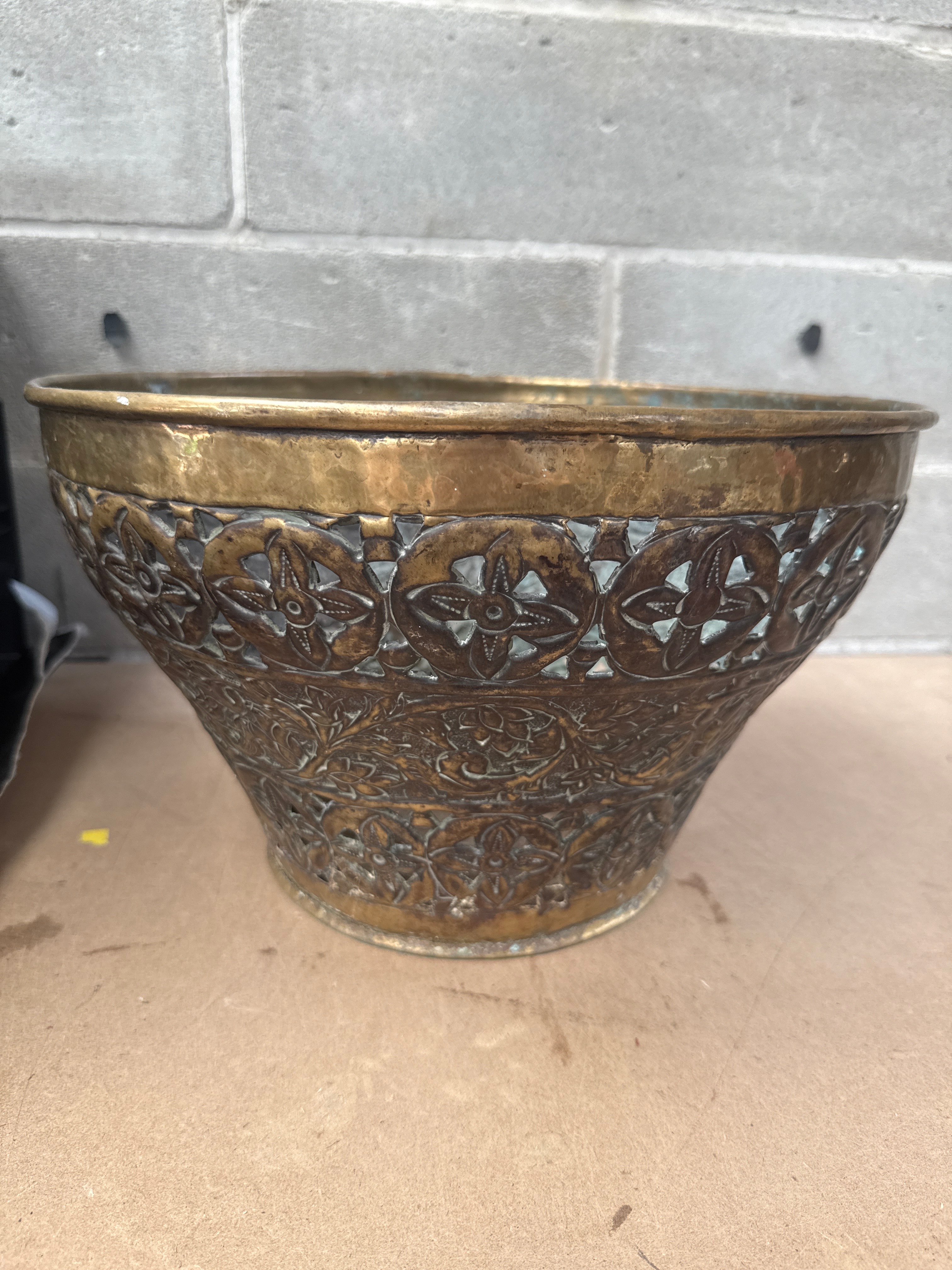 A pair of antique Brass vessels. The first is a globular jug or ewer with a single handle and a narrow neck, featuring a prominent horizontal raised band around its body. The second item is a flared, tapering Brass bowl or planter, extensively decorated with repoussé or engraved motifs. Its design includes an upper band of repeating quatrefoil or stylized floral medallions, while the main body is covered in dense, scrolling foliate or arabesque patterns. Both items exhibit darkened patination consistent with age.
