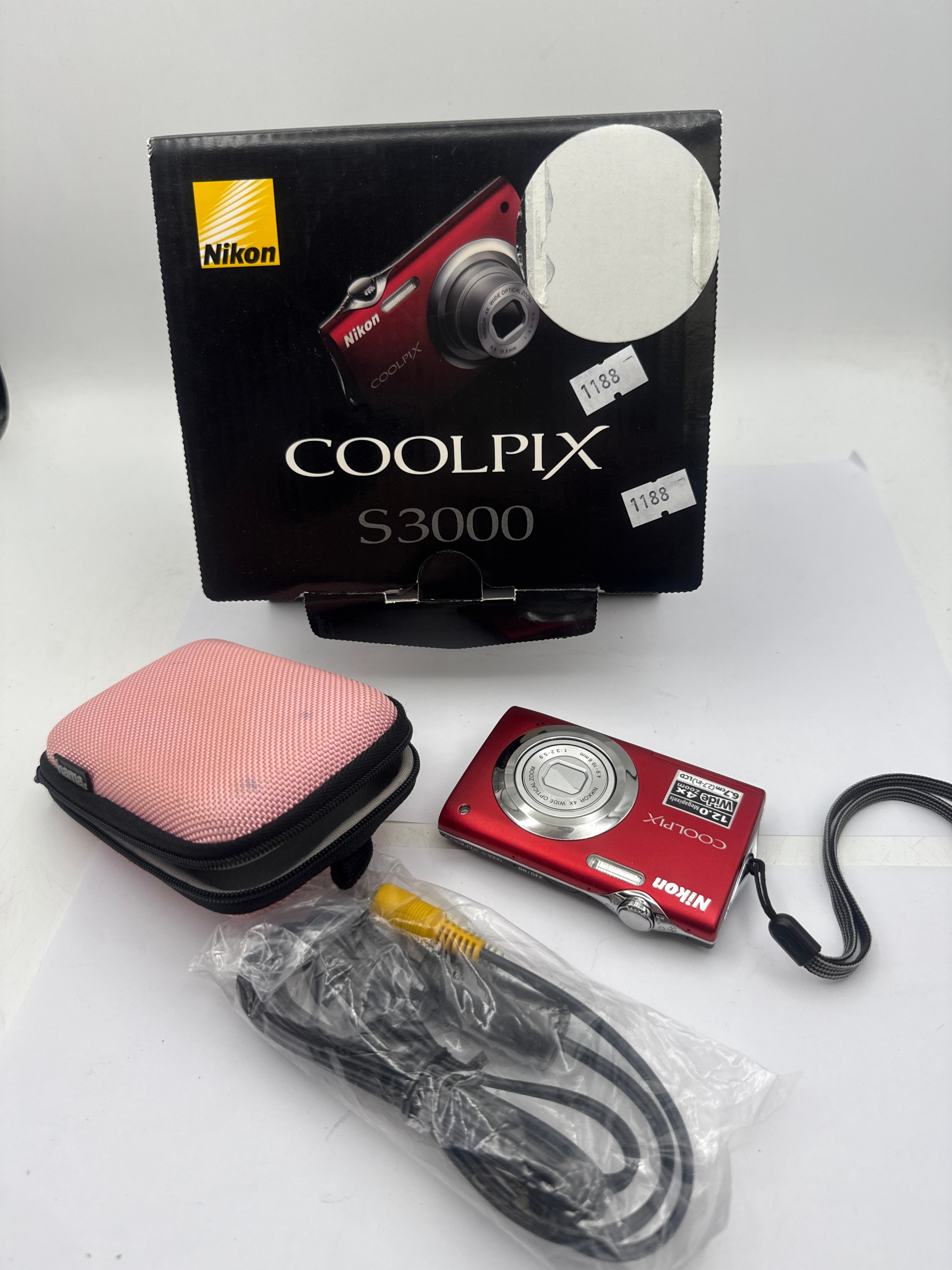 A Nikon Coolpix S3000 compact digital camera, circa early 2010s, featuring a red metal and plastic body with a NIKKOR 4x wide optical zoom lens, “12.0 Megapixels,” and a “6.7cm (2.7-in.) LCD.” It is presented with its original black cardboard packaging, displaying “Nikon” and “COOLPIX S3000” branding along with “1188” inventory stickers. Also included are a pink textile “hama” branded soft case and a sealed plastic bag containing black connecting cables, one with a visible yellow RCA connector.