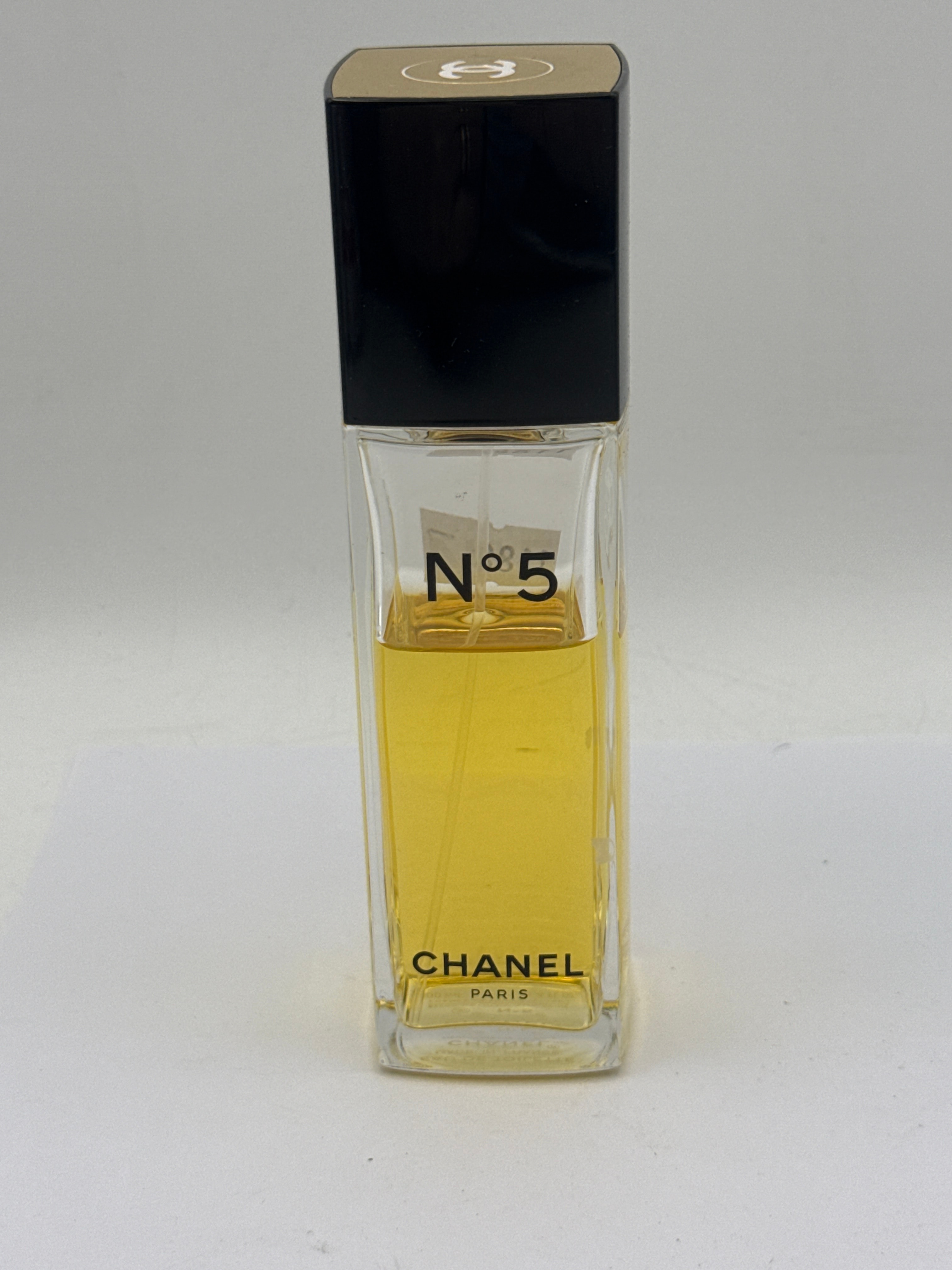 A CHANEL N°5 Eau de Toilette Spray, 100ml. This rectangular clear glass perfume bottle features a black opaque cap with a gold-toned top panel embossed with the distinctive interlocking ‘CC’ Chanel logo. The bottle’s front prominently displays “N°5”, “CHANEL”, and “PARIS” in black lettering. It contains a golden yellow liquid, appearing approximately 80-90% full, and includes a visible spray dispenser straw. The overall aesthetic is modern and minimalist.