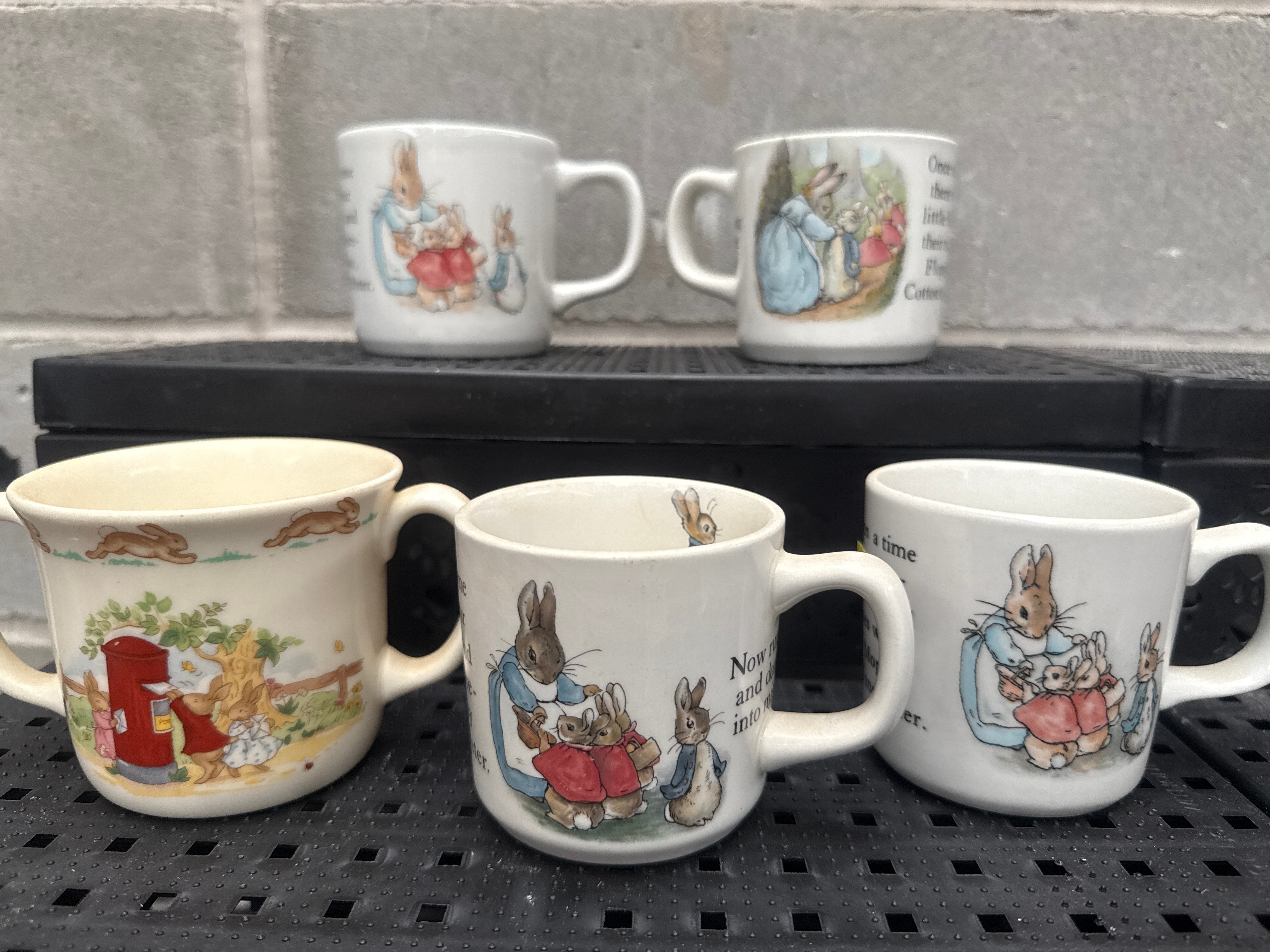 A group of five Wedgwood ‘Peter Rabbit’ ceramic mugs, each adorned with illustrations in the classic Beatrix Potter style, depicting scenes and characters from “The Tale of Peter Rabbit” series. The designs feature anthropomorphic rabbits, including Mrs. Rabbit with her children, Peter Rabbit, and a scene involving a red British pillar box marked “Post.” Legible text on the mugs includes the opening line, “Once upon a time there were four little rabbits, and their names were Flopsy, Mopsy, Cotton-tail, and Peter.”, and the phrase, “Now run along and don’t get into mischief.”