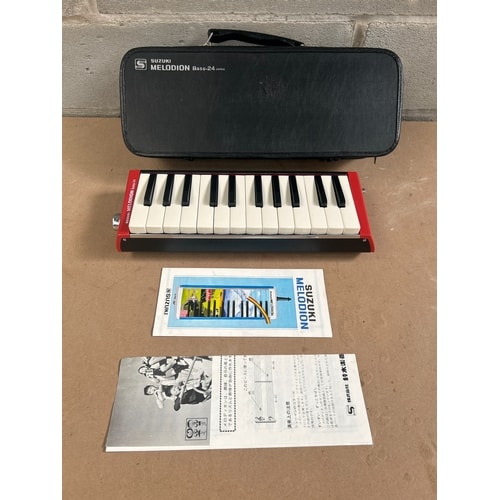 A Suzuki B-24C Bass Melodion Keyboard Harmonica. This modern instrument features a vibrant red plastic body with 24 white and black keys. It is accompanied by its original black hard-shell carrying case, prominently marked with the ‘SUZUKI’ logo (stylized ‘S’) and ‘MELODION Bass-24’ in white text. Also included are two paper instruction/information booklets. One booklet features ‘SUZUKI MELODION’ vertically and horizontally, while the other contains Japanese text, translating to ‘Bass Melodion’ and referencing ‘Suzuki Musical Instrument Manufacturing Co., Ltd.’, alongside illustrations and musical notation.