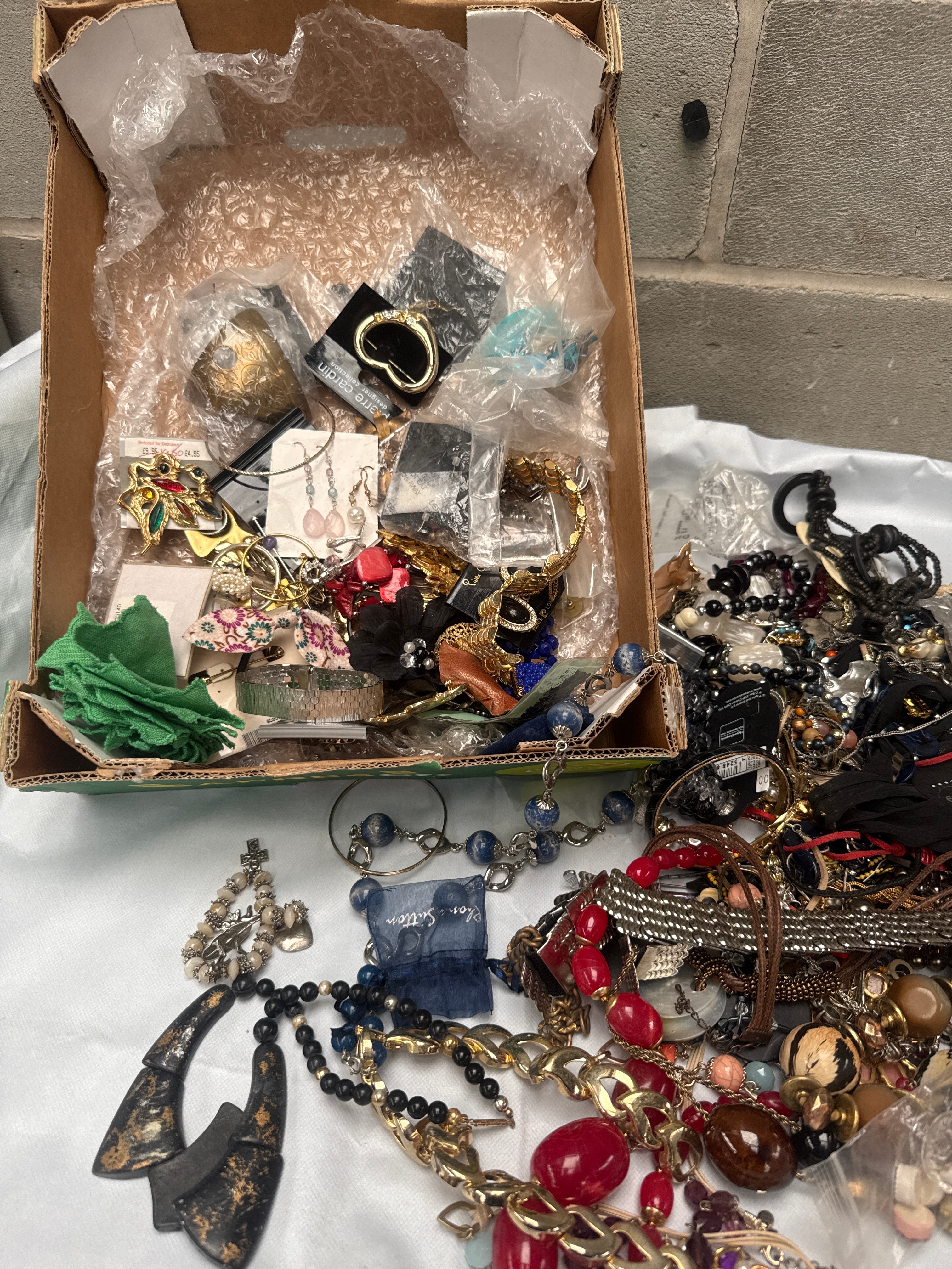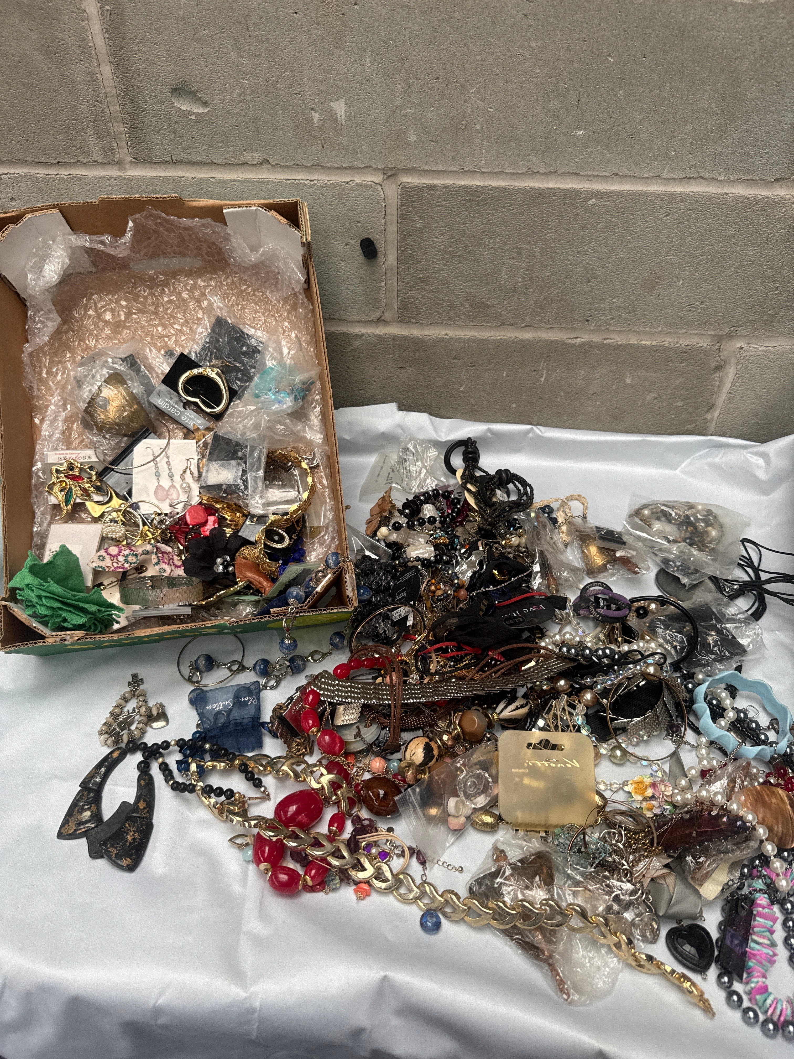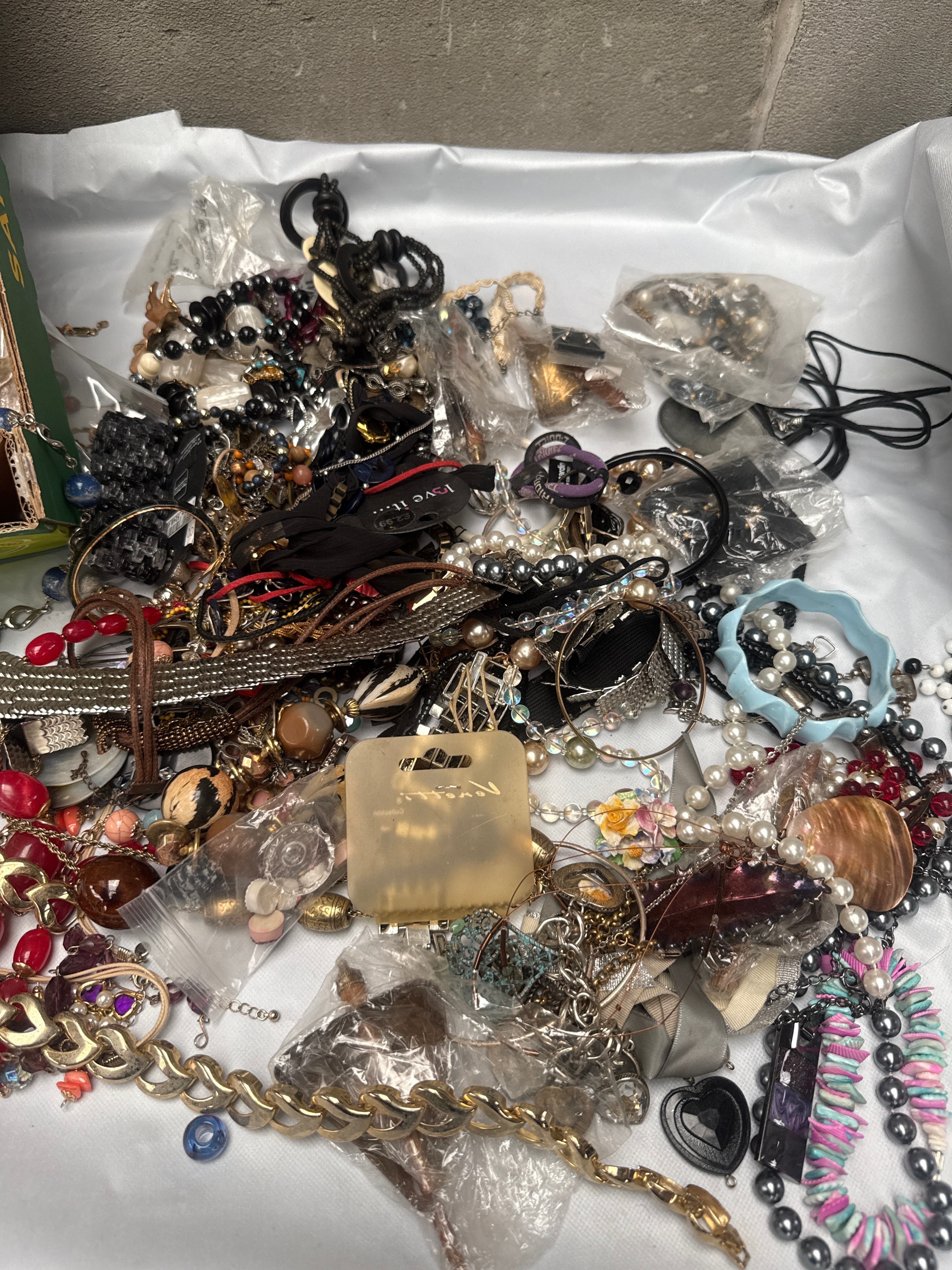 A large quantity of assorted costume jewelry, including numerous necklaces, bracelets, earrings, rings, and brooches, presented both loose and within small bags or on display cards inside a cardboard box and spread across a table. Materials are varied, consisting of mixed metals (gold-tone and silver-tone), various beads (glass, plastic, faux pearl), fabric, shell, and wood. Styles are generally contemporary to modern, with some pieces bearing visible branding such as “MILANCA” on a tag and “SOIE” (French for “silk”) on a small blue pouch.