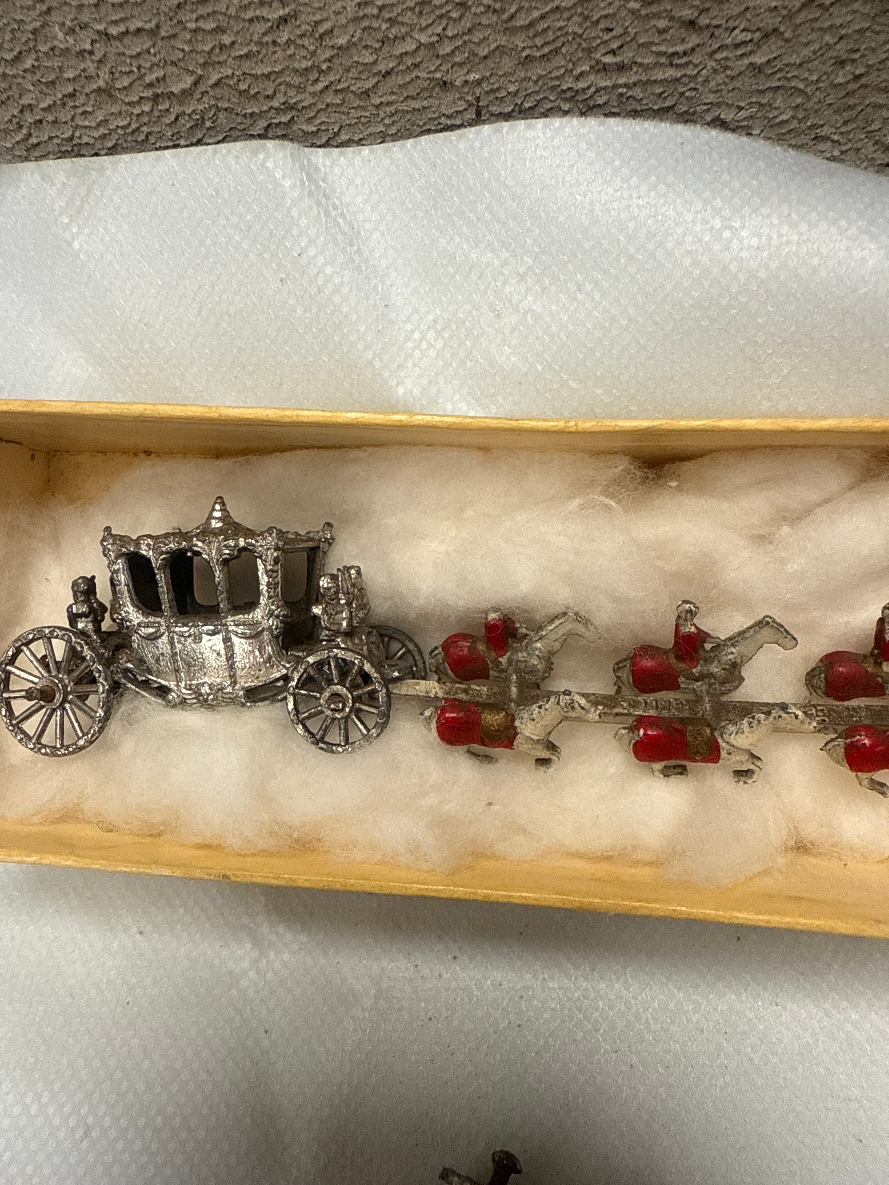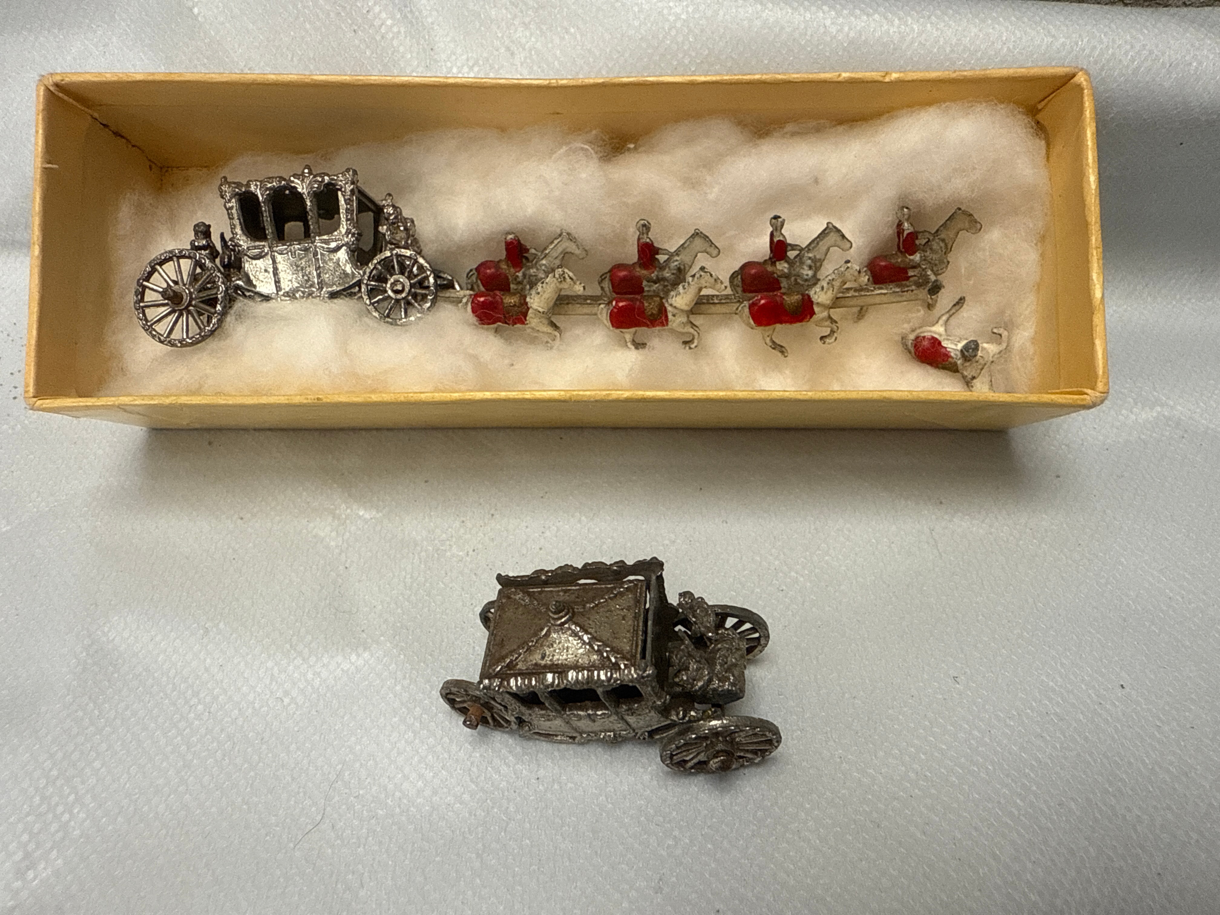 A Lesney Moko Matchbox miniature Queen Elizabeth II coronation coach, presented as two silver-tone cast metal components. The first is a complete set featuring a highly detailed carriage with intricate design, pulled by a team of five horses, each with a rider adorned with red painted accents on their saddles and clothing. This set is housed in a light-colored cardboard box lined with white cotton batting. The second component is an identical silver-tone cast metal carriage, without its accompanying horses. The design evokes a historical grand coach, with Rococo or Victorian aesthetics. No visible manufacturer’s marks or textual inscriptions are apparent.