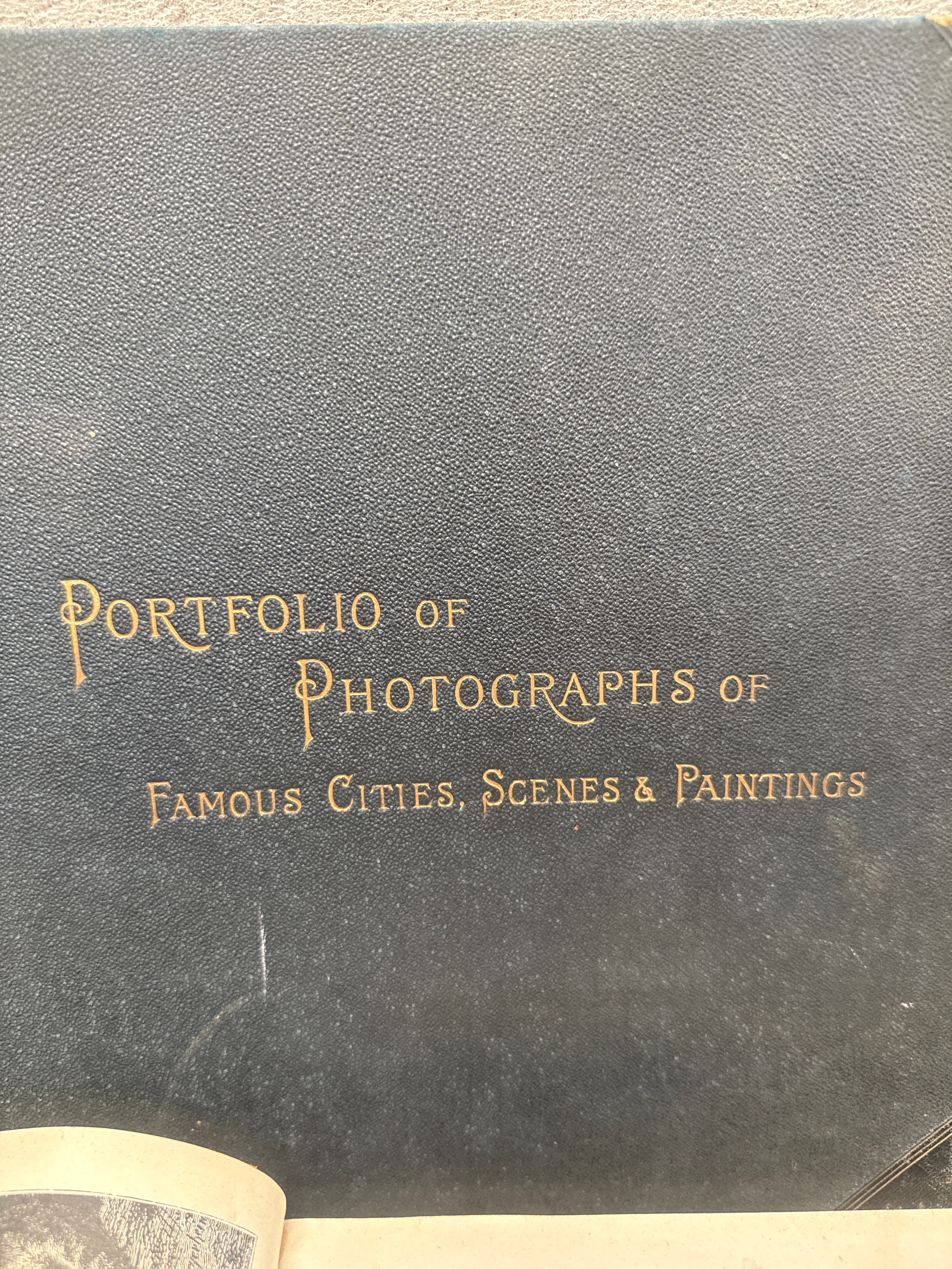 This lot comprises two bound volumes. The first is The Boys’ Own Annual, identified as Volume 14, published in 1892 by Leisure Hour Office, London. It displays a decorative Victorian-era title page with the publisher’s details “LONDON. LEISURE HOUR OFFICE 56 PATERNOSTER ROW” and the Latin motto “Quidquid agunt pueri nostri farrago libelli.” An adjacent open page features a detailed black and white illustration of a large feline, possibly a tiger, in a natural setting. The second item is a dark, likely cloth-bound portfolio, with gilt lettering on the cover reading “PORTFOLIO OF PHOTOGRAPHS OF FAMOUS CITIES, SCENES & PAINTINGS.” Both volumes are consistent with a late 19th to early 20th-century period.