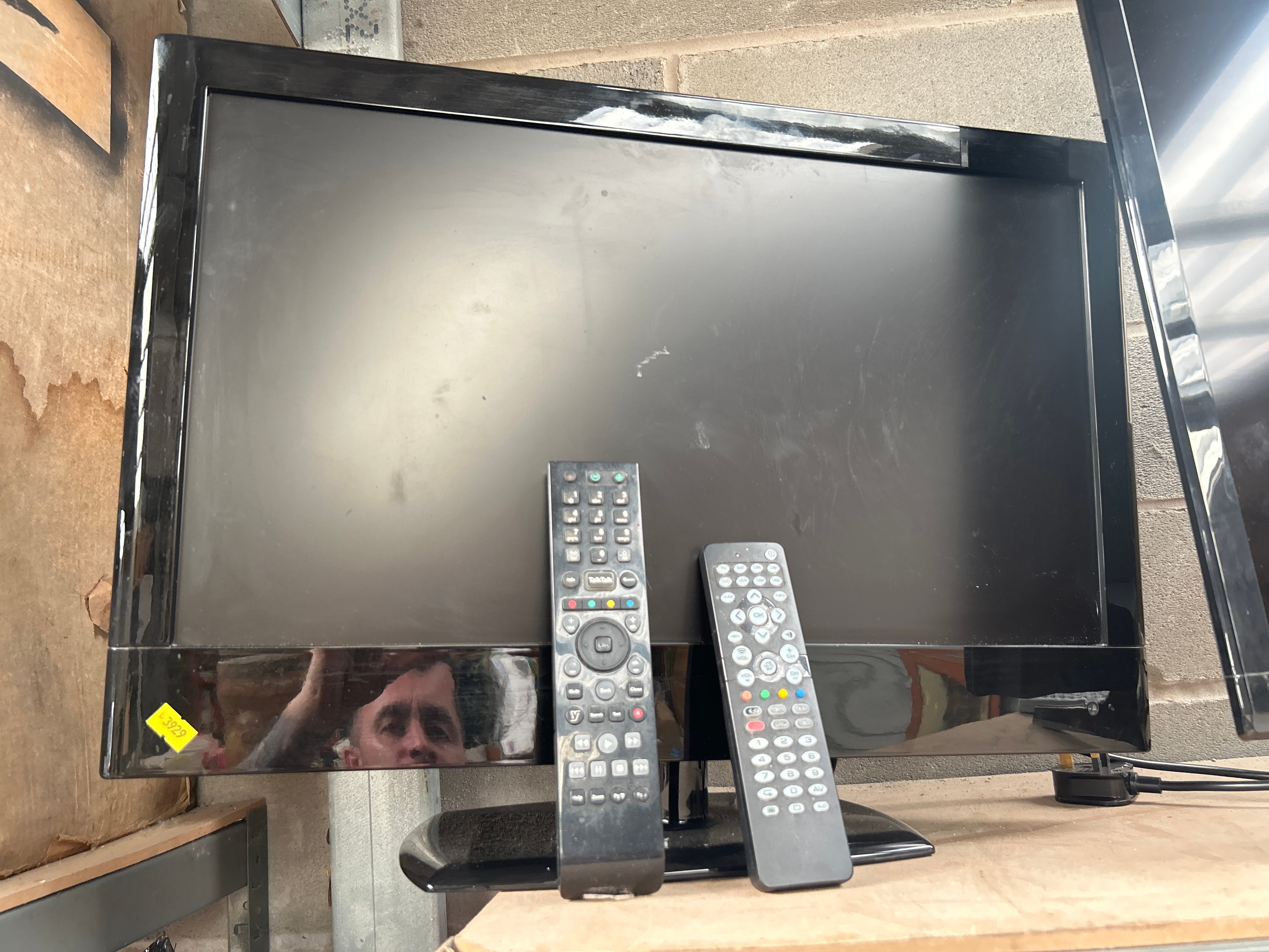 A 23-inch LED flat-screen television or monitor, likely from the 2000s-2010s, featuring a glossy screen and a black plastic bezel, set upon a matching plastic stand. A yellow sticker bearing the marking ‘D 3929’ is affixed to the lower left bezel. Included are two black plastic remote controls, one visibly branded ‘TalkTalk’. A Type G power plug is also visible, indicating a potential UK or Irish market origin.