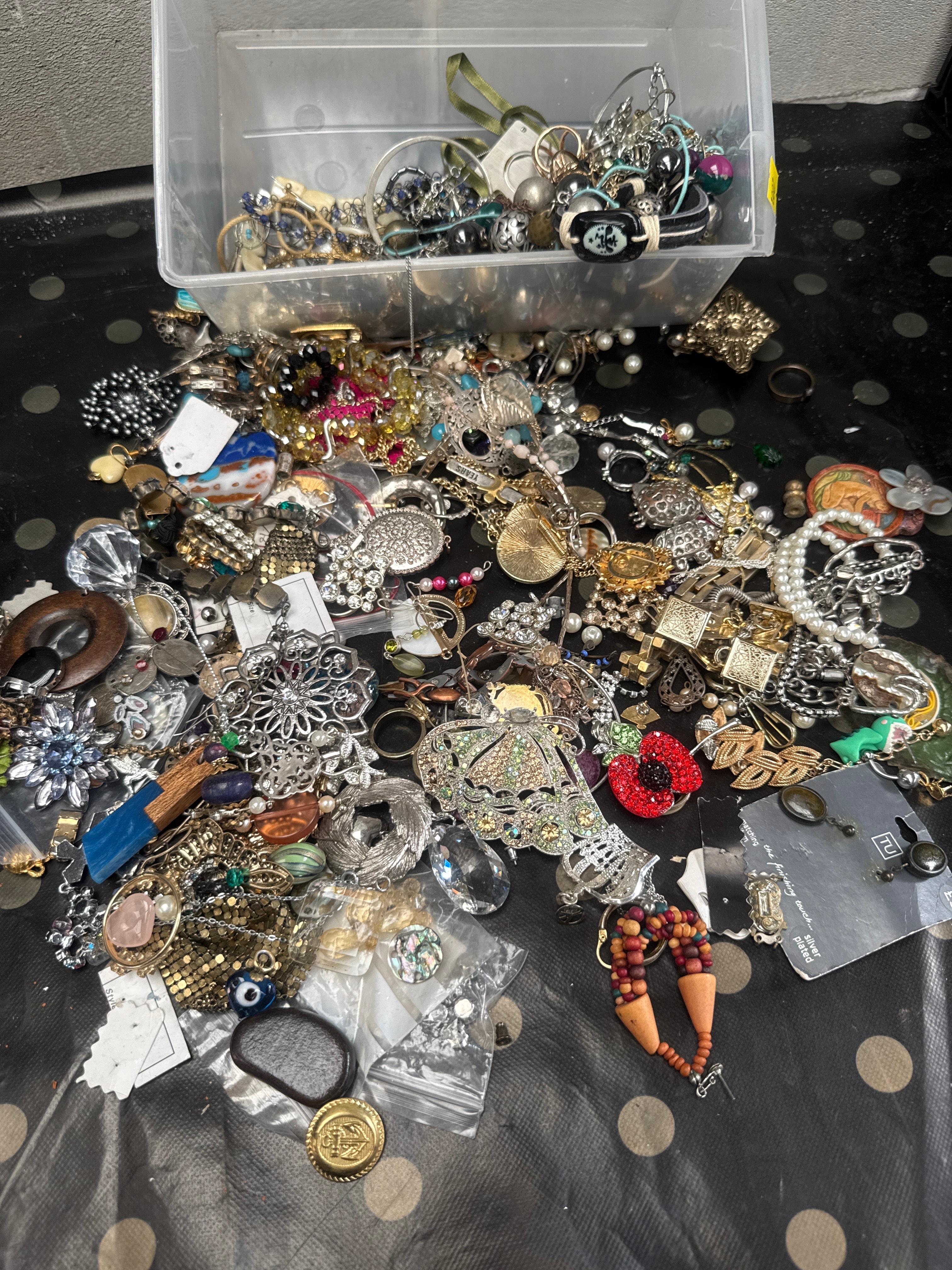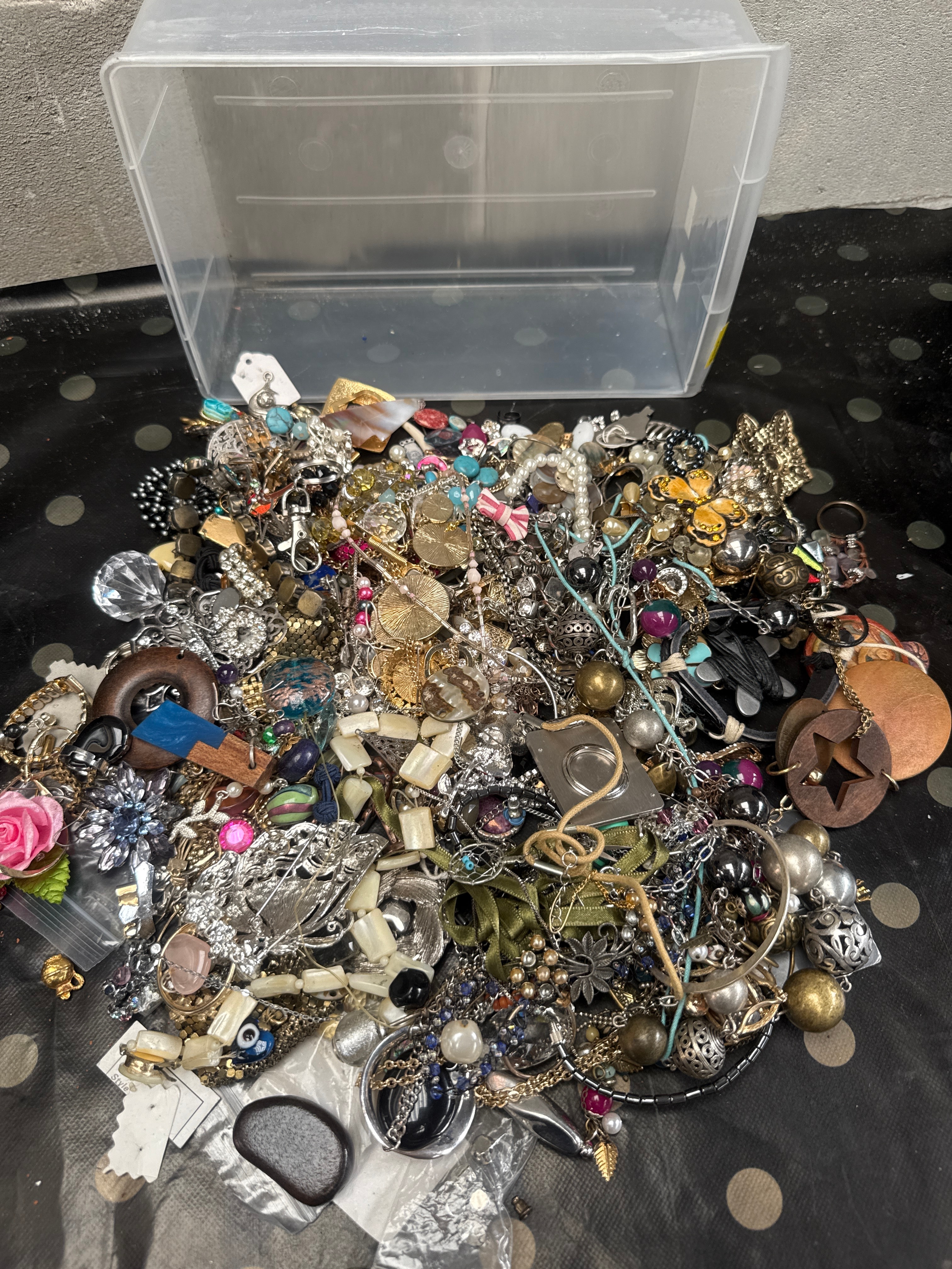 A substantial collection of assorted jewelry and accessories, including necklaces, bracelets, earrings, brooches, rings, and loose components. The lot features a highly varied mix of styles and periods, ranging from contemporary fashion jewelry to potential vintage pieces. Materials predominantly consist of base metals with silver-tone and gold-tone finishes, often adorned with plastic, glass, faux pearls, rhinestones, enamel, wood, fabric, and other synthetic or natural-looking components. Visible markings include a tag identifying “925 STERLING SILVER” and “ARGENT STERLING,” and another tag stating “PAIRE DE BOUCLES D’OREILLES.”