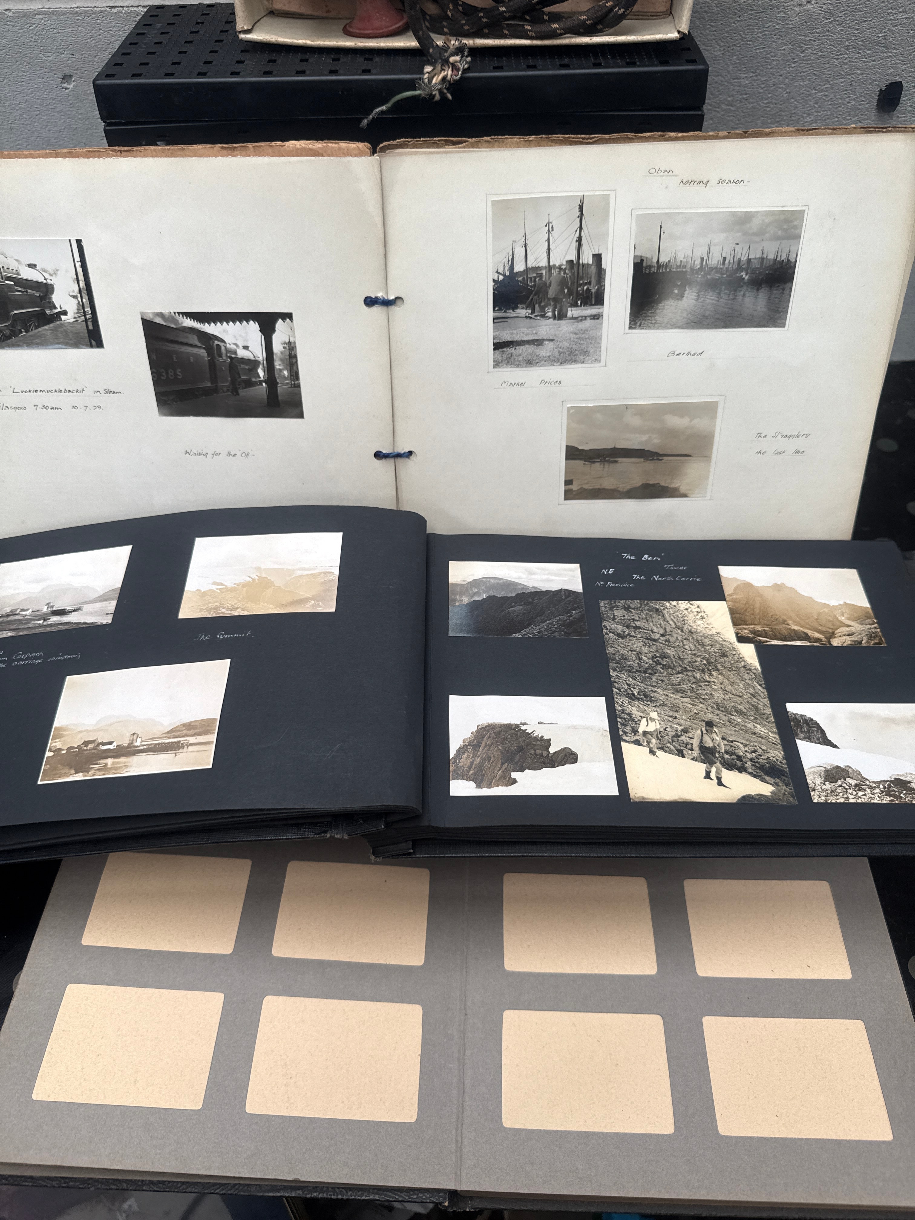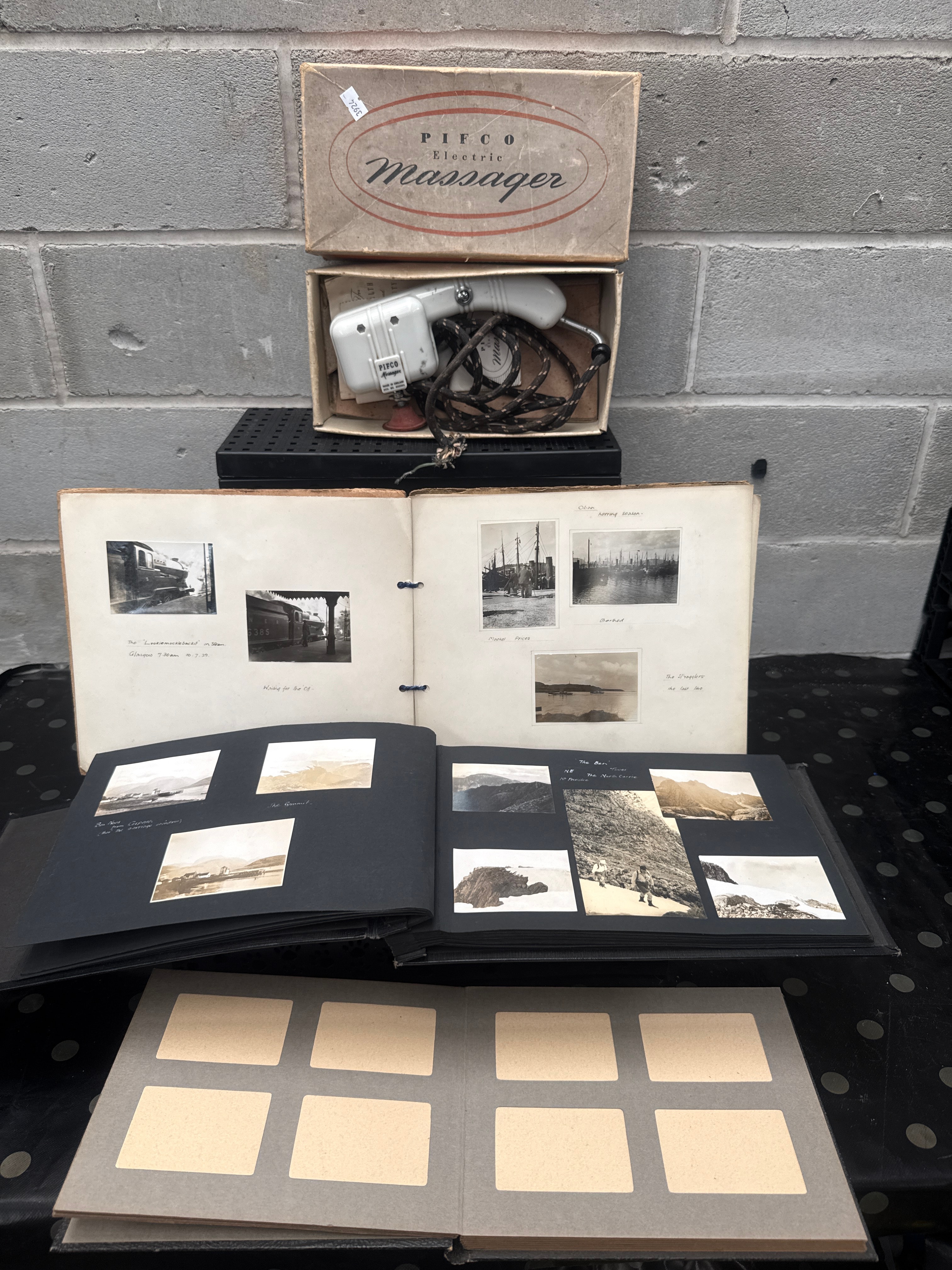 A vintage PIFCO Electric Massager, ‘Made in England’ and specified for ‘200-250V AC/DC’. It features a white plastic or Bakelite body and is housed in its original cardboard box. Accompanying the massager are three photo albums. Two albums contain numerous black and white photographs from the early to mid-20th century, depicting Scottish trains (e.g., “The ‘Lochaberman’ in Mallaig,” “Waiting for the ’90’s”), industrial port scenes (“Oban. North Pier.”, “Port Glasgow”), and Scottish landscapes with handwritten captions such as “Arran” and “The Ben – 1928”. The third album contains blank grey pages with rectangular photo mounts.