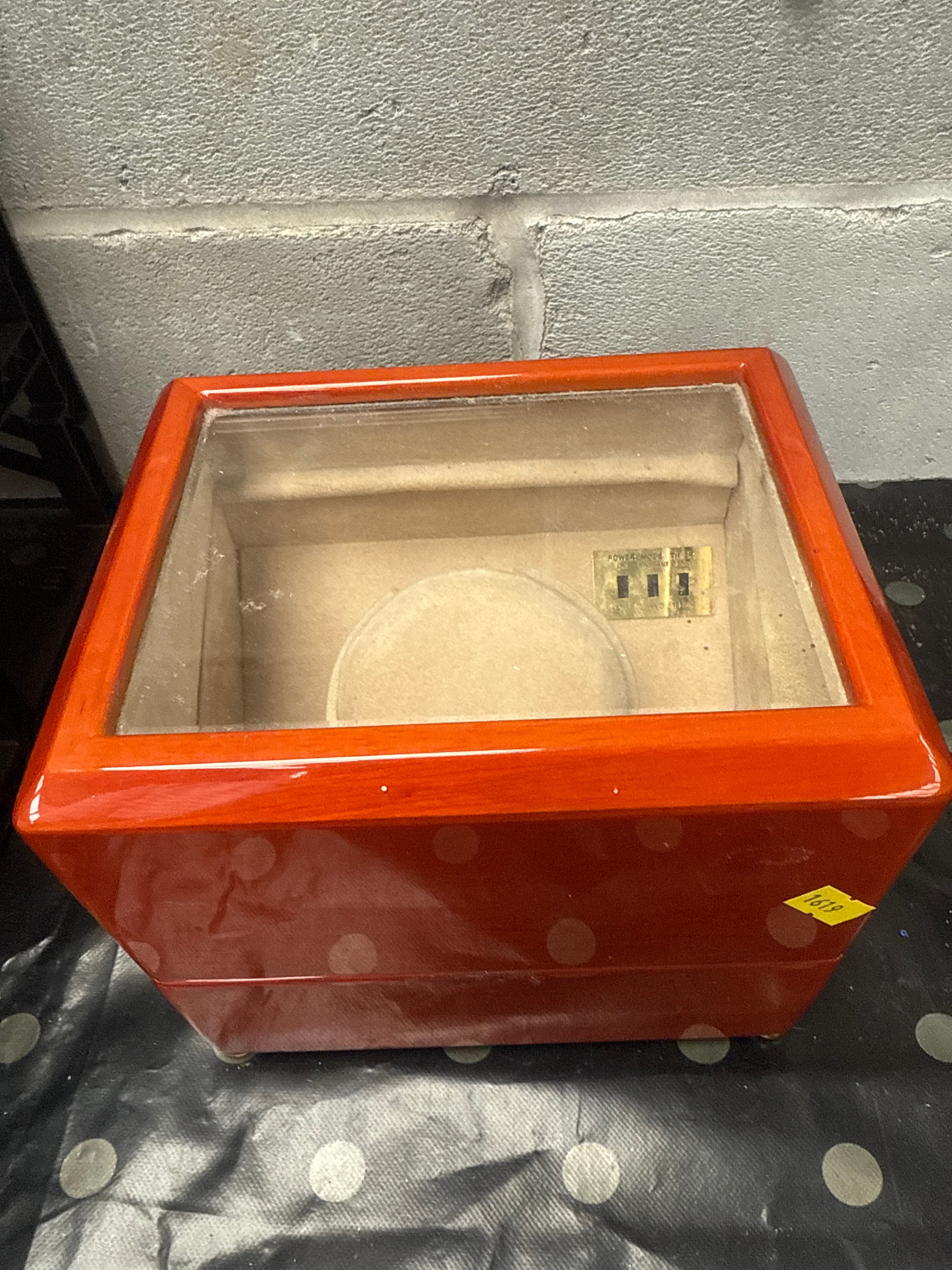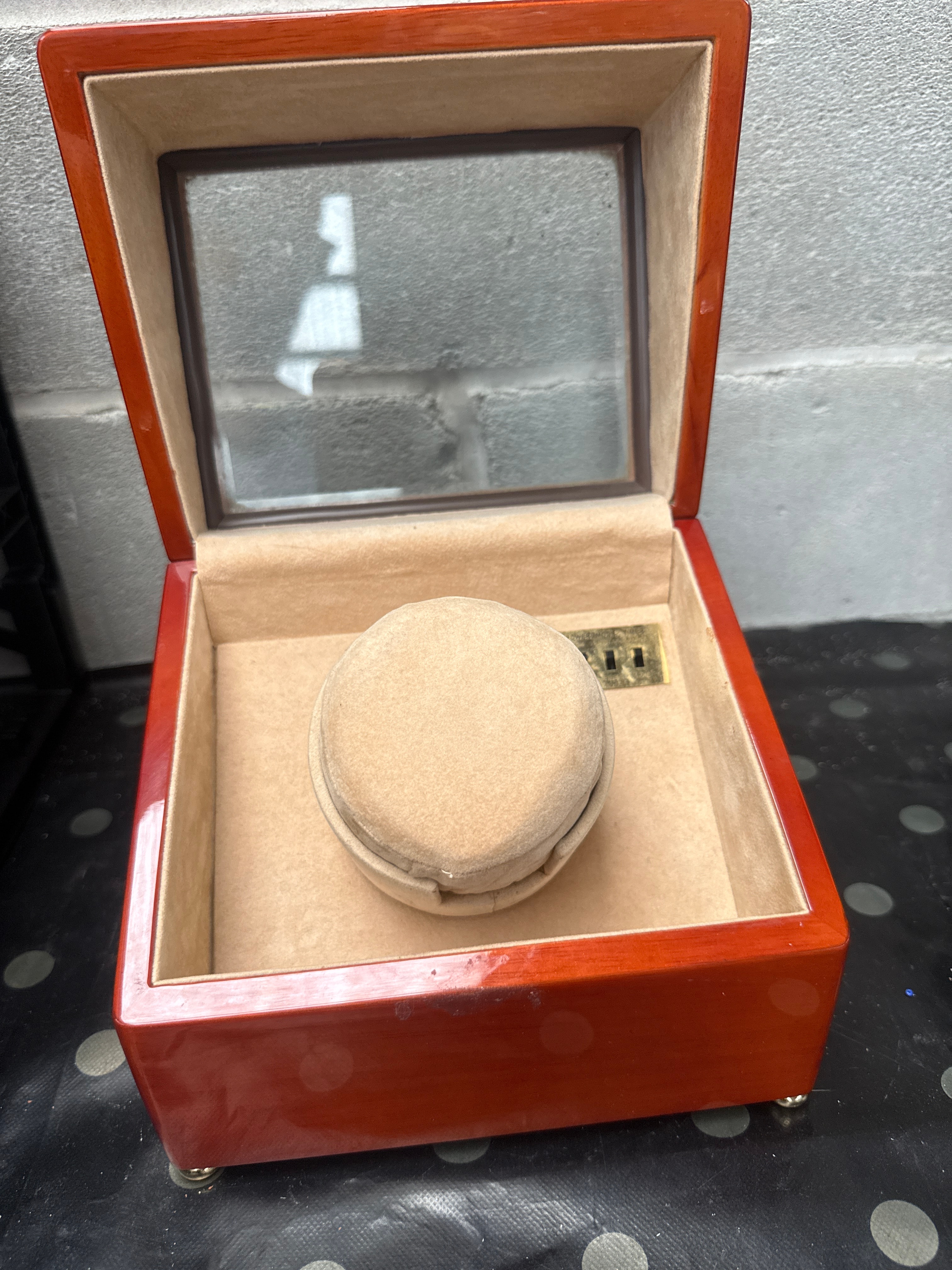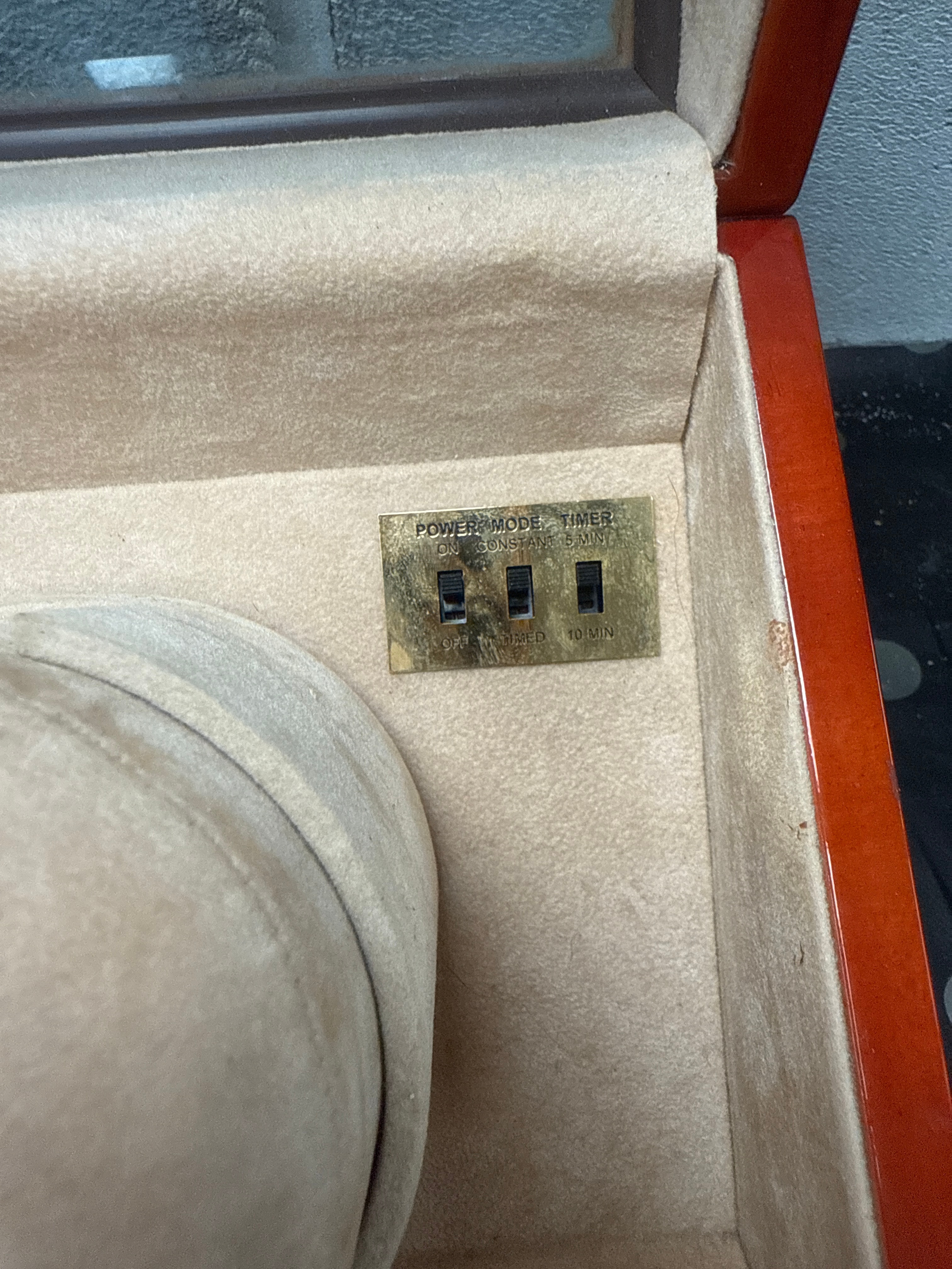 A contemporary single watch winder, housed in a rectangular, highly polished reddish-brown wooden case, possibly cherry or mahogany-finished, with a clear glass-paneled hinged lid. The interior is lined with a light tan fabric, likely suede or felt, and features a central rotating mechanism fitted with a matching removable watch cushion. A brass-toned metal plaque inside displays “POWER MODE TIMER” with settings including “ON CONSTANT 6 MIN” and “2 / 12 HR PAUSED 10 MIN,” selectable via three small switches. The piece is supported by small gold-tone feet and is battery operated.