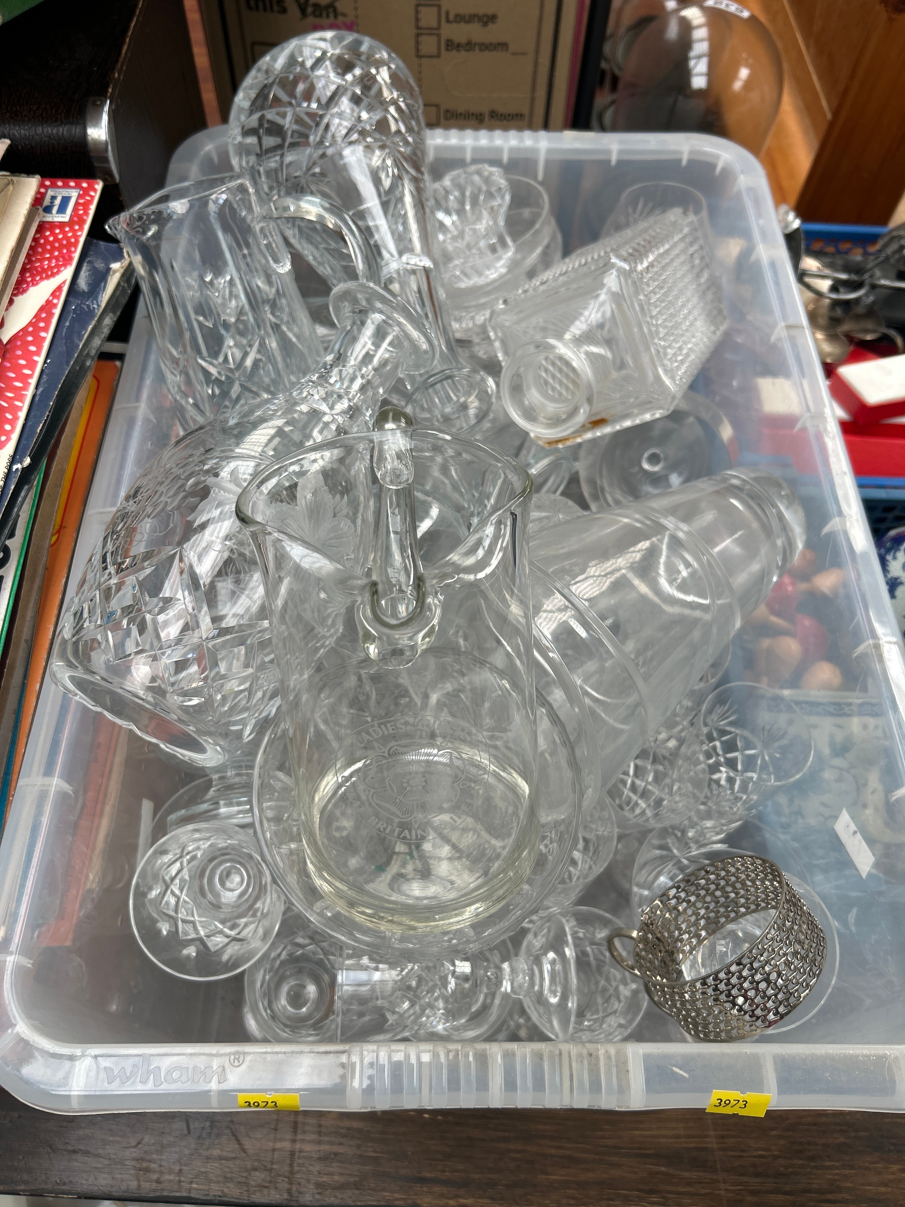 This lot comprises a collection of assorted clear glassware, presented within a clear plastic ‘wham®’ storage container. The collection includes various drinking vessels, decanters, and a large handled jug. The glassware displays a mix of styles, featuring plain glass, elaborately cut crystal with diamond and starburst patterns, and some items with etched floral designs. A prominent clear glass jug is etched with an emblem depicting a rose motif, encircled by partially visible text reading ‘LADIES…’ and ‘BRITAIN’ at its base. Also included is a small, silver-toned, openwork metallic item. Inventory stickers ‘3973’ and ‘3073’ are visible on the container.