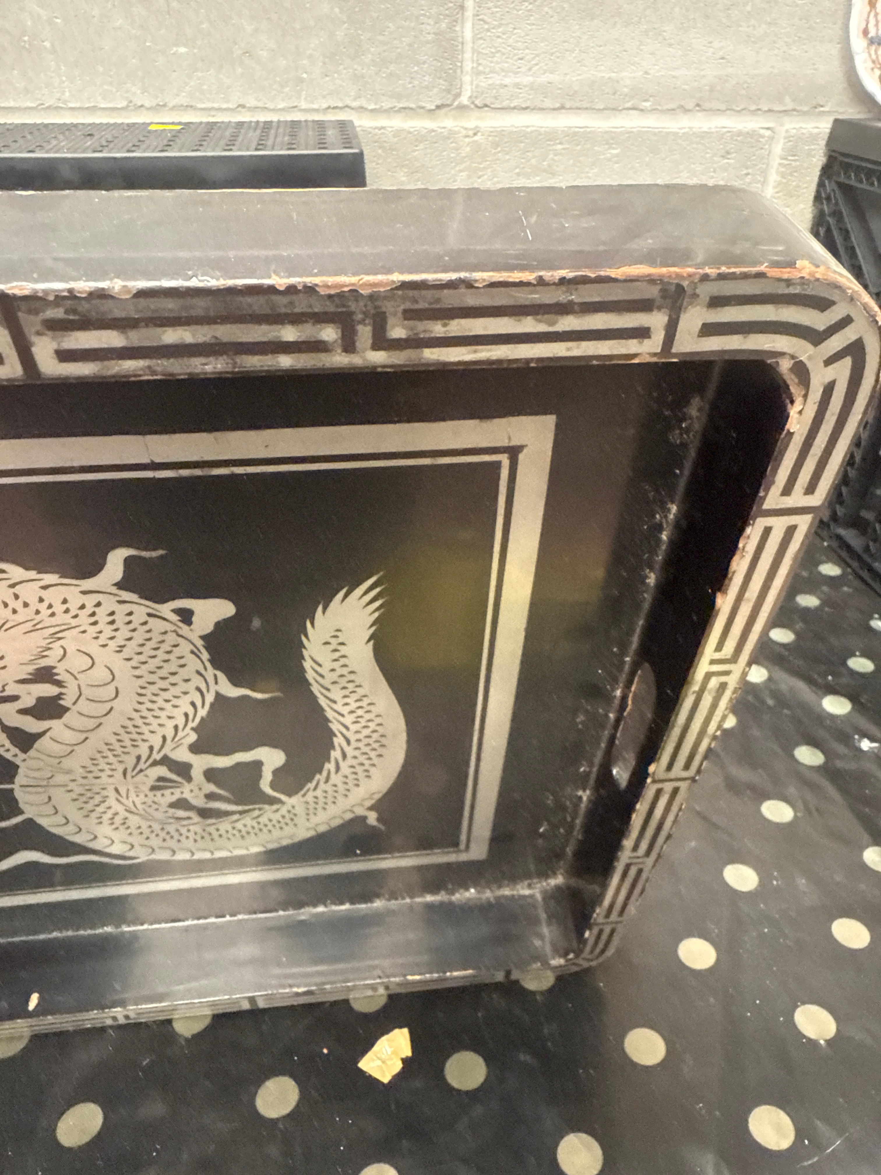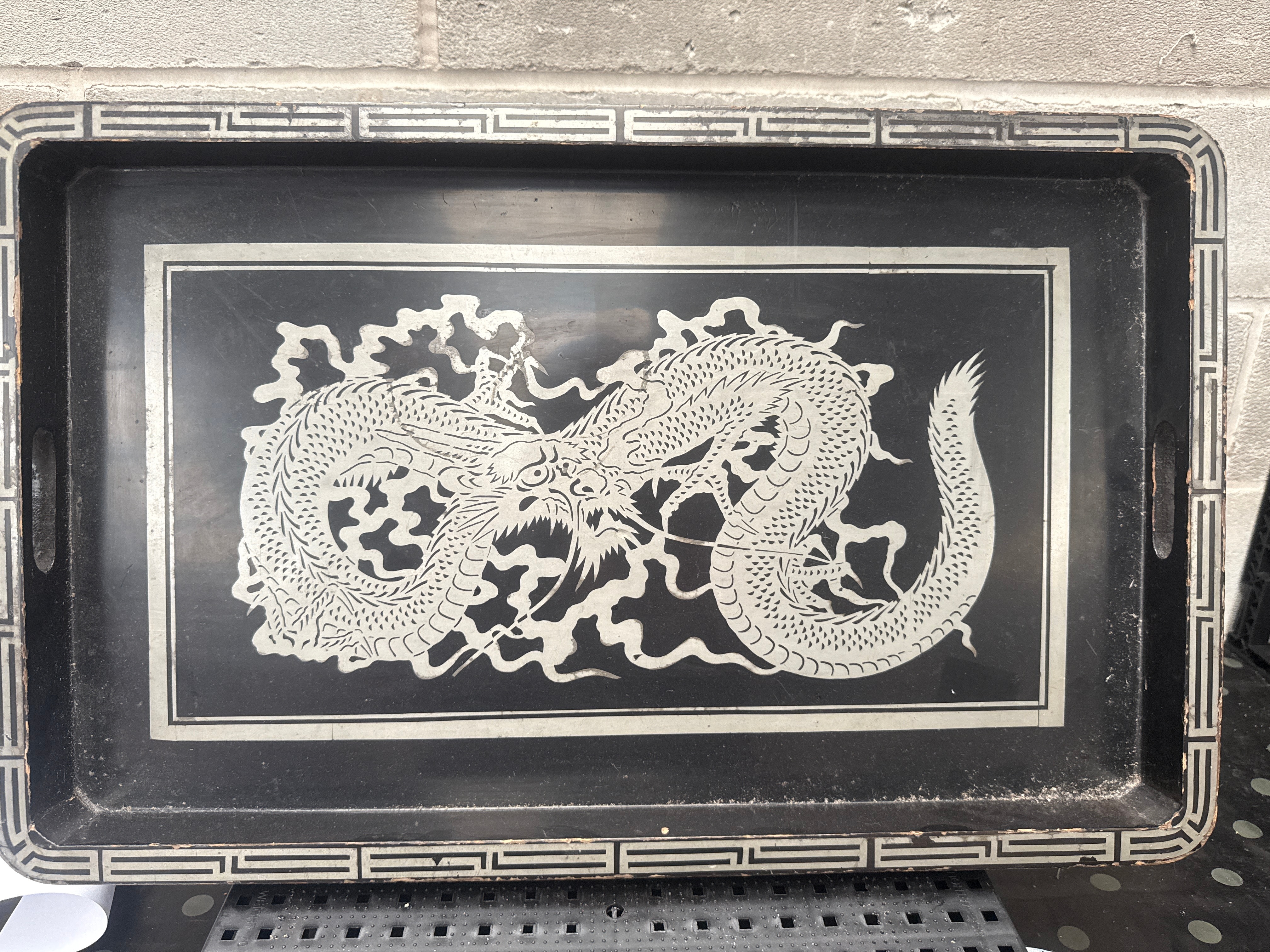 An Antique Chinese Silver Dragon Lacquered Wood Tray. This rectangular decorative serving tray features a prominent central design of a coiled, stylized Chinese-style dragon in a silver-tone finish against a black background. The central design is framed by a matching silver-tone border. The outer rim of the tray is decorated with a repeating geometric fretwork pattern. The item is constructed from lacquered wood or a similar composite material, with a black primary finish and painted or applied silver-tone decoration. No visible text or markings are present.