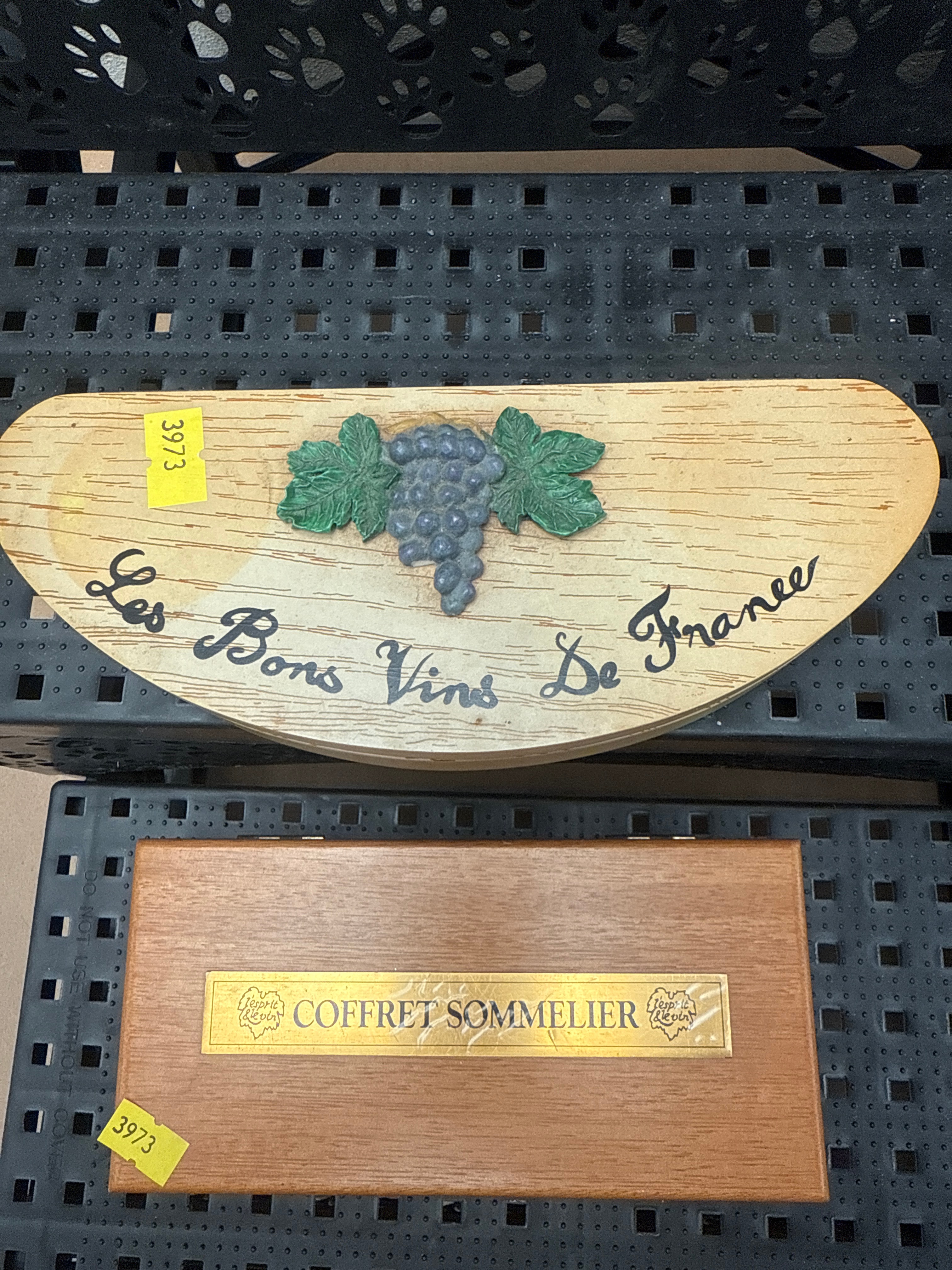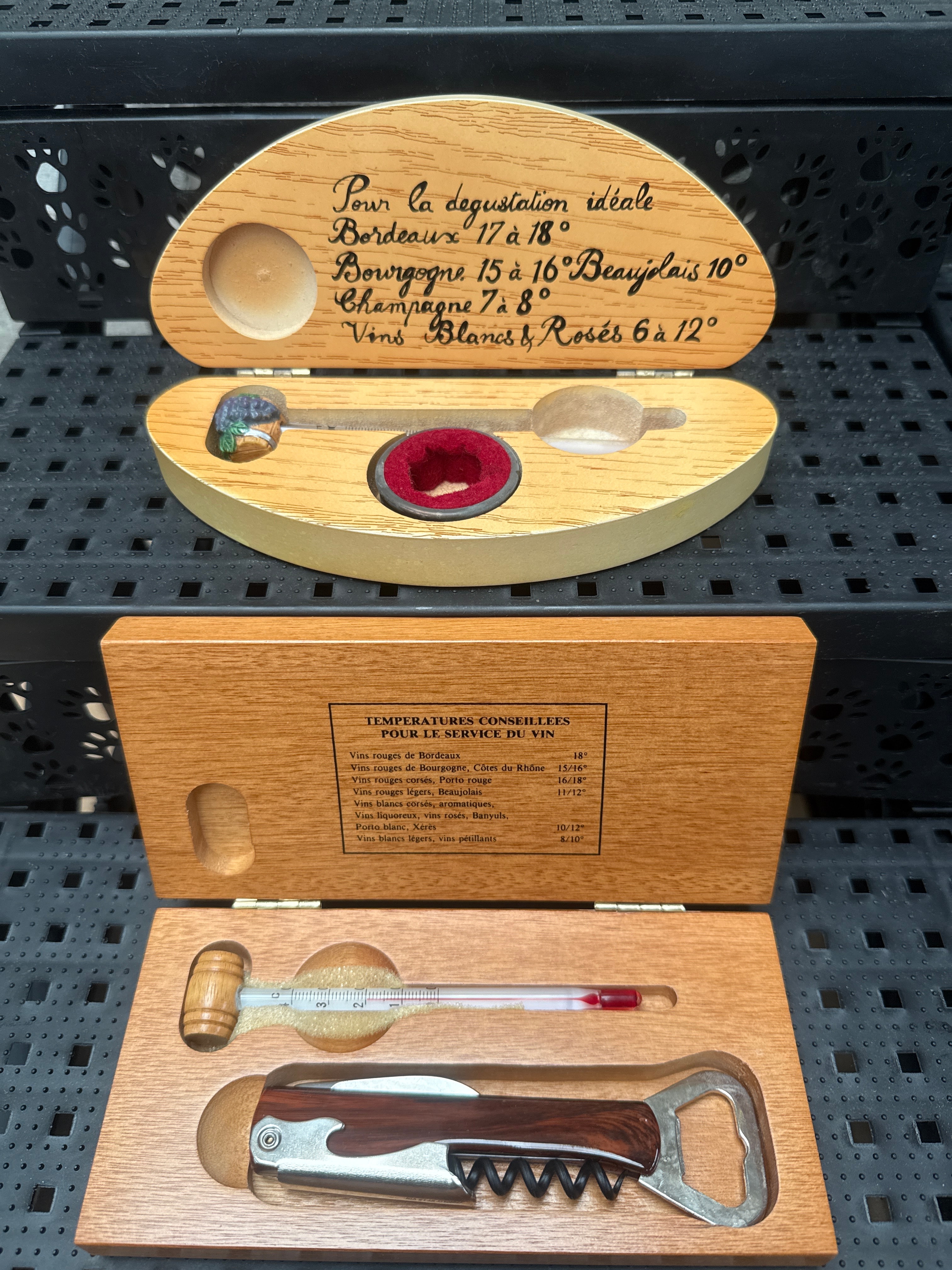 A pair of modern wine accessory sets, each presented in a hinged wooden box. The first set features a crescent-shaped light wood box, adorned with a raised decorative grape cluster and the inscription ‘Les Bons Vins De France’. Inside, it contains a metal wine pourer and a decorative wine stopper. The interior lid provides guidance ‘Pour la degustation idéale’ with recommended serving temperatures for various wines, including Bordeaux (17-18°C) and Vins Blancs & Rosés (6-12°C). The second set is housed in a rectangular dark wood box, featuring a brass-toned plate on the lid inscribed ‘COFFRET SOMMELIER’. Its interior holds a wine thermometer and a multi-tool corkscrew/bottle opener. A printed guide inside lists ‘TEMPERATURES CONSEILLEES POUR LE SERVICE DU VIN’ with ideal serving temperatures, such as Vins rouges de Bordeaux (18°C) and Vins blancs secs (8-10°C). Both sets bear yellow inventory stickers marked ‘3973’.