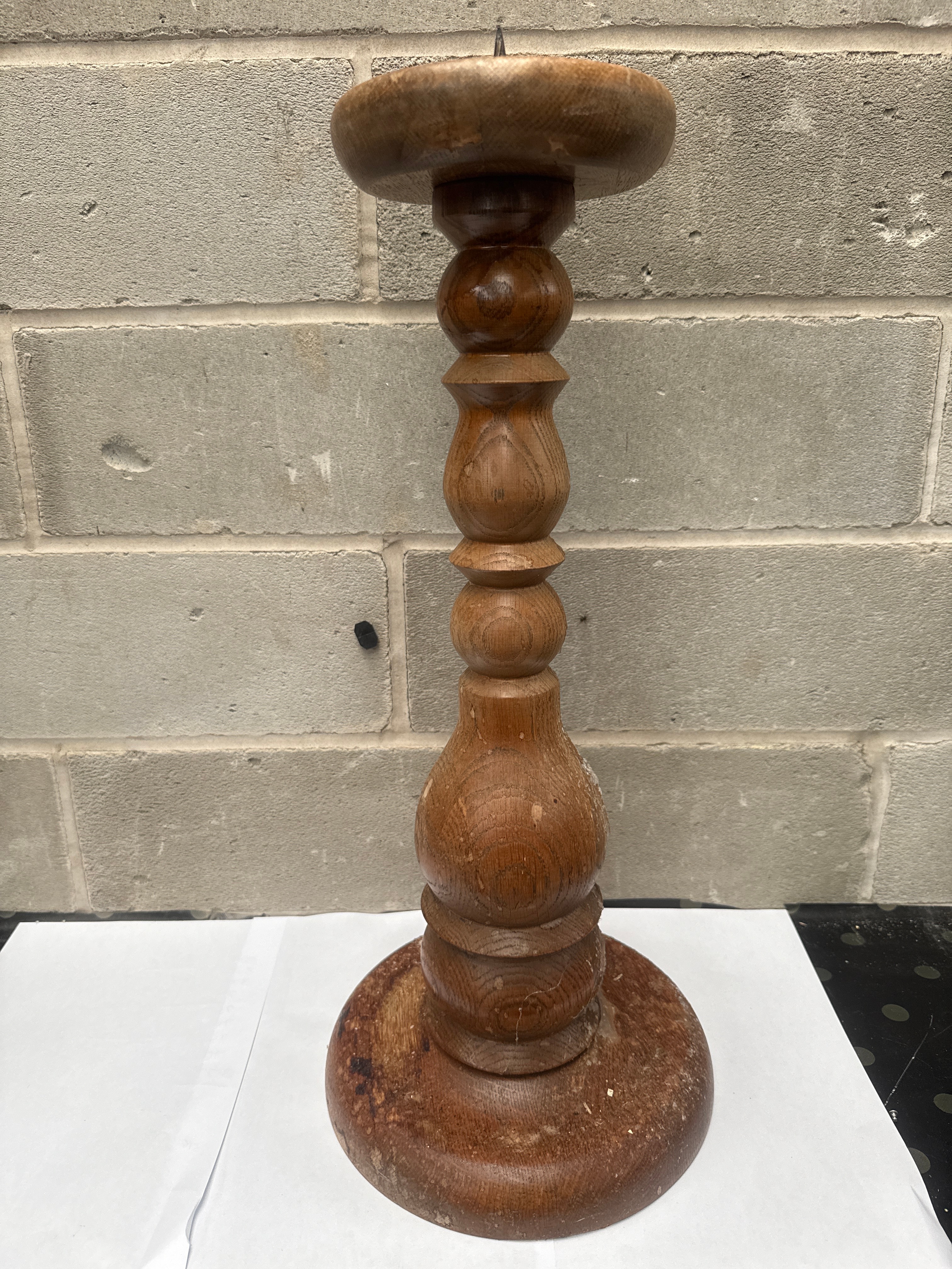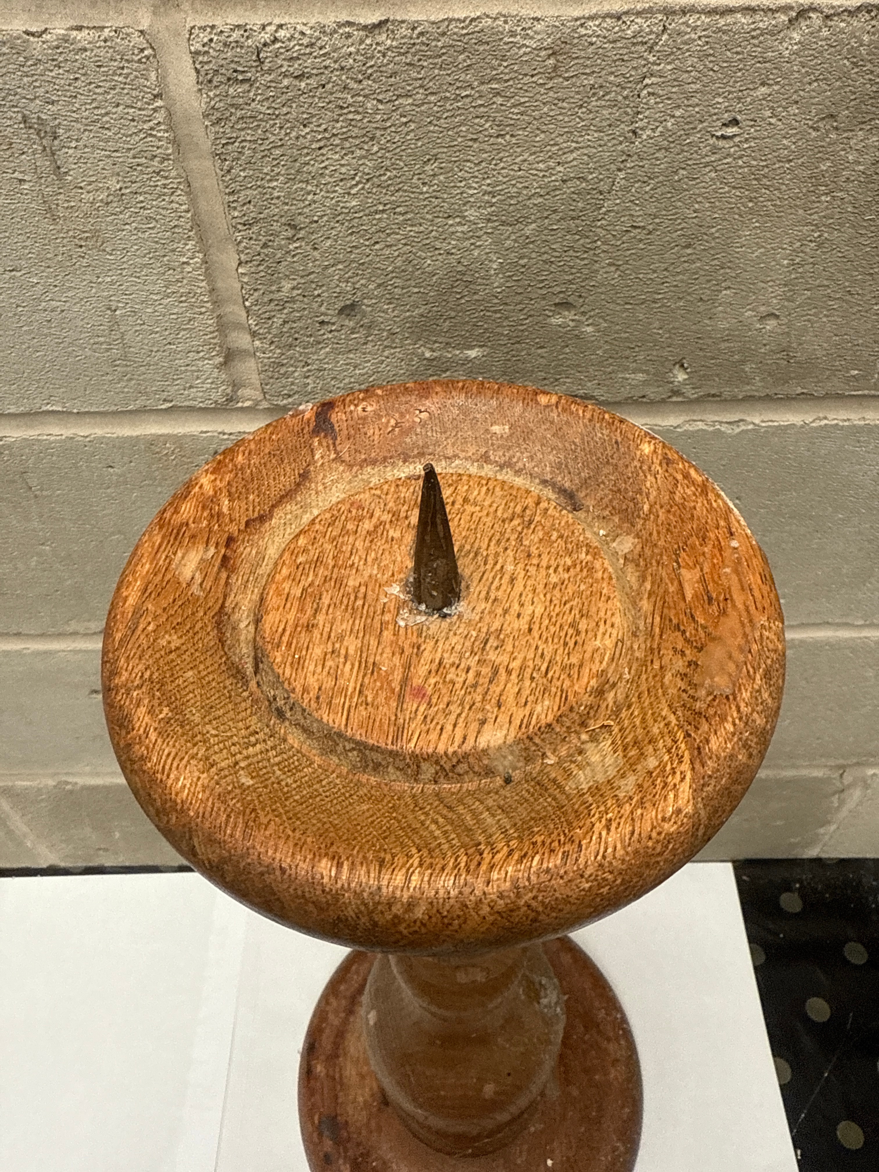A traditional pricket candlestick, crafted from turned wood with a medium-brown finish. The design features a broad circular base, a columnar shaft with multiple turned baluster and ring elements, and a dished top platform surmounted by a dark metal spike (pricket) for securing a candle. No visible manufacturer’s markings are present.