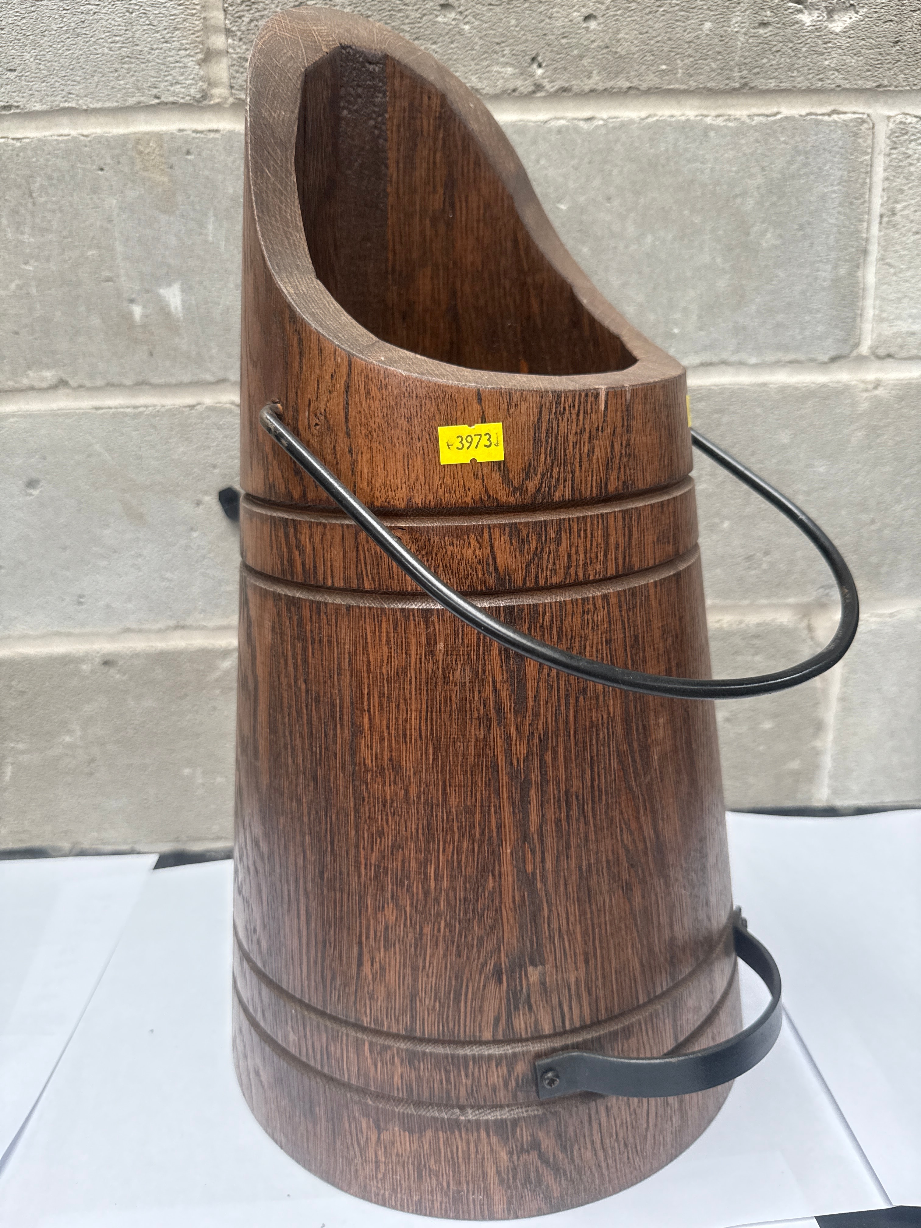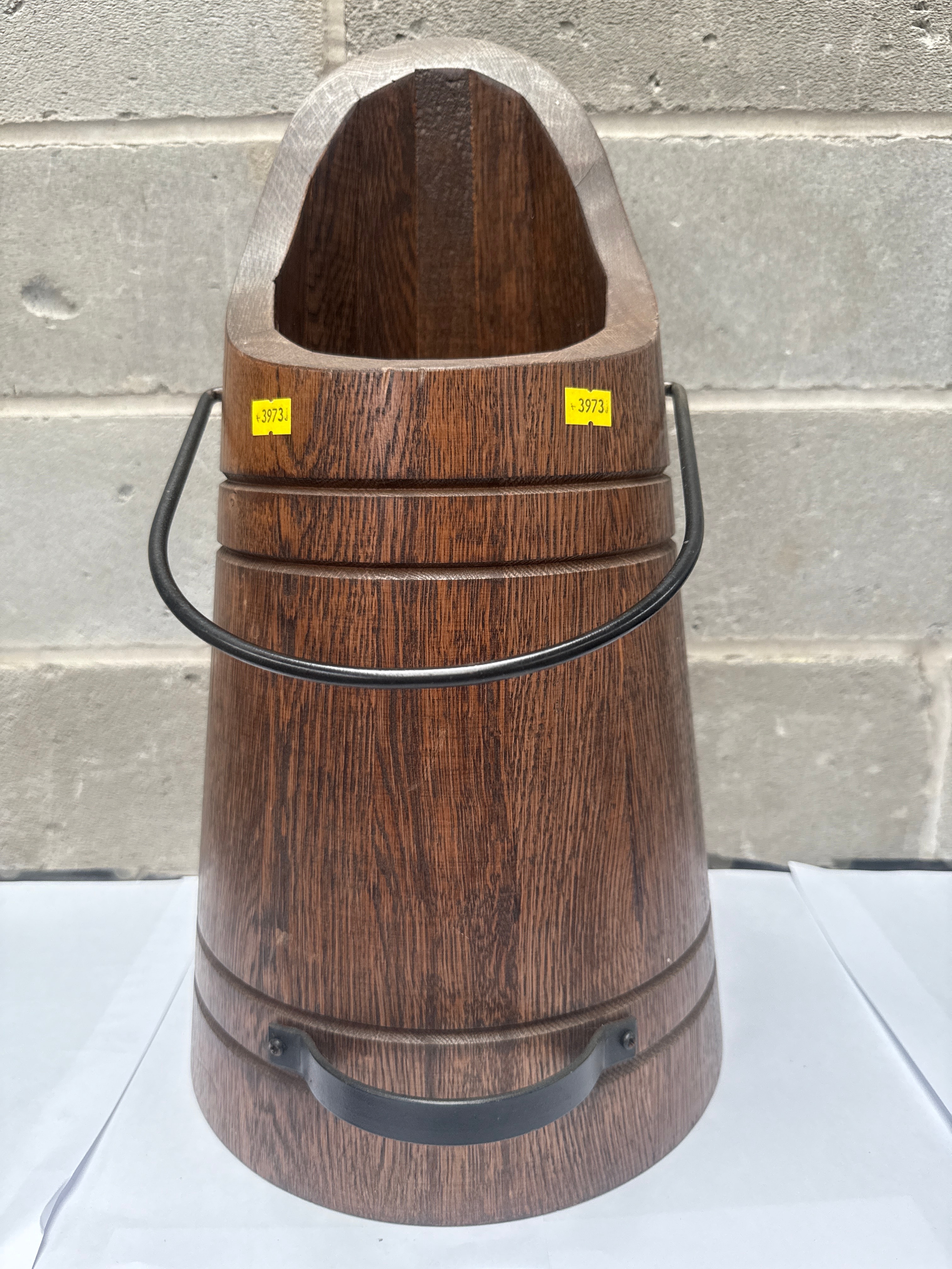 An Edwardian English oak stick stand, a dark-stained wooden vessel, with a rustic, traditional aesthetic. It features a distinctive angled top opening and a carved or constructed body that mimics staved construction with horizontal banding details. The primary material is wood, finished in a medium-to-dark brown tone that highlights the grain, complemented by a black metal swing handle and two fixed black metal bands secured to the lower portion. Three yellow rectangular stickers, each bearing the number “3973,” are affixed to the upper body.