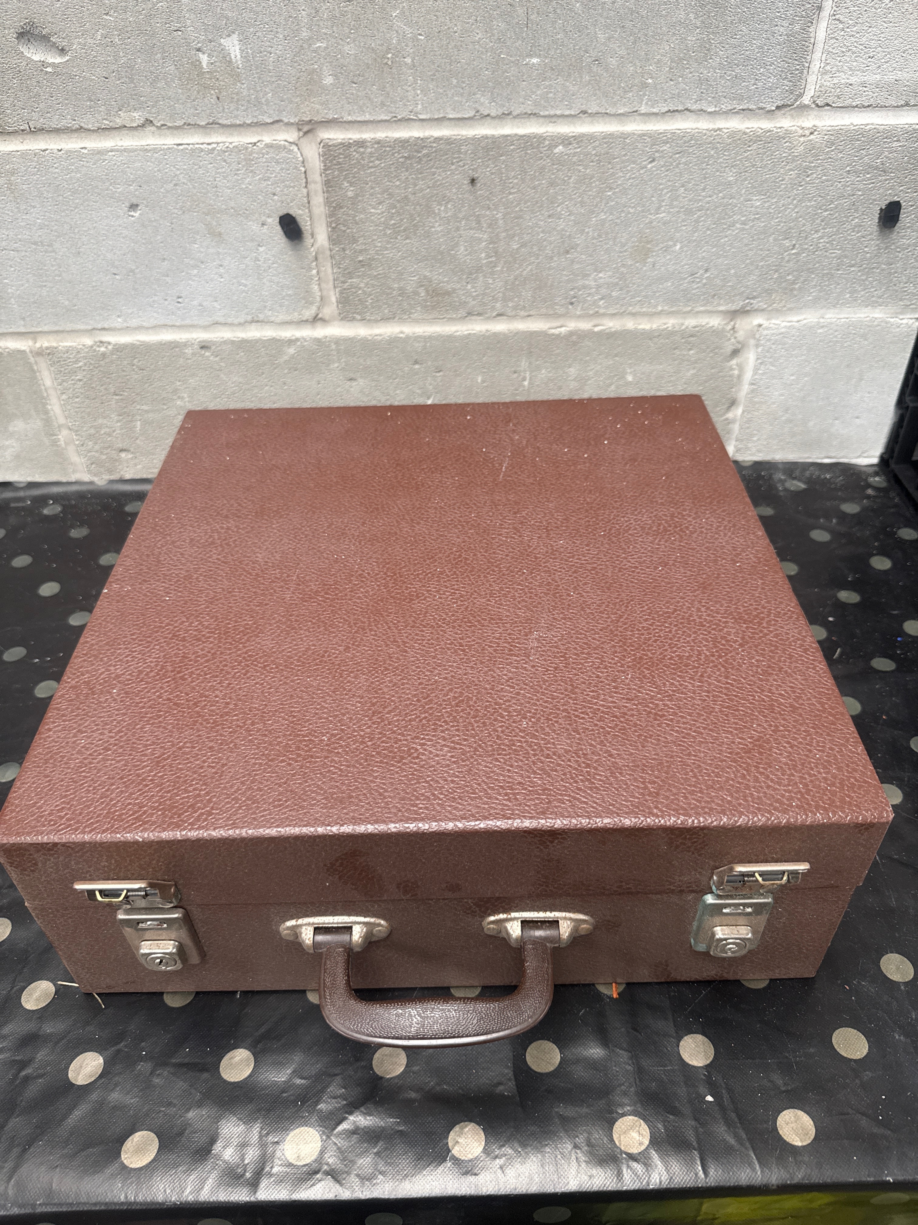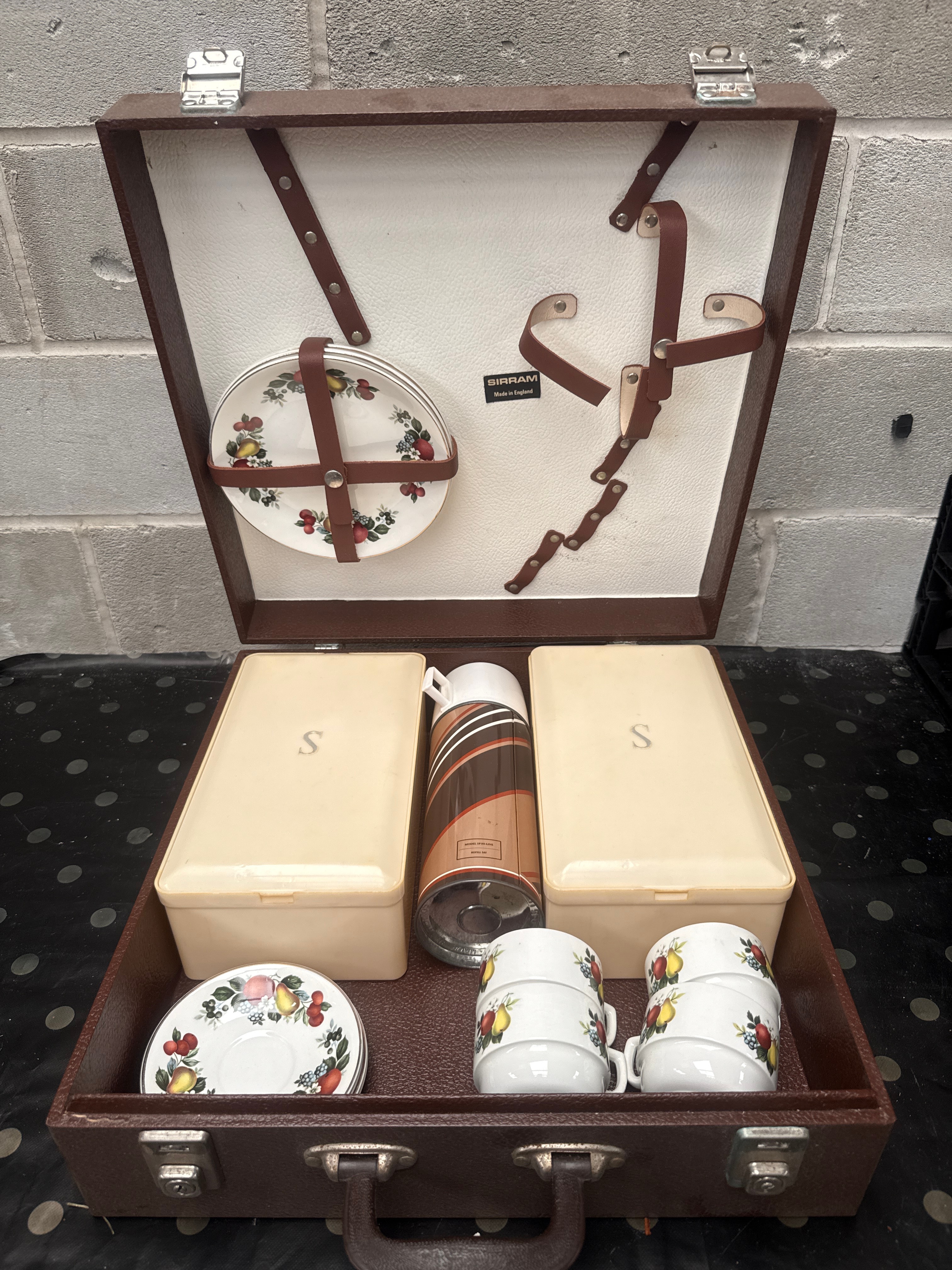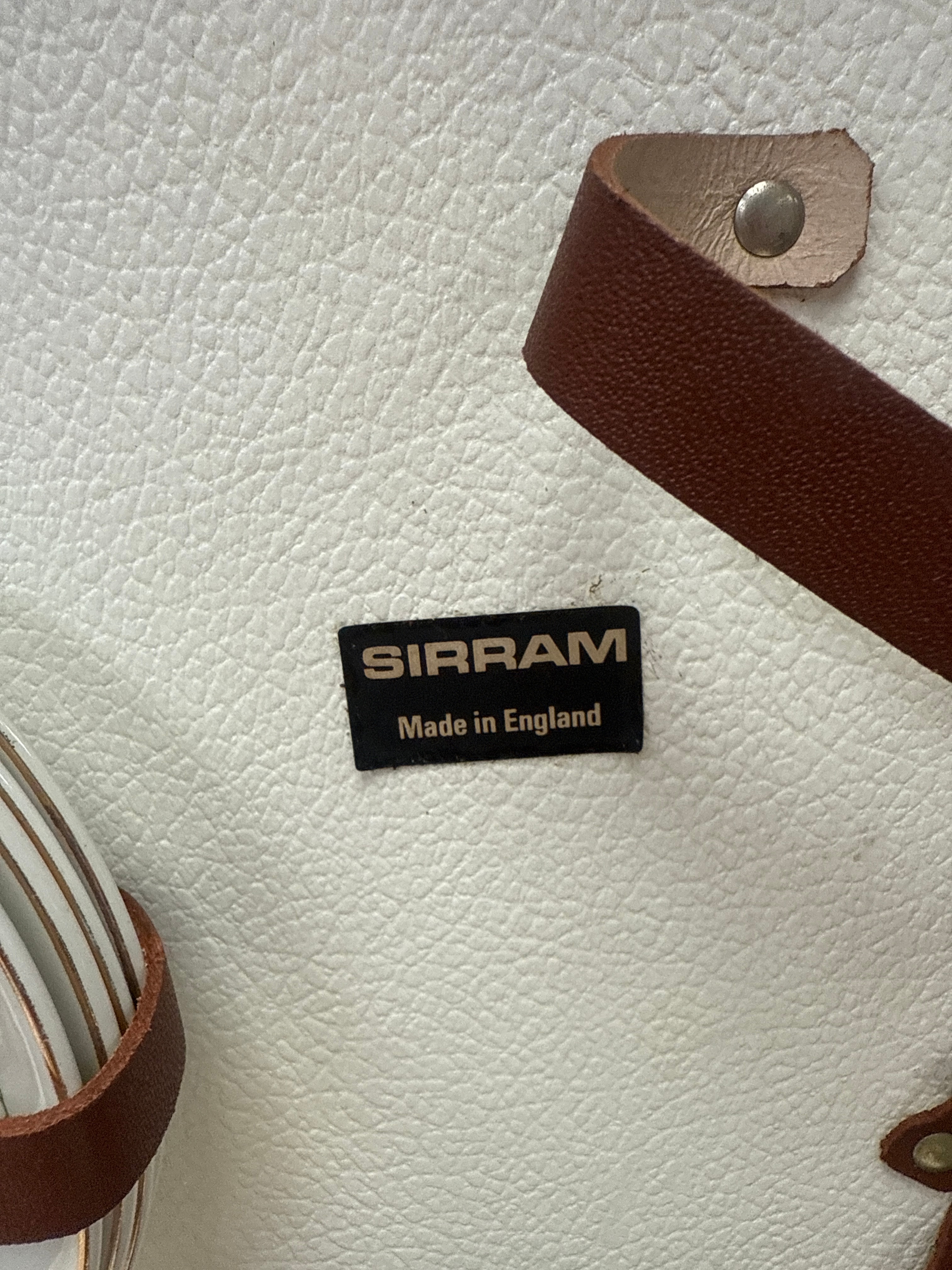 A vintage 1950s Brexton portable picnic or travel tea set. The set is housed within a rectangular, textured brown, possibly faux leather, case with metal clasps and a carrying handle. The interior of the case is lined with a white textured material and features brown leatherette straps. A black label inside the lid clearly states “SIRRAM” and “Made in England.” The set comprises a stack of four ceramic plates, each adorned with a multi-color fruit and floral motif. The lower compartment holds two cream-colored plastic storage boxes, embossed with an ‘S’ on their lids, a glass-lined thermos with a brown and cream striped exterior, and two stacks of two matching ceramic cups (total of four cups).